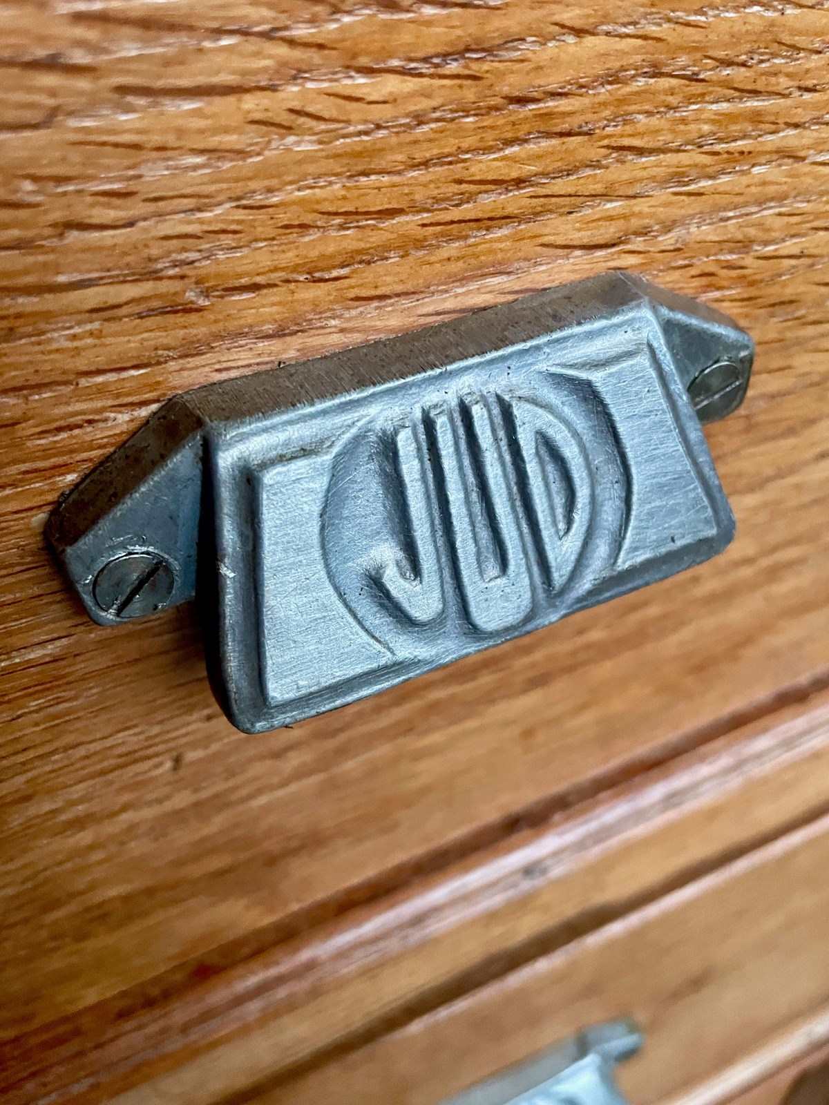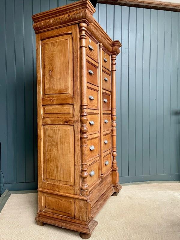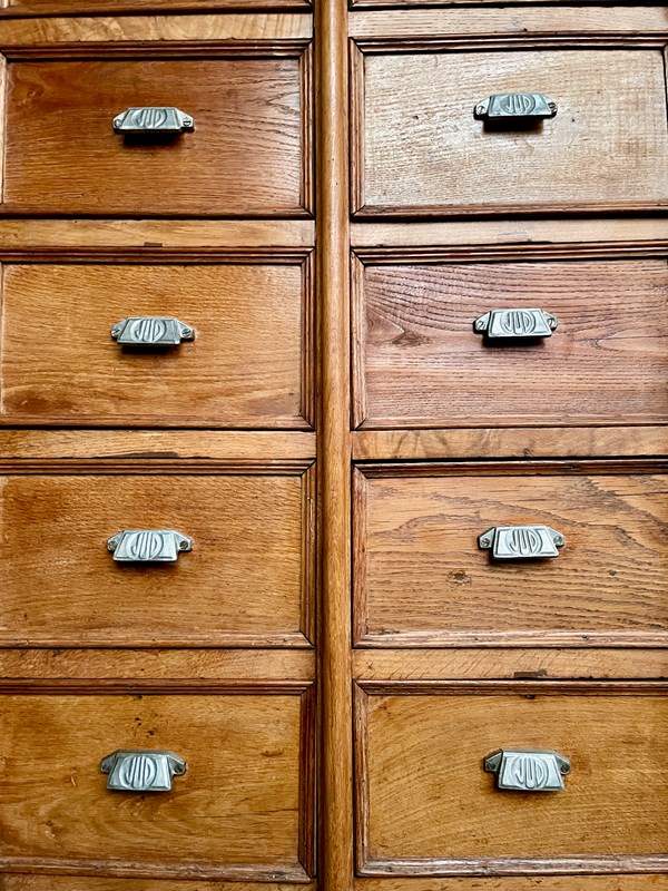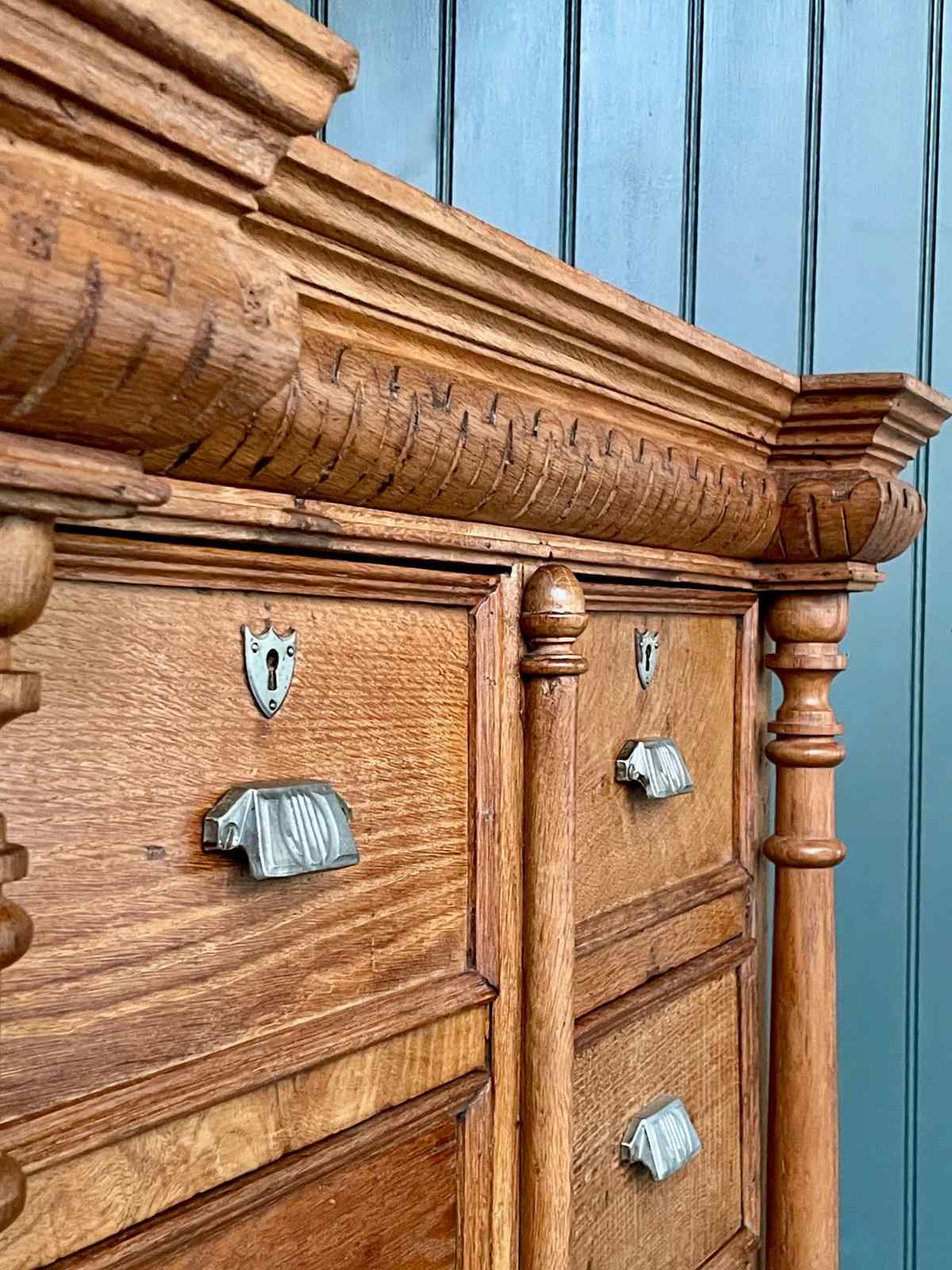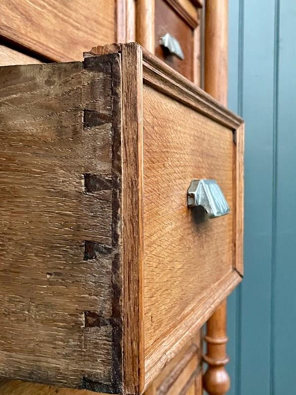 A really handsome oak shop-keeper’s chest of drawers from a Belgian store. Some lovely almost architectural details, such as the heavily moulded plinth and cornice, and unusual turned columns to each side. The twelve drawers all have cast alloy handles bearing the letters JUD, and the upper two still retain the original escutcheons, although the locks are no longer present. A good colour throughout, and with patination and wear consistent with age. The internal drawer measurements are: H: 16.5cm W: x 31.5cm x D: 32cm. A striking and useful piece, with a relatively small footprint that would work well in any number of settings.