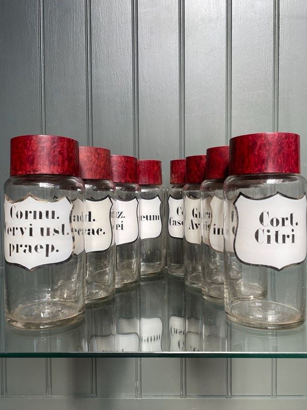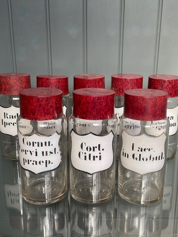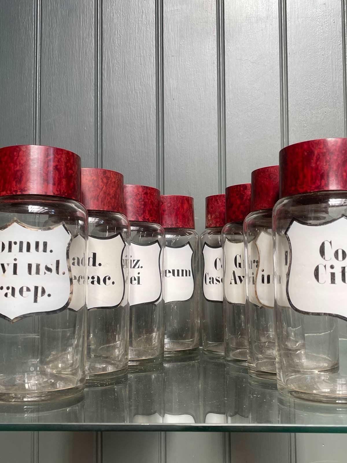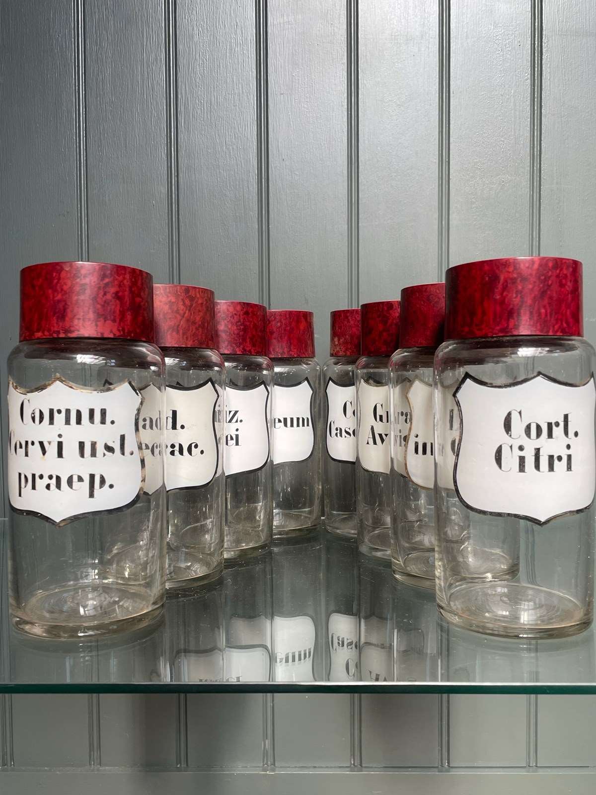 A stunning set of eight apothecary bottles, all with their original beautiful bakelite tops. Immaculate vintage condition, with no knocks or chips to either the glass or the tops. The lettering to the bottles shows just the lightest of wear consistent with age. Price is for the set of eight.