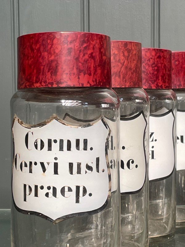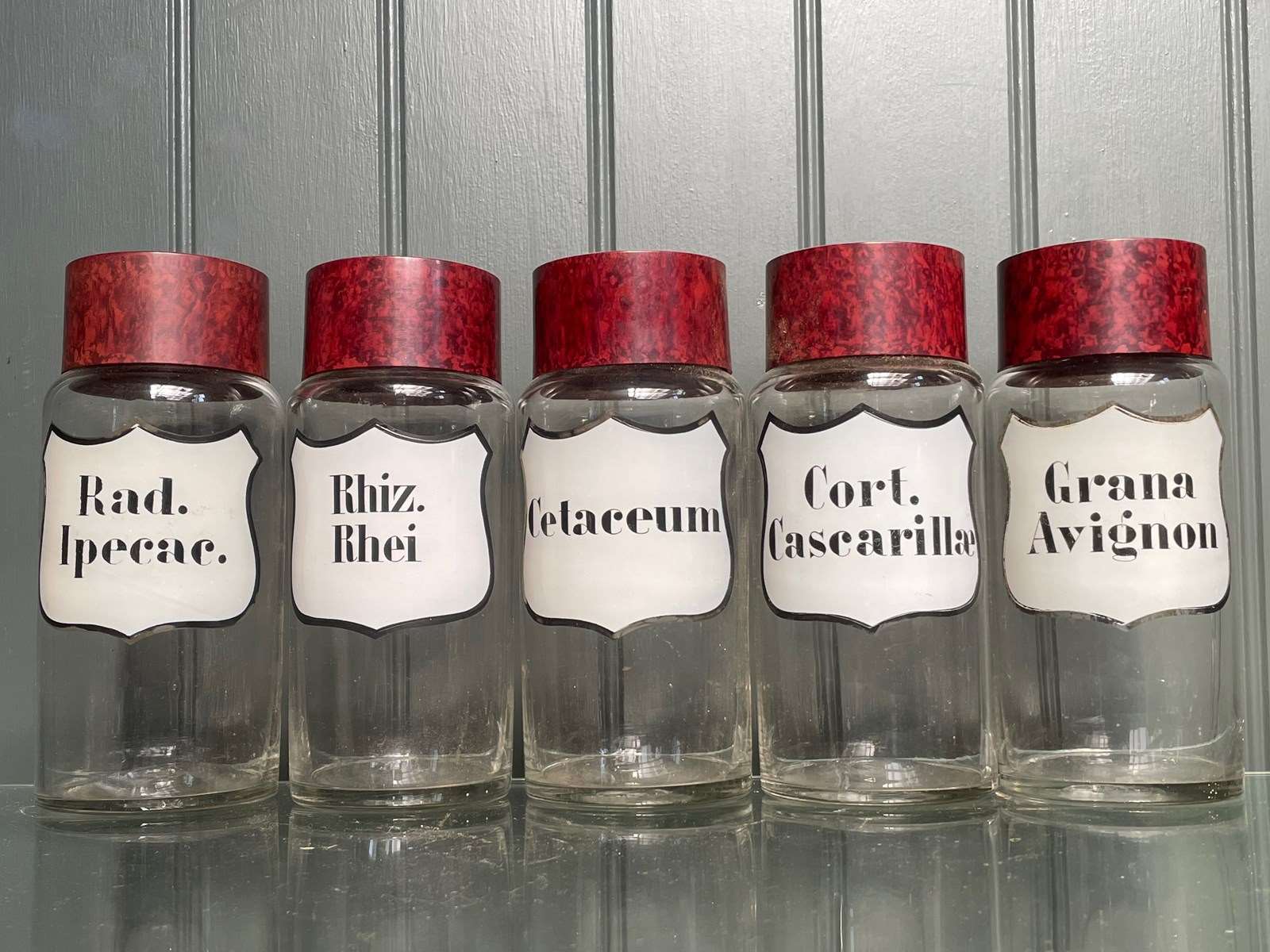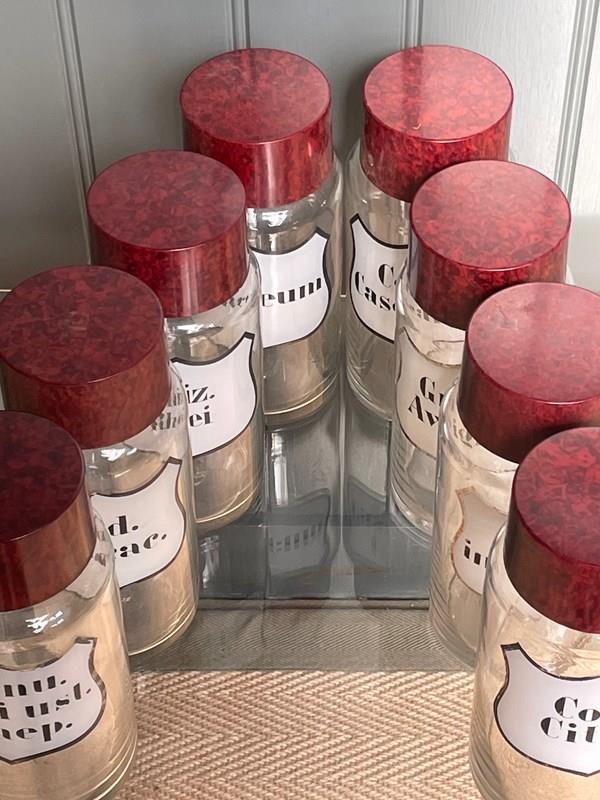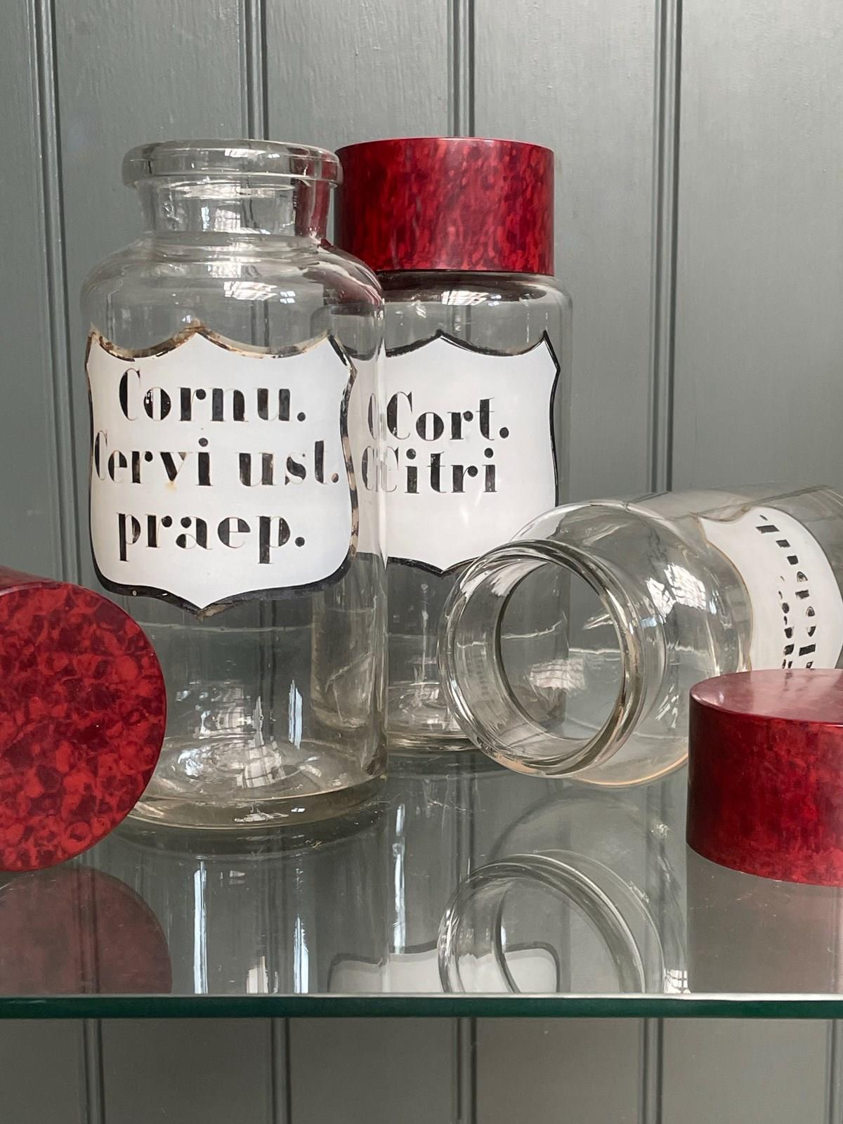 A stunning set of eight apothecary bottles, all with their original beautiful bakelite tops. Immaculate vintage condition, with no knocks or chips to either the glass or the tops. The lettering to the bottles shows just the lightest of wear consistent with age. Price is for the set of eight.