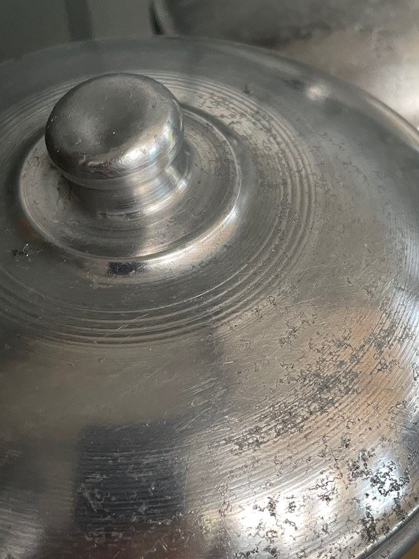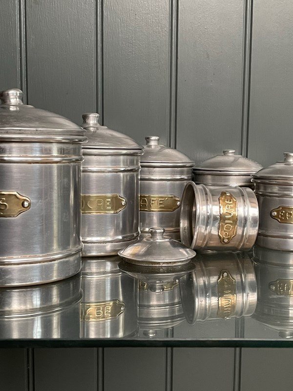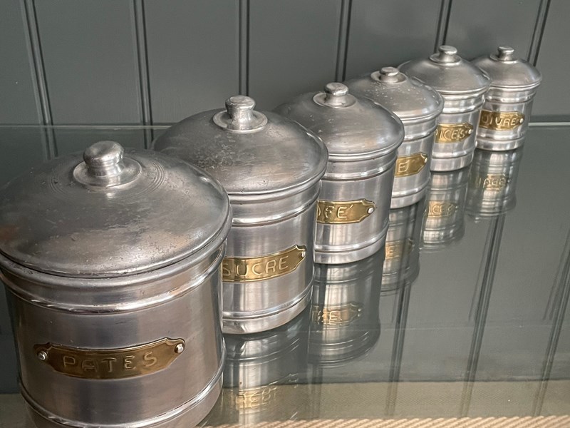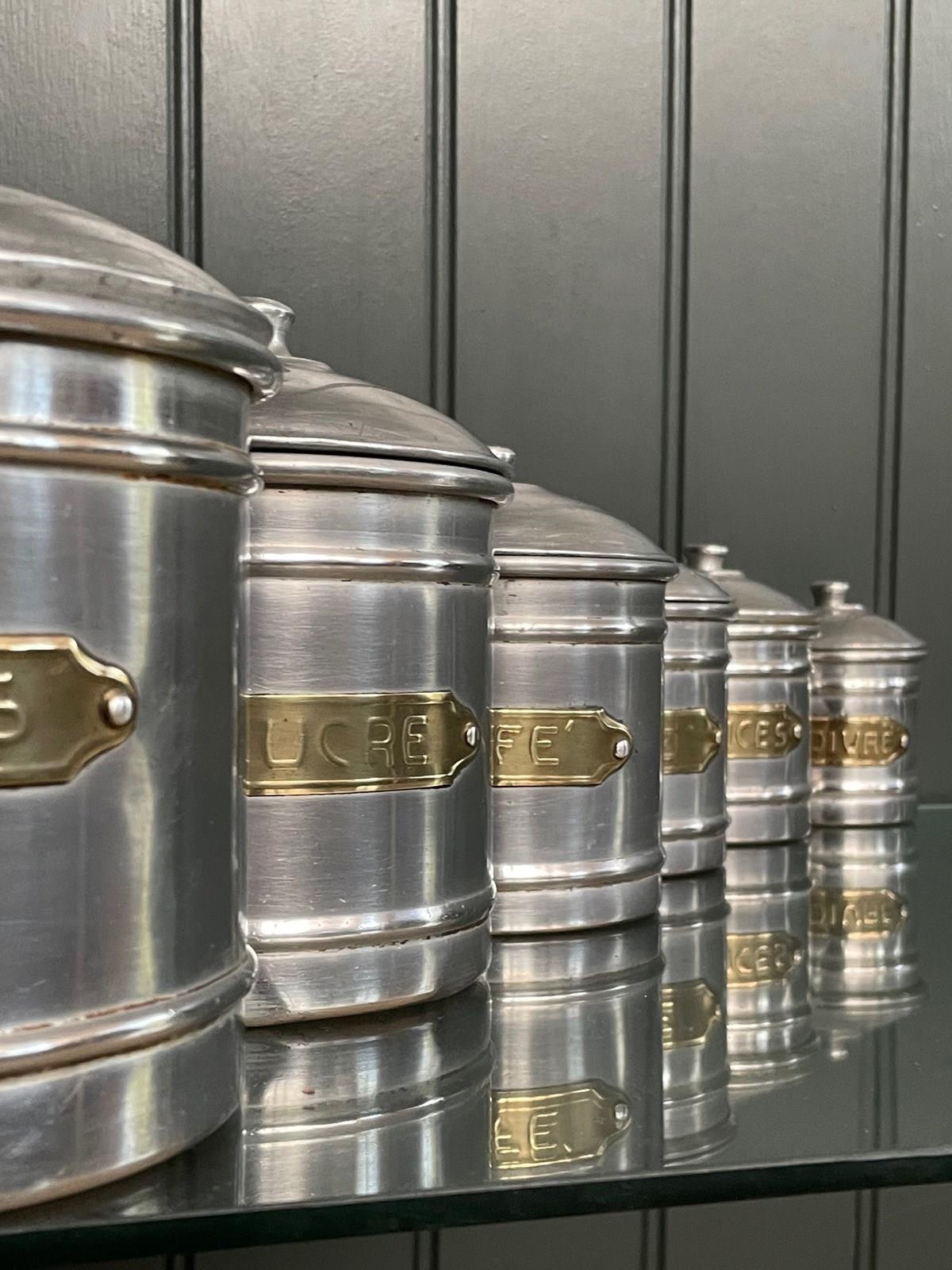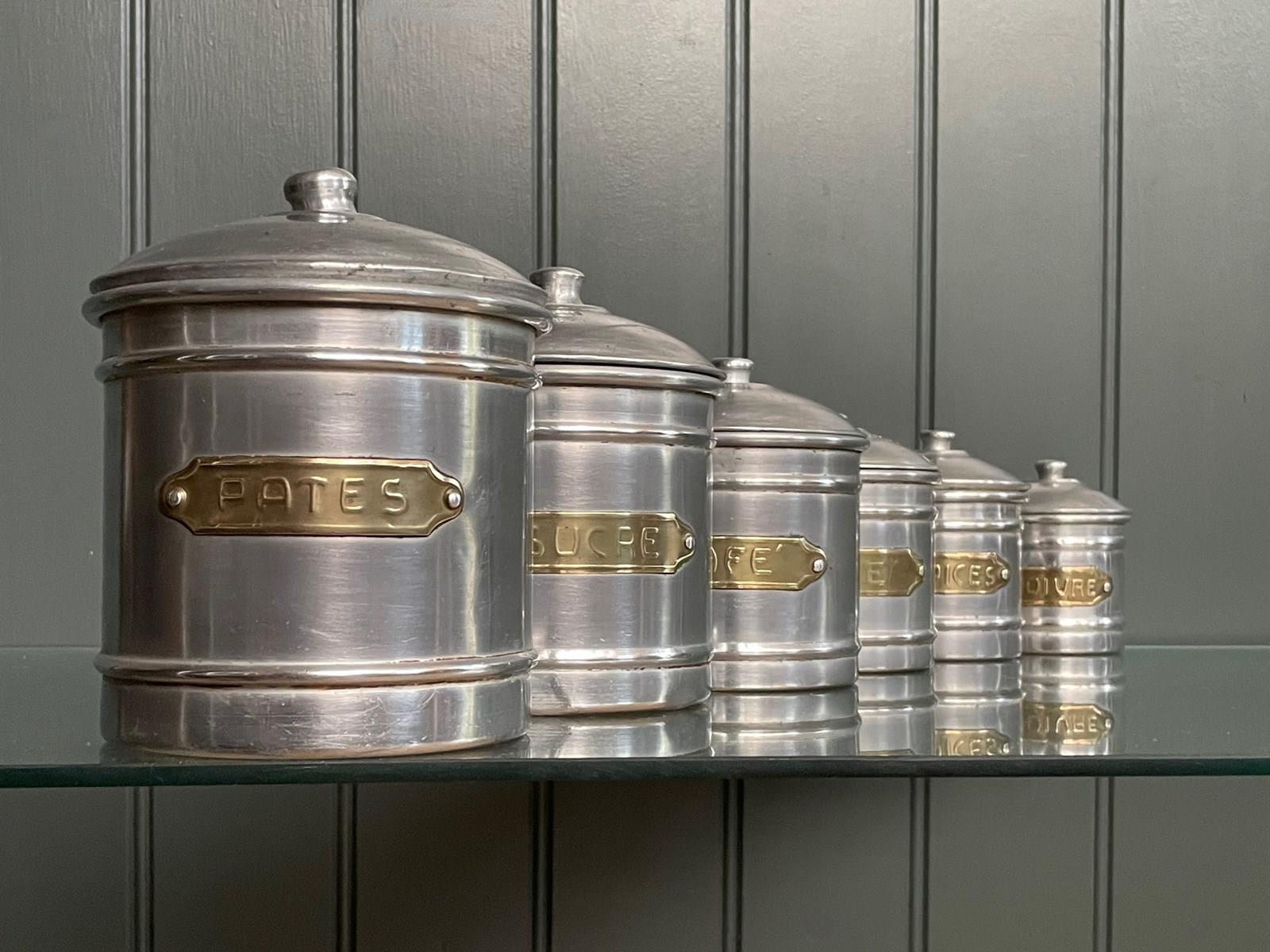 Set of six French aluminium storage canisters, with brass labels to the fronts. Lovely vintage condition with light wear consistent with age, including a little pitting to the tops. They fit inside themselves like Russian dolls for ease of posting. Dimensions given are for the largest.
