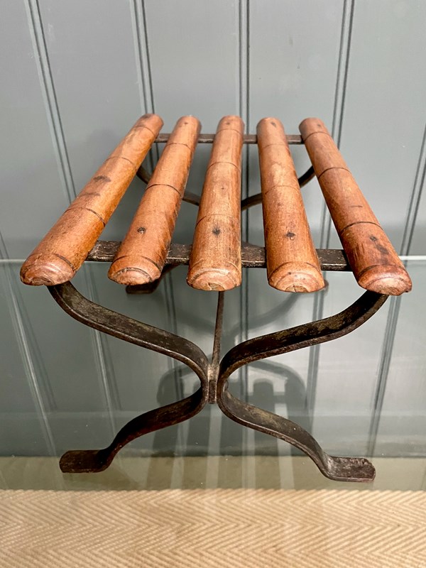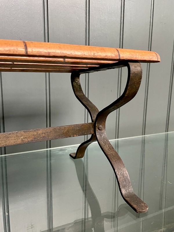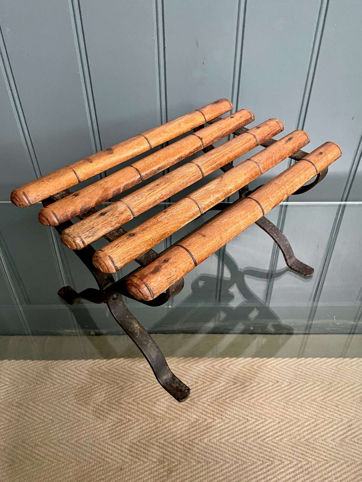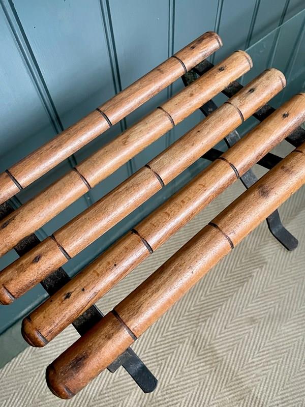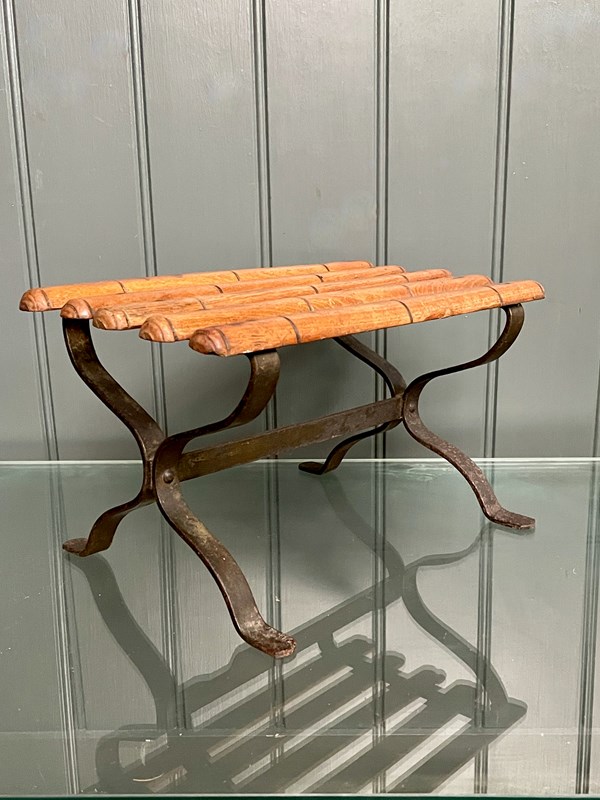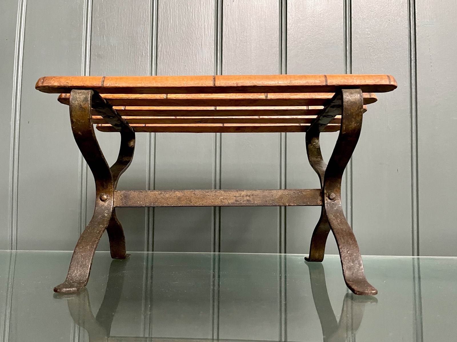 An unusual small low stool with ‘faux-bamboo’ beech slats above a simple riveted x-frame base. Lovely original condition, with nice patination to both the steel and the wood.