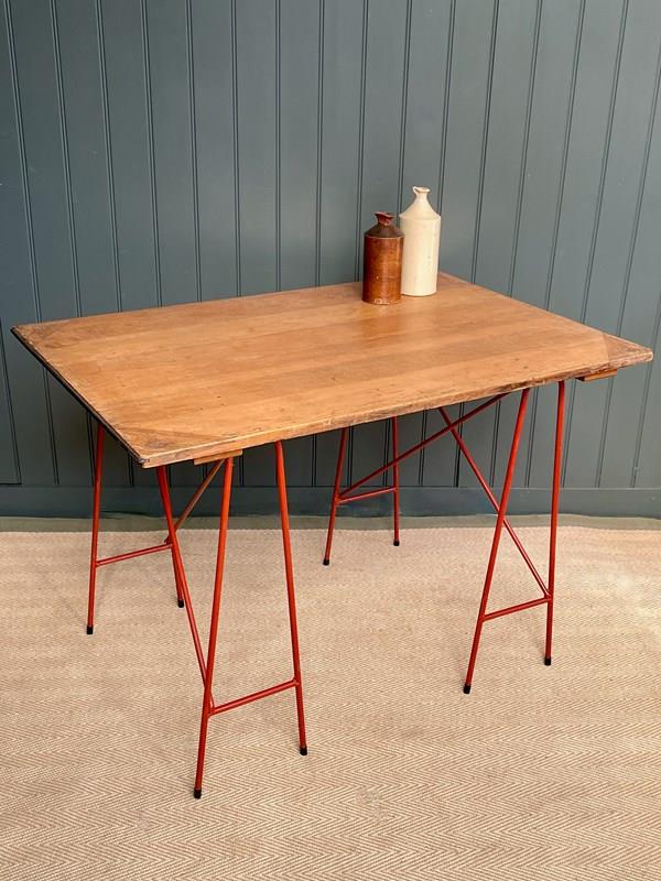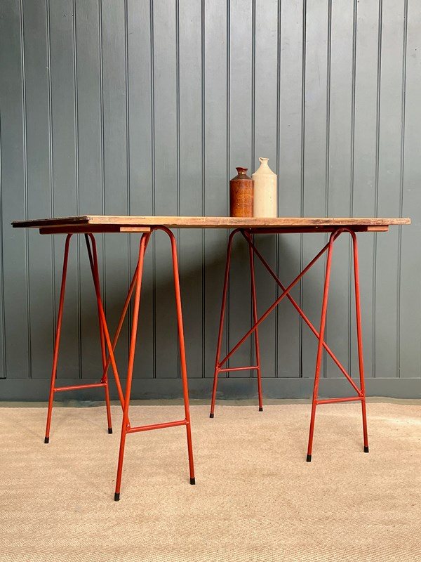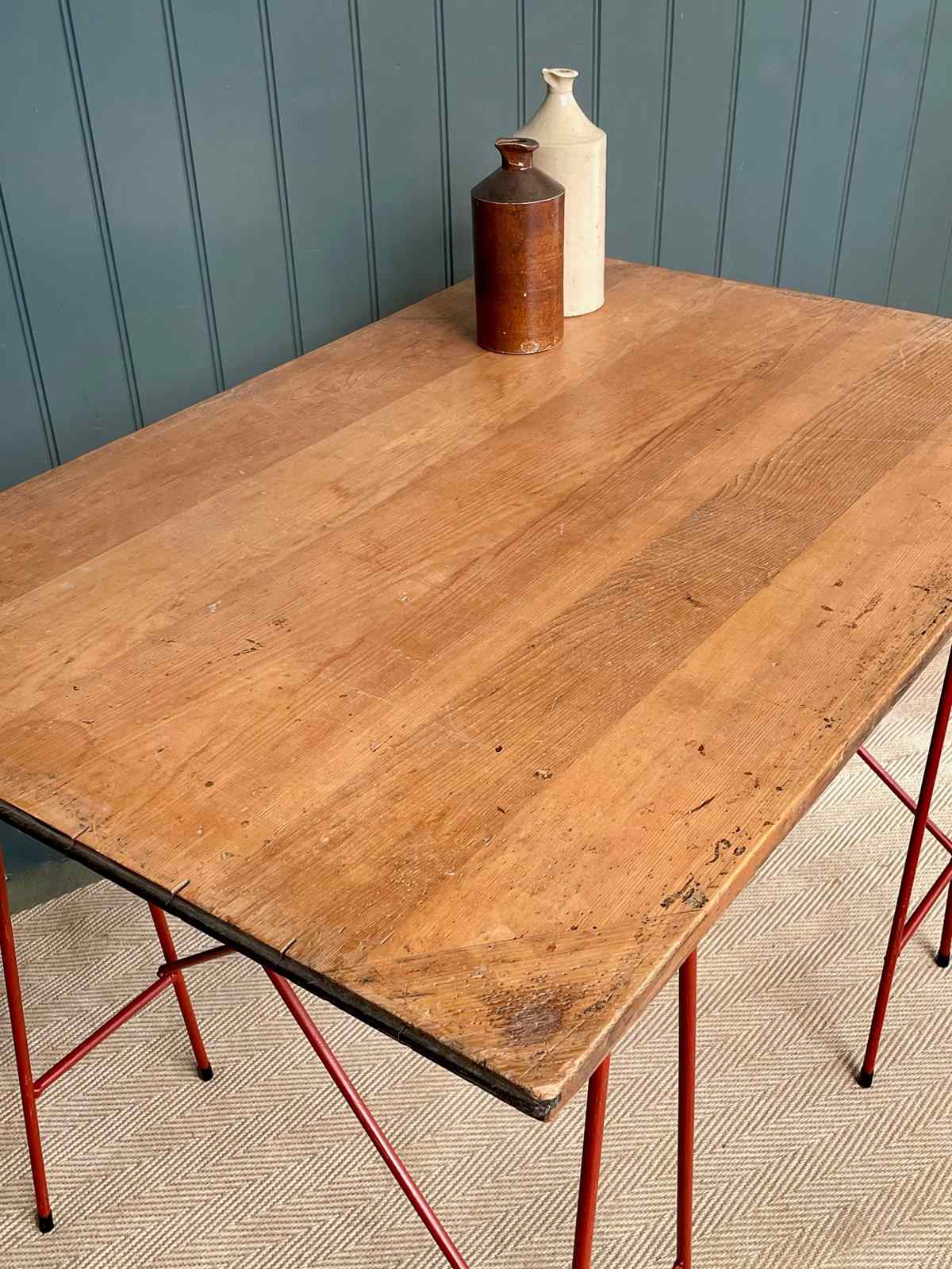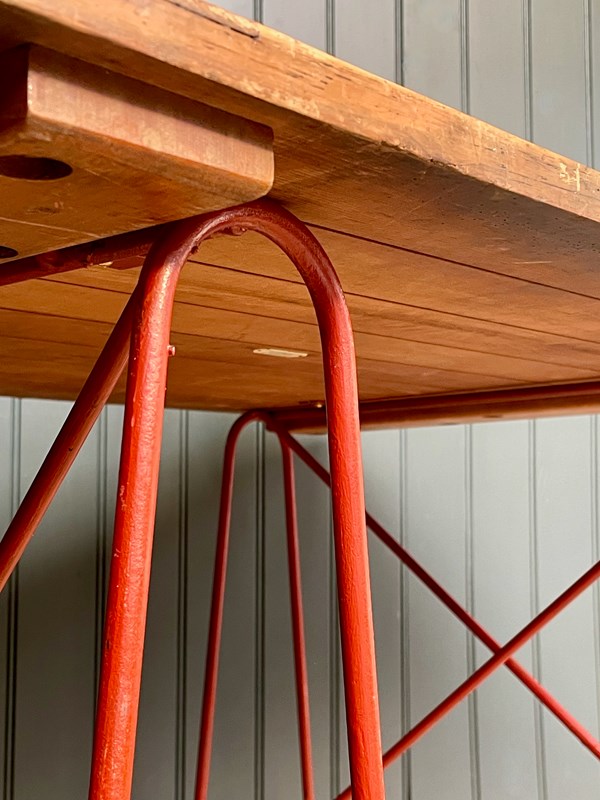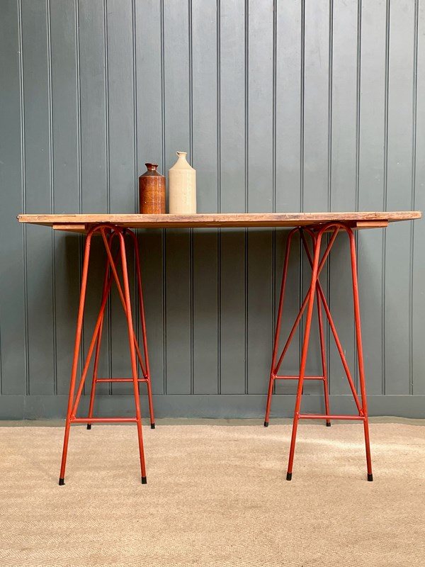 A lovely simple English vintage table, with an engineered pine top, above two steel trestle legs. The top is made of pine boards, with perfectly tight joints, and pleasing quarters to the four corners, and is secured to the steel legs, finished in a nice rust-coloured paint, and with protective feet to all eight feet. Light wear consistent with age, and a maker’s label to the underside of the top. A great work table for a studio, but would work well in a retail situation also, or even as a dining table in a compact flat. The distance between the legs at the floor is 38cm.