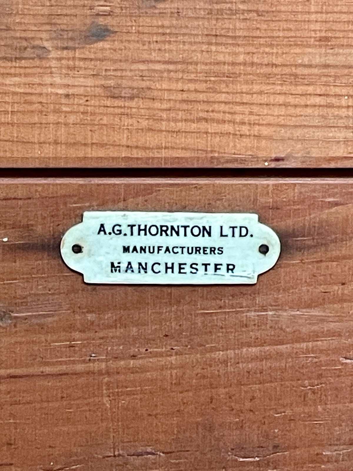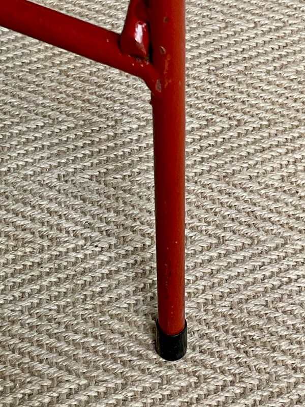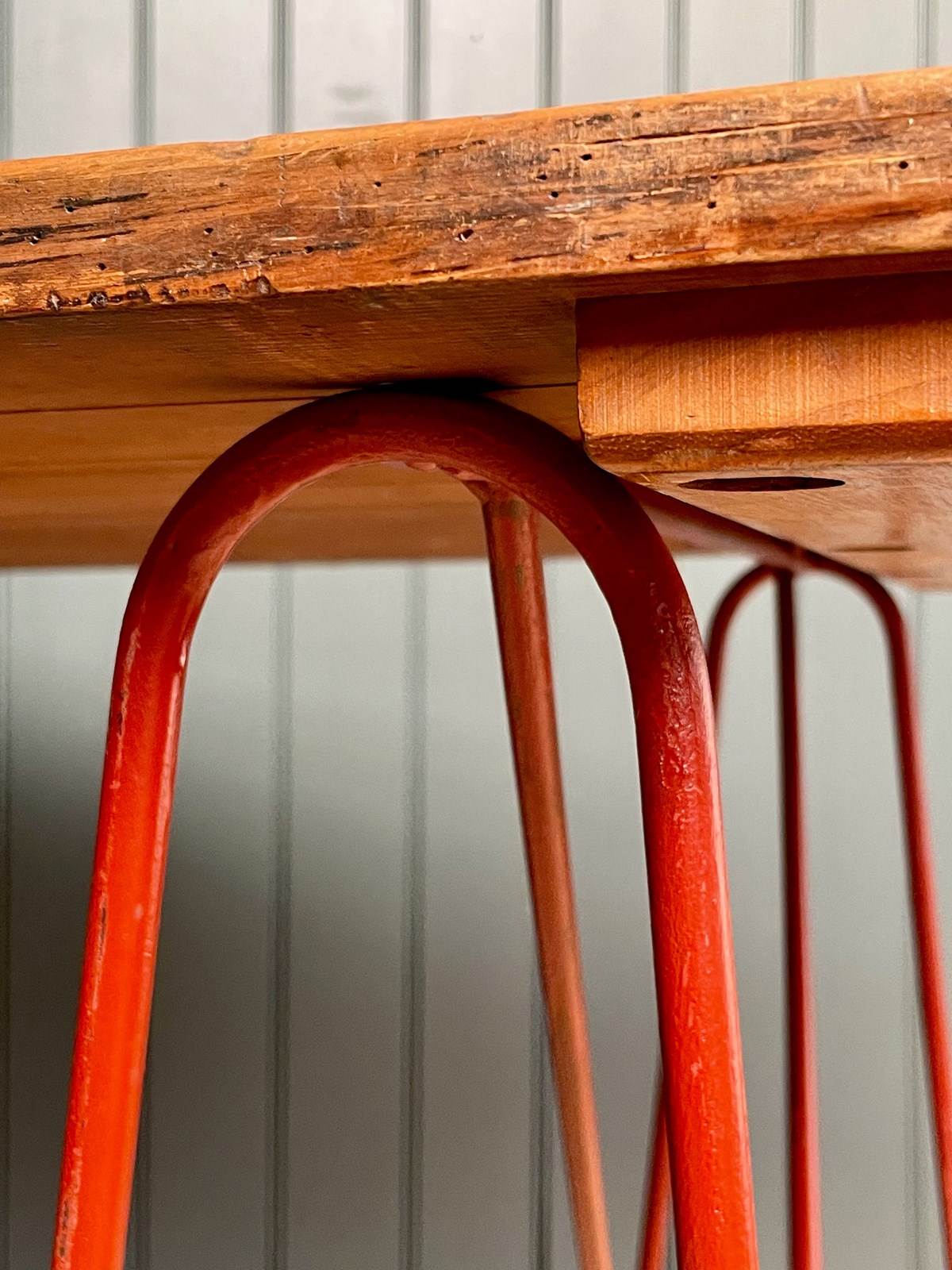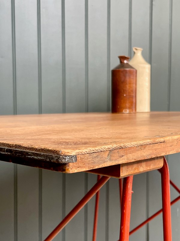 A lovely simple English vintage table, with an engineered pine top, above two steel trestle legs. The top is made of pine boards, with perfectly tight joints, and pleasing quarters to the four corners, and is secured to the steel legs, finished in a nice rust-coloured paint, and with protective feet to all eight feet. Light wear consistent with age, and a maker’s label to the underside of the top. A great work table for a studio, but would work well in a retail situation also, or even as a dining table in a compact flat. The distance between the legs at the floor is 38cm.