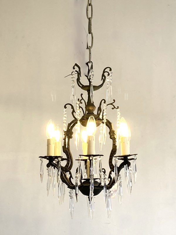 A very pretty and delicate antique brass birdcage frame with 6 arms and a central bulb. The frame is dressed with crystal icicles suspended on glass beads, creating an elegantly understated light.