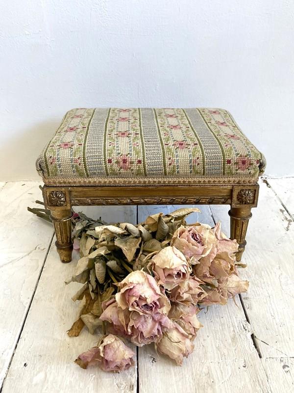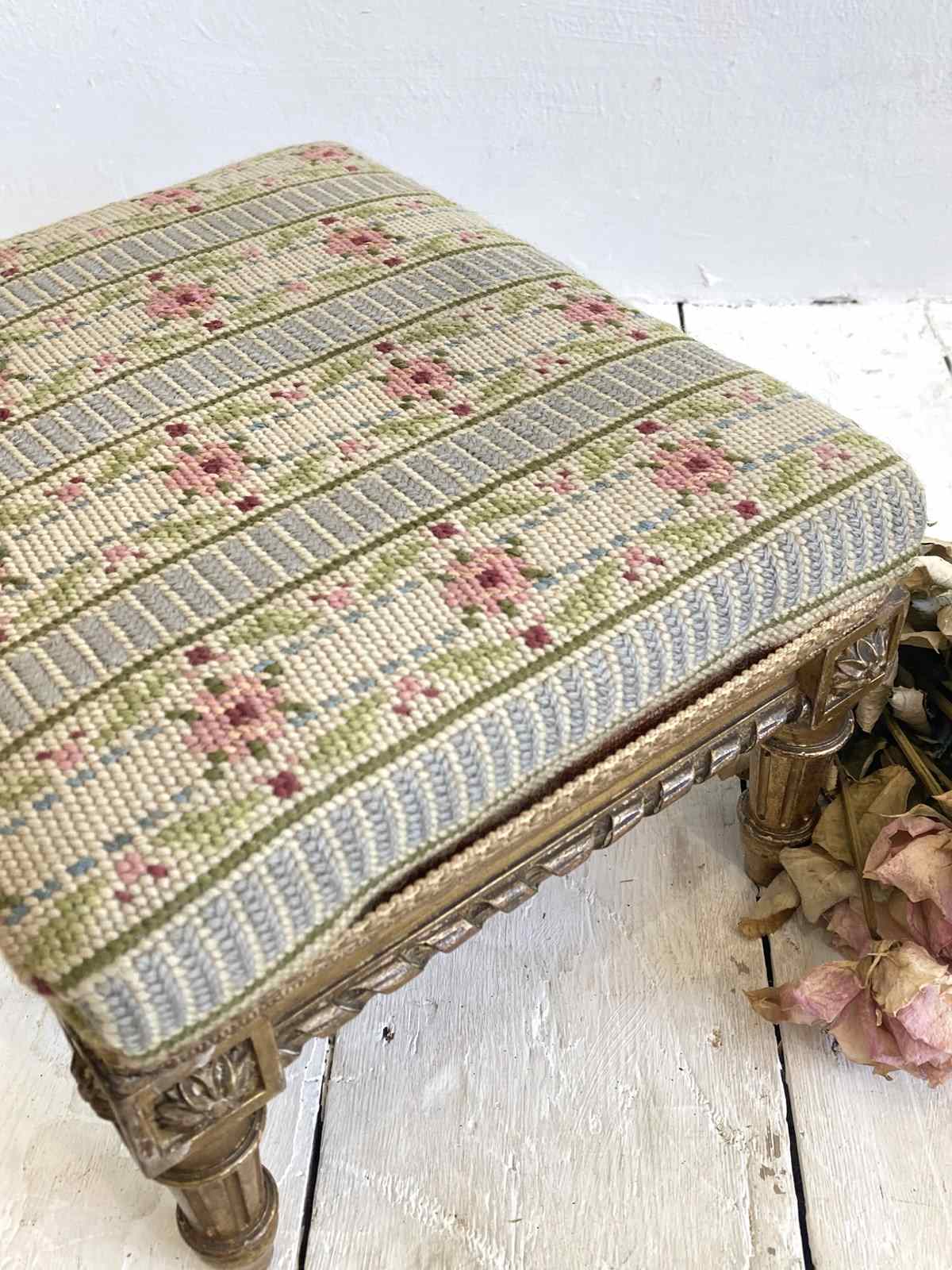The sweetest little antique French footstool - it's just so pretty! The frame is handcarved and gilded with traditional reeded legs and decorative patera in the corners; the top is covered in a lovely needle crafted design in pale blue, soft green and pink. The webbing underneath could do with a couple of stitches (see pic) otherwise this is in good antique condition.