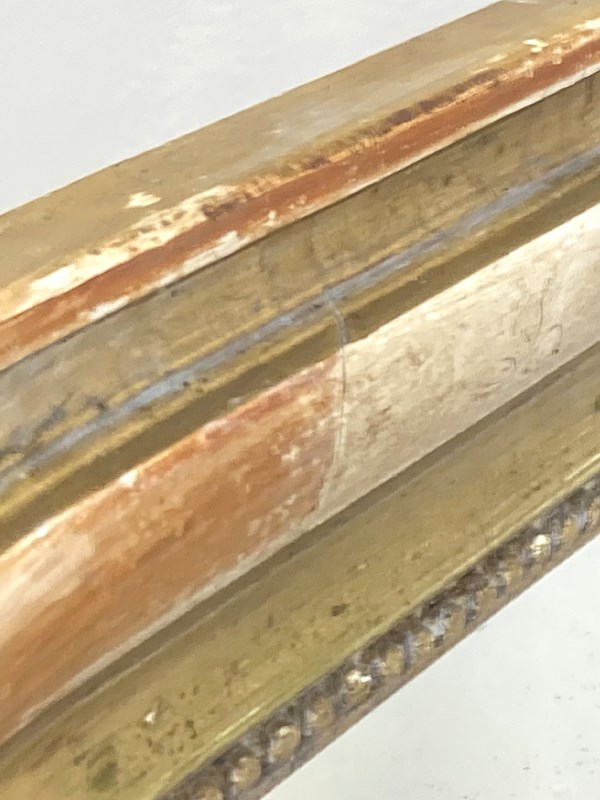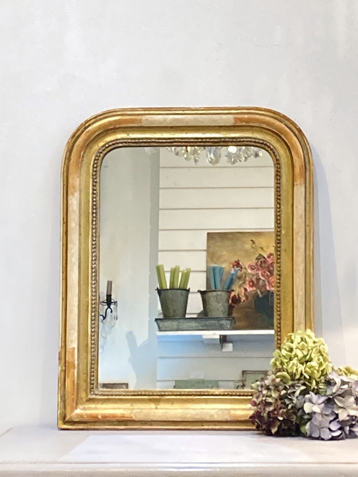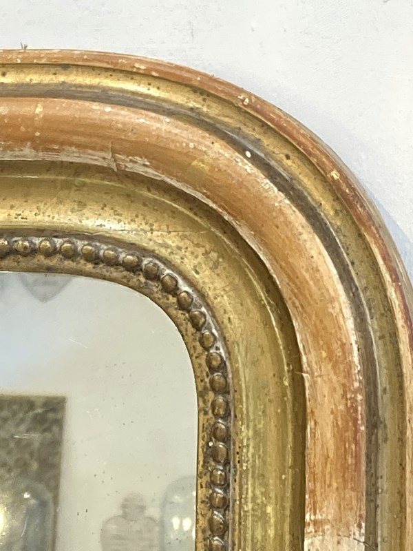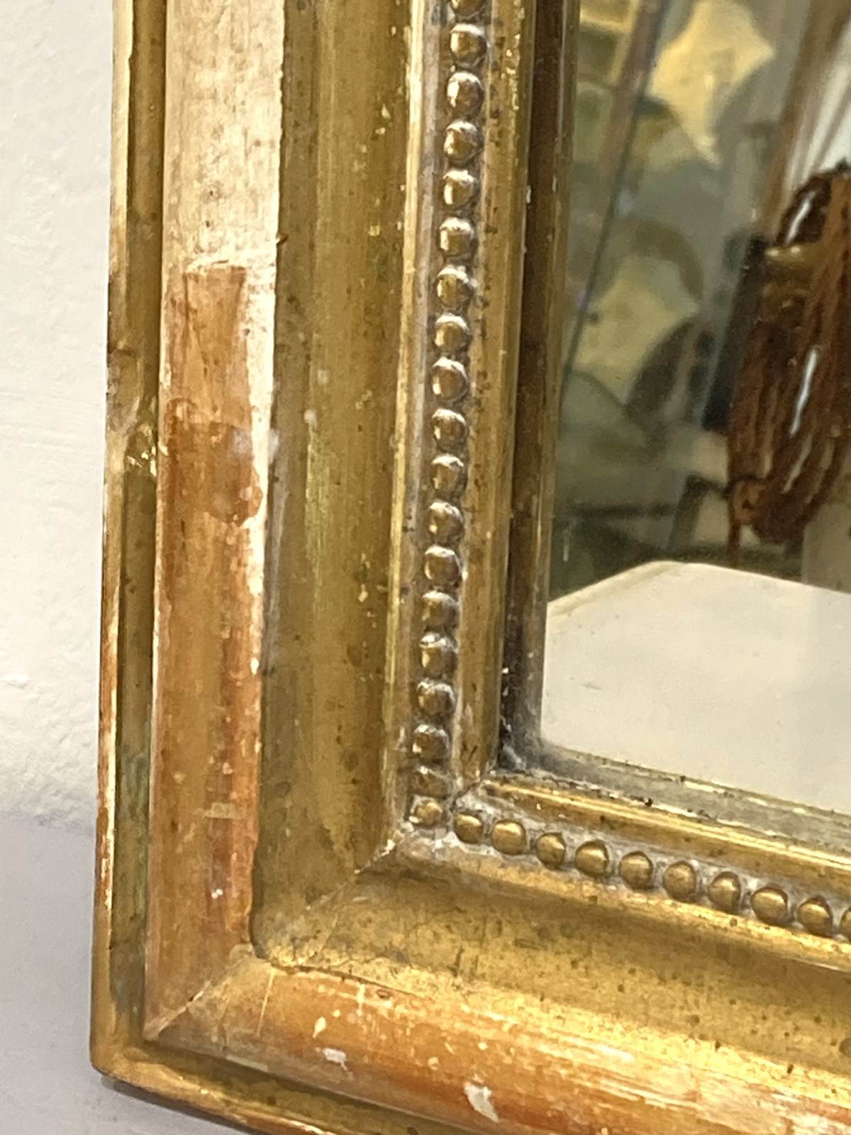 A lovely little C19th French Louis Philippe mirror with original gilded frame, glass and backing. The frame has a gilt outer, beaded inner and alternating whitish and brown patterned middle which creates an attractive warm, authenticly French feel.