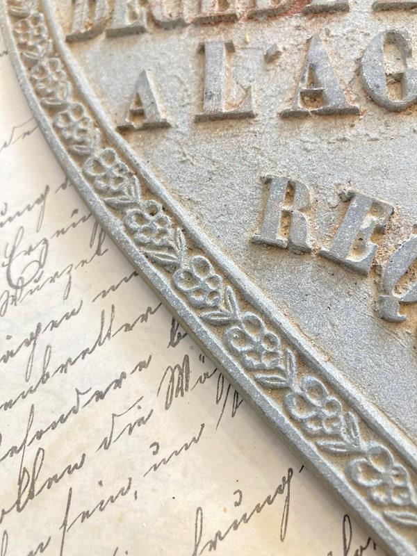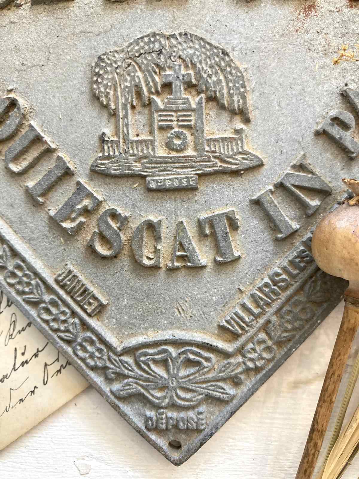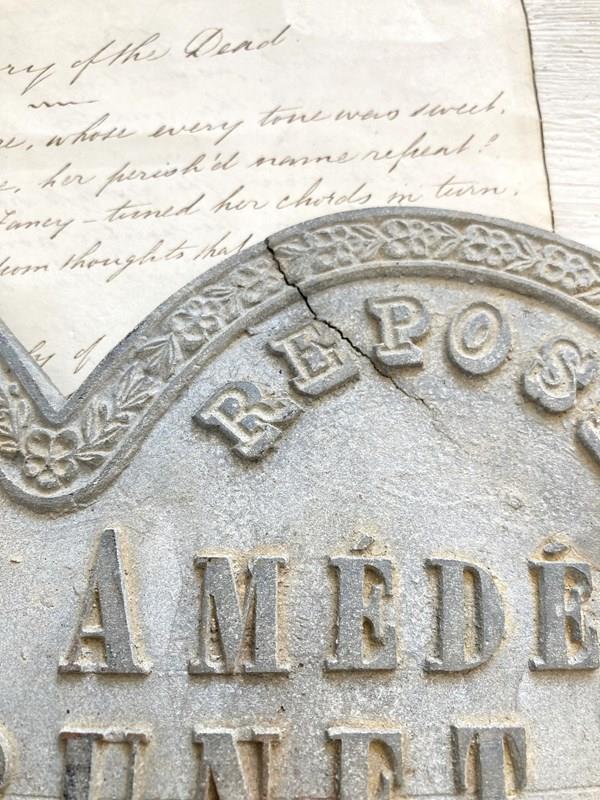 A wonderful old French memorial plaque in the shape of a heart with very pretty cast flowers running around the border. Dedicated to Pierre Amedee de Brunet who died in 1890 this is made from cast zinc and has an old crack in the top hand right corner as shown but the size and design more than made up for it; there a three holes for wall mounting if desired.