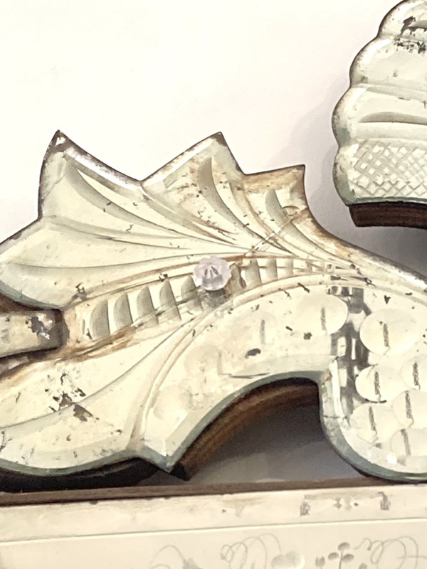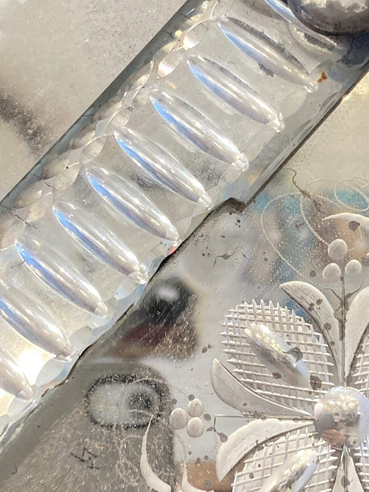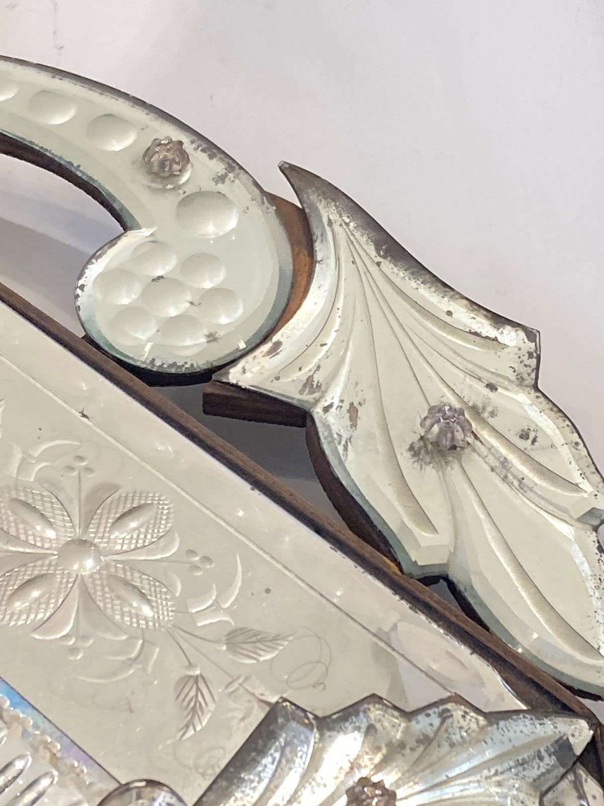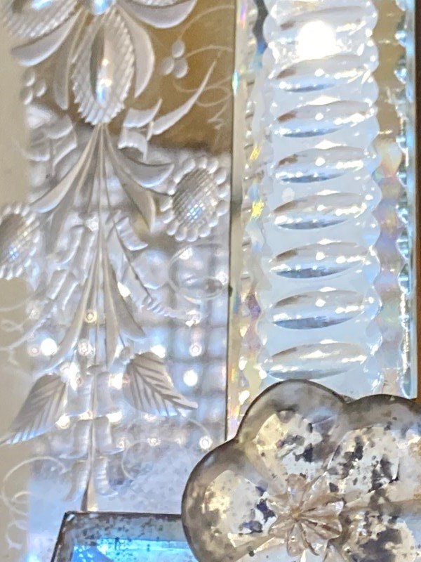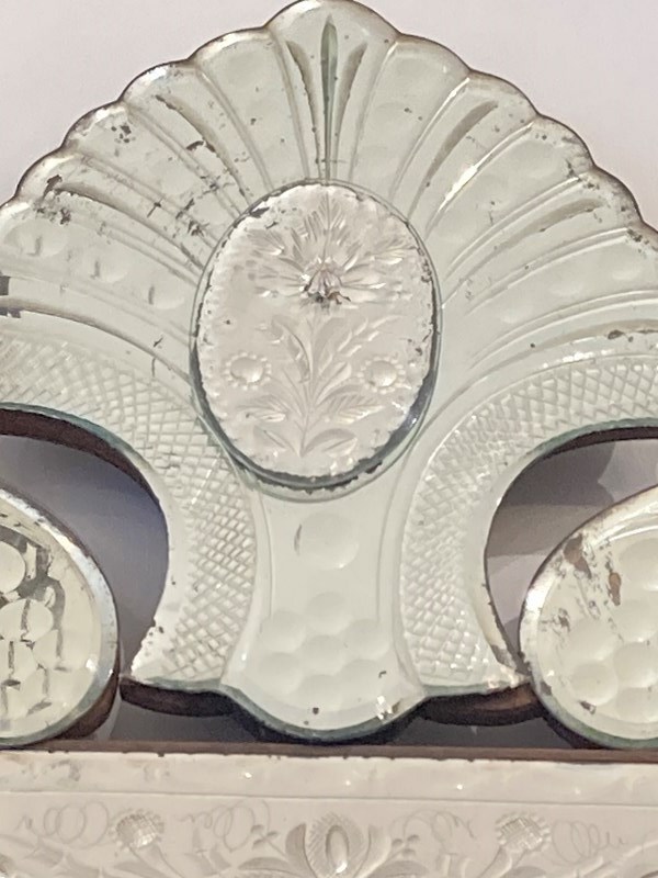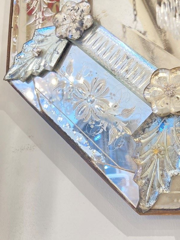 This is genuinely one of the most stunning antique Venetian mirrors we've ever had - it's not perfect; there's a repair (pic one) an old crack (pic two) and a small area of missing glass (pic three). However... if you can accept that, this has so much going on with intricate bevelling, reverse ground optics, cut mirrored flowers and engraved decoration, all starting to beautifully fox. It has plenty of genuine age (judging from the back is late C19th) and is of outstanding quality - th.is would have been an incredibly expensive mirror to produce and shows a huge range in the makers skills. Beautiful, unusual and highly decorative.