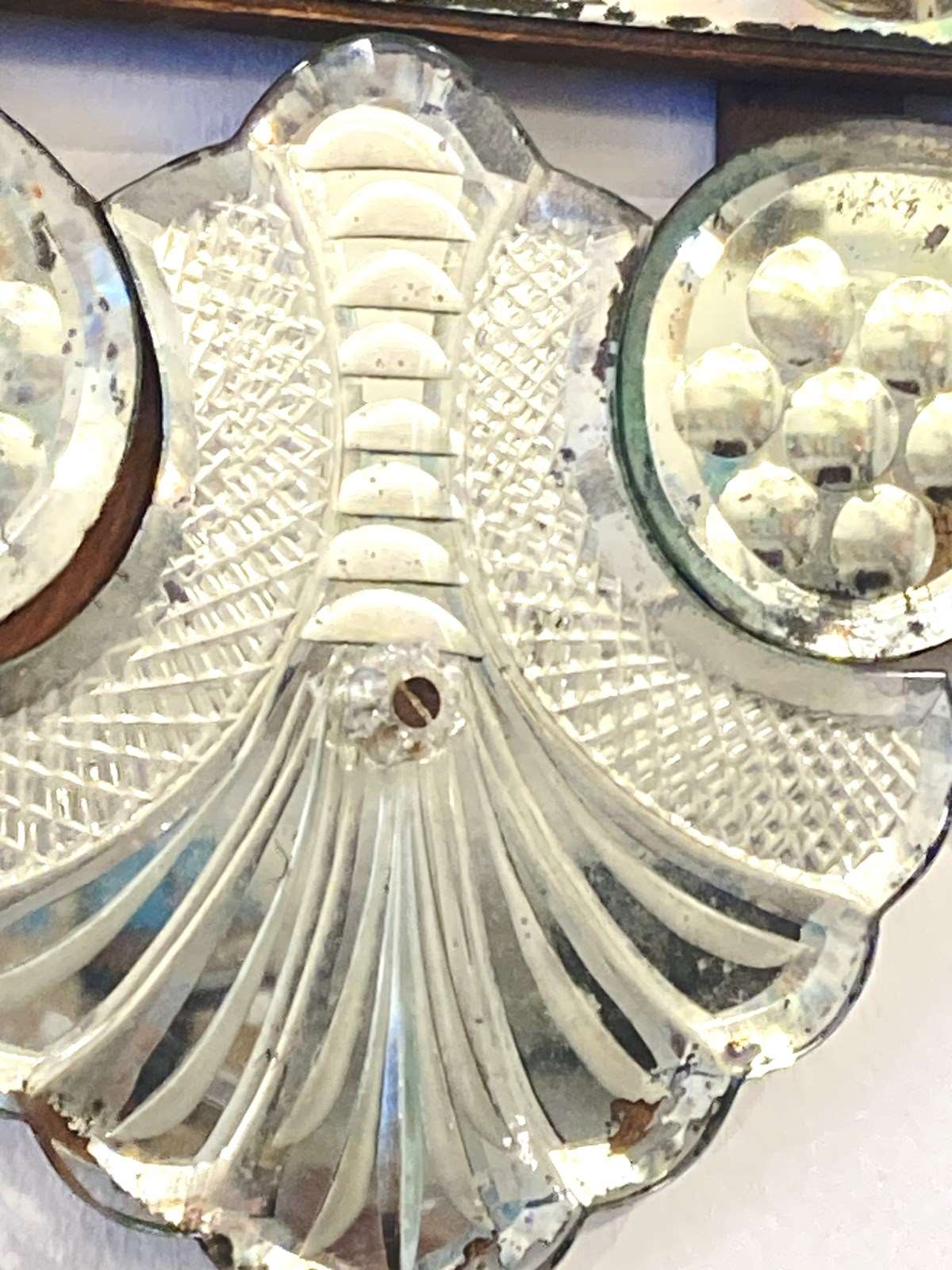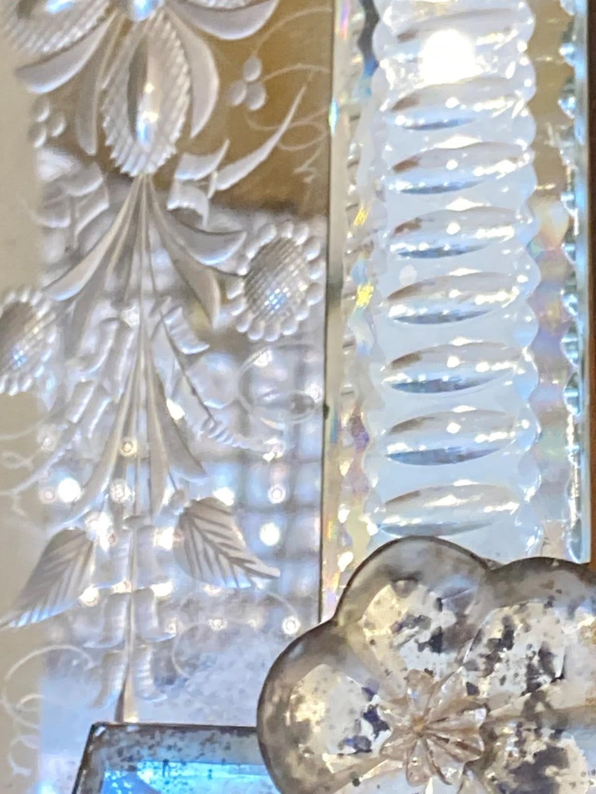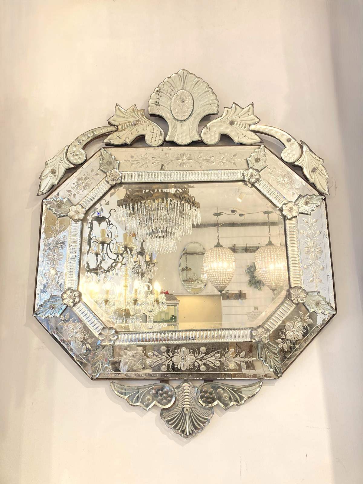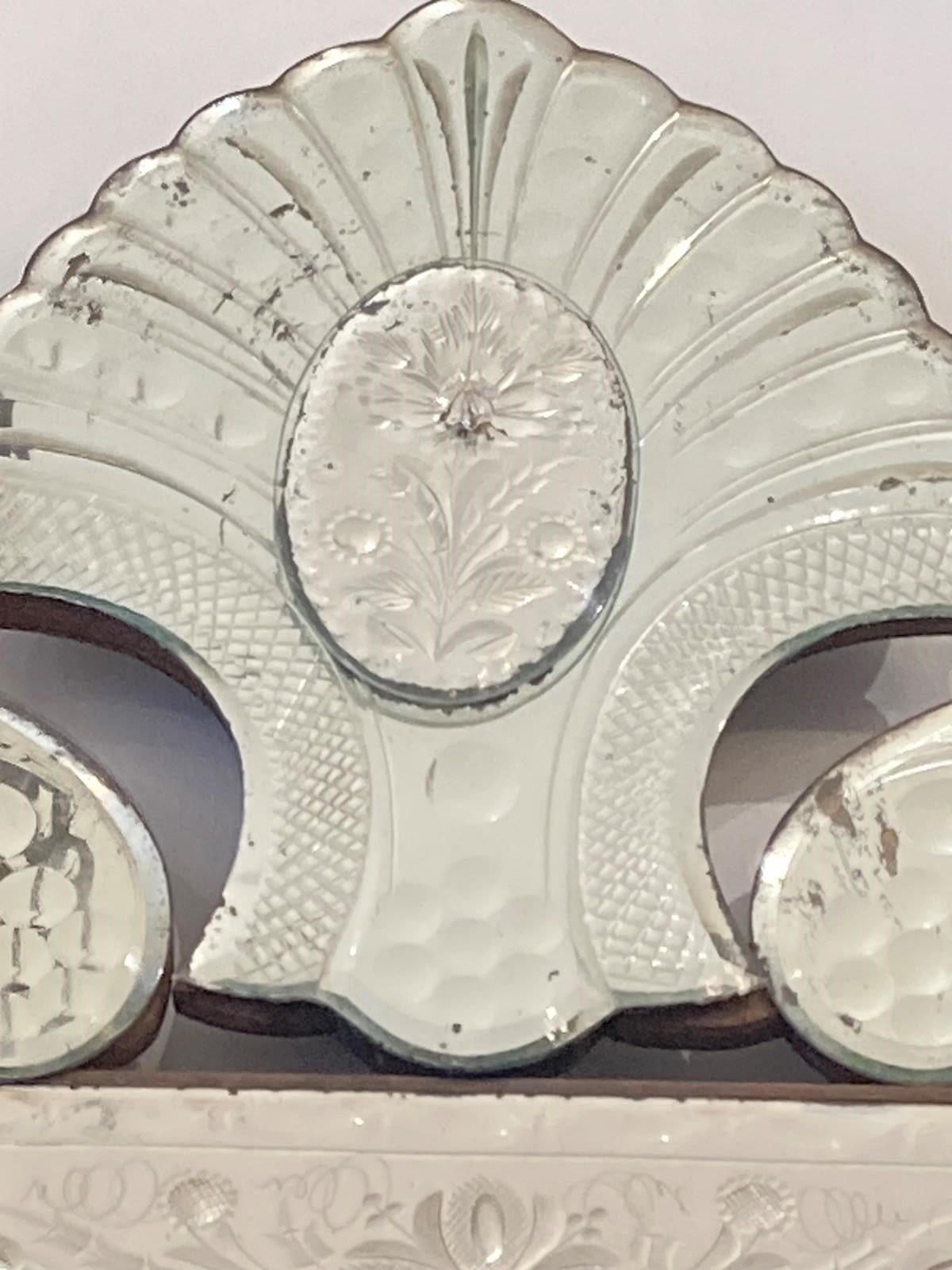 This is genuinely one of the most stunning antique Venetian mirrors we've ever had - it's not perfect; there's a repair (pic one) an old crack (pic two) and a small area of missing glass (pic three). However... if you can accept that, this has so much going on with intricate bevelling, reverse ground optics, cut mirrored flowers and engraved decoration, all starting to beautifully fox. It has plenty of genuine age (judging from the back is late C19th) and is of outstanding quality - th.is would have been an incredibly expensive mirror to produce and shows a huge range in the makers skills. Beautiful, unusual and highly decorative.