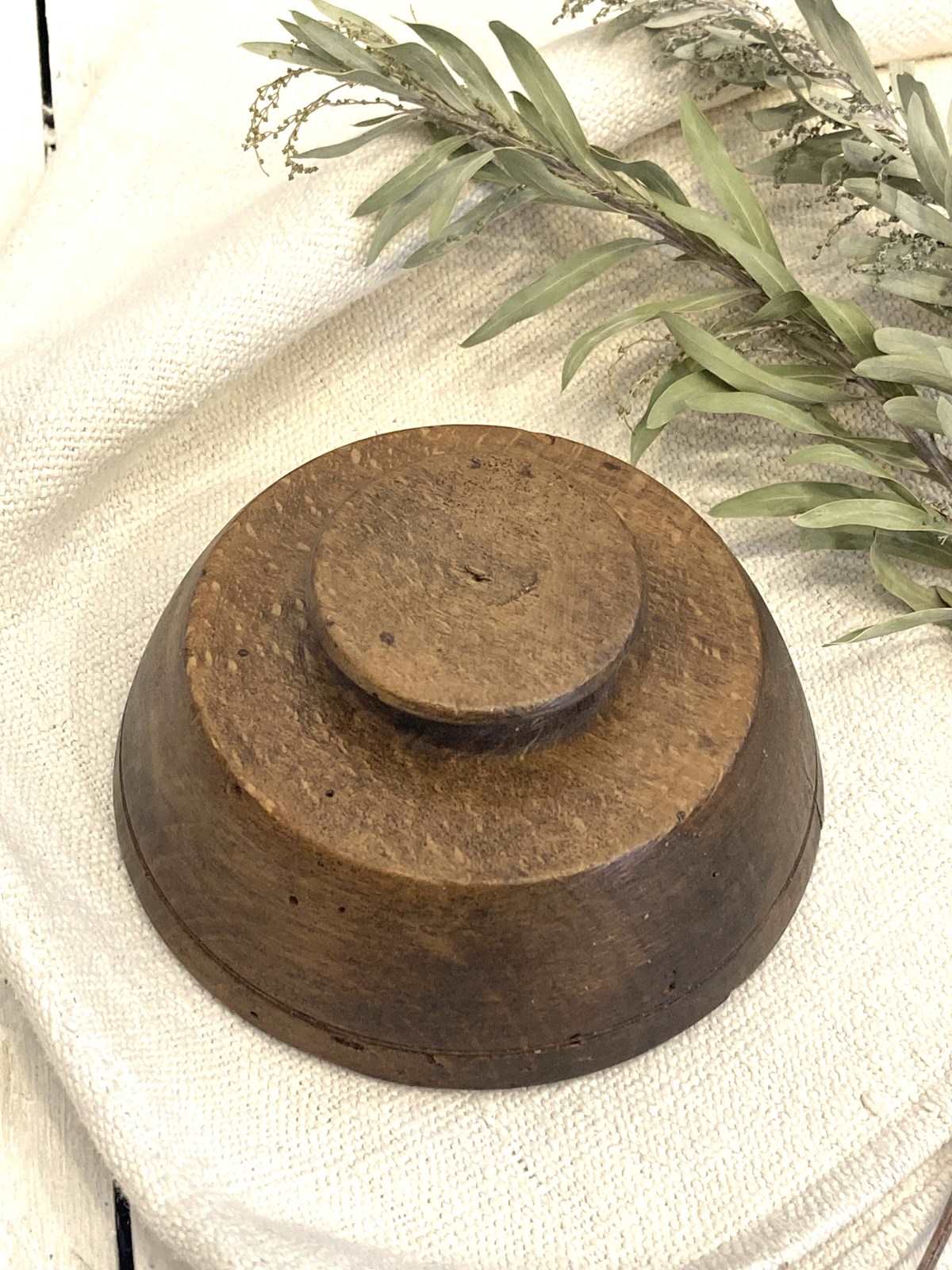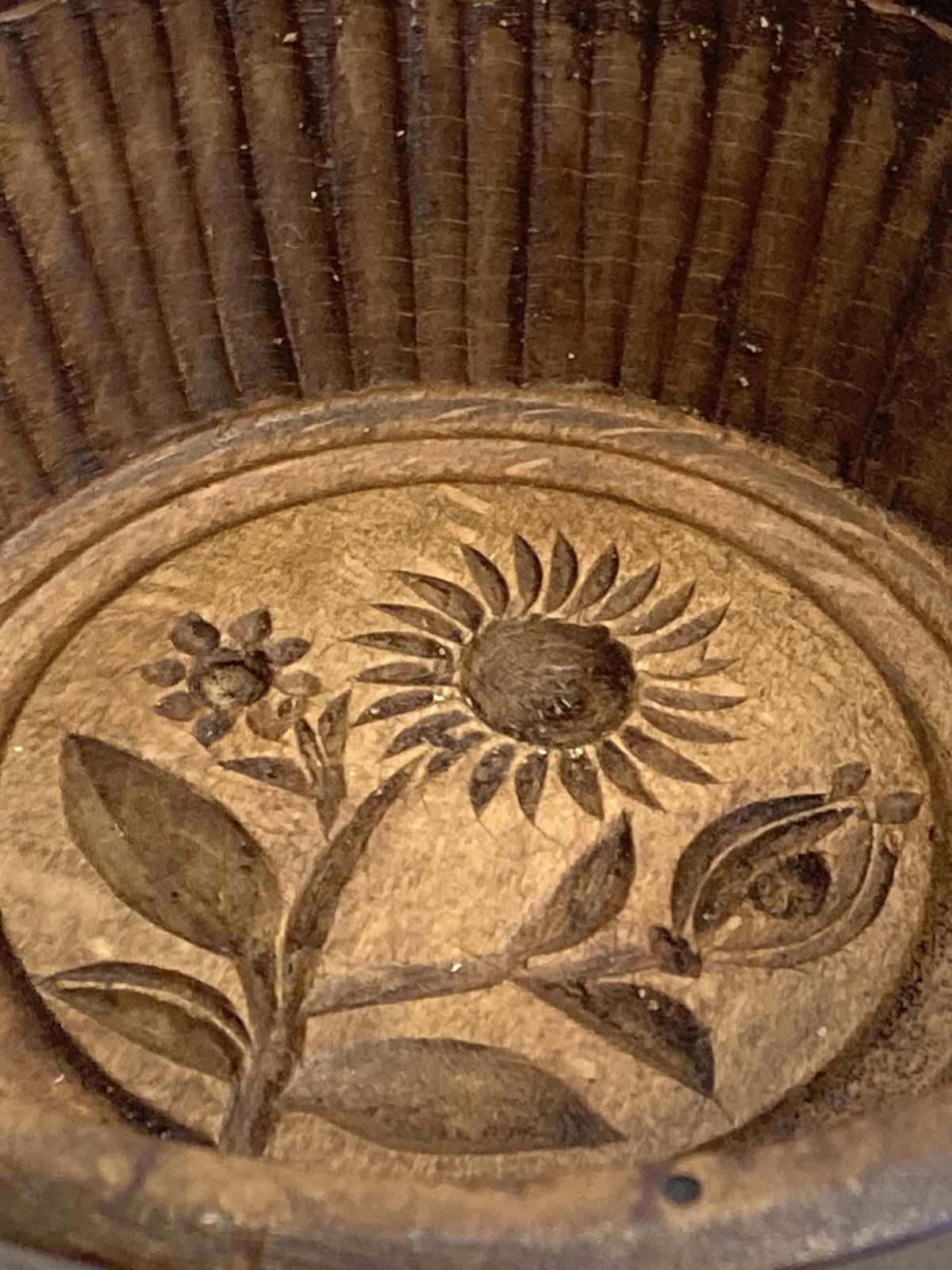 A really pretty antique French butter mould, carved from beech with a flower in lovely condition. This would have been made in the mid 1800's and used to make decorative pats - there's a round knob-handle on the back carved into the mould. An attractive piece of antique kitchenalia, perfect for display.