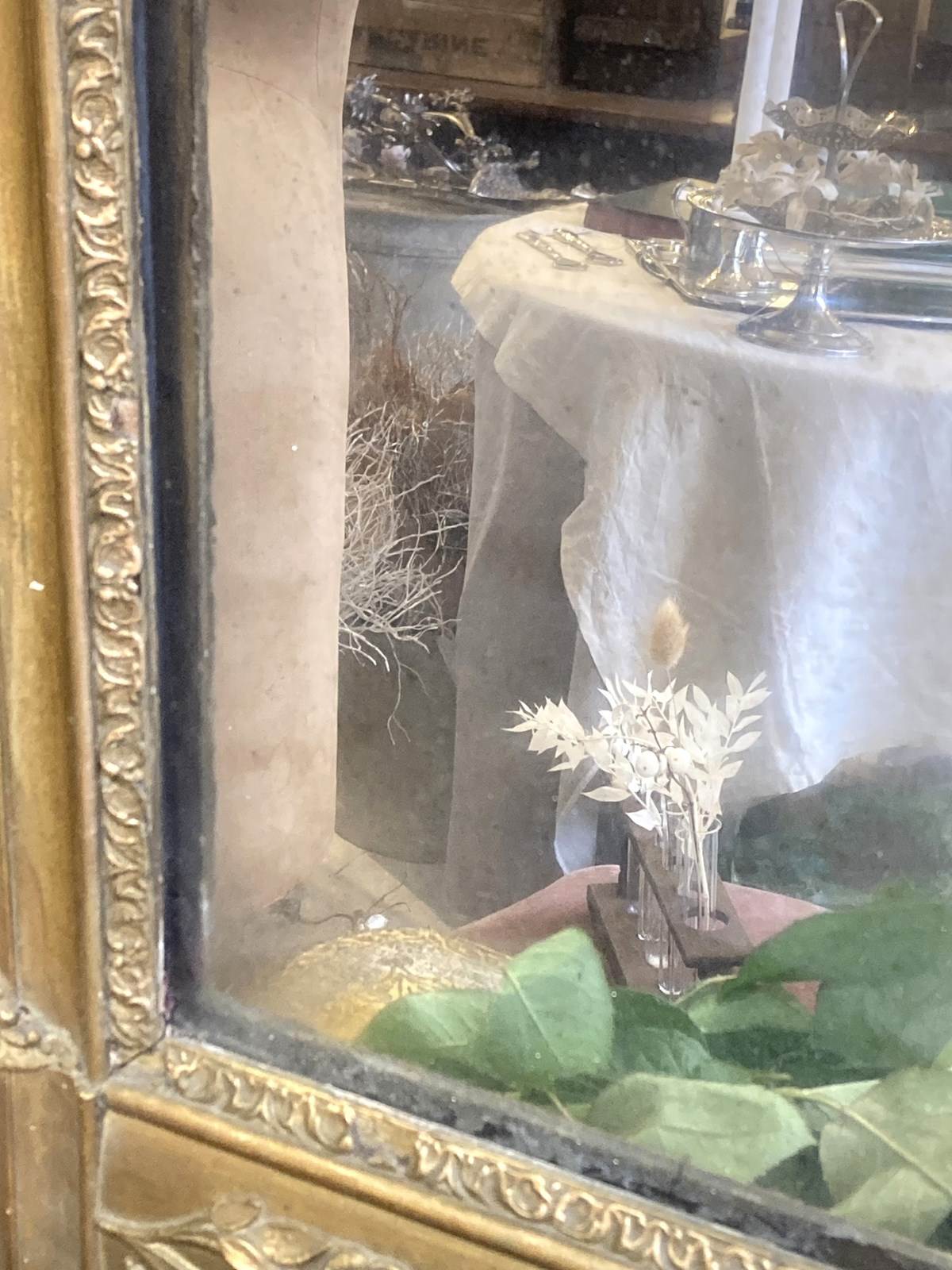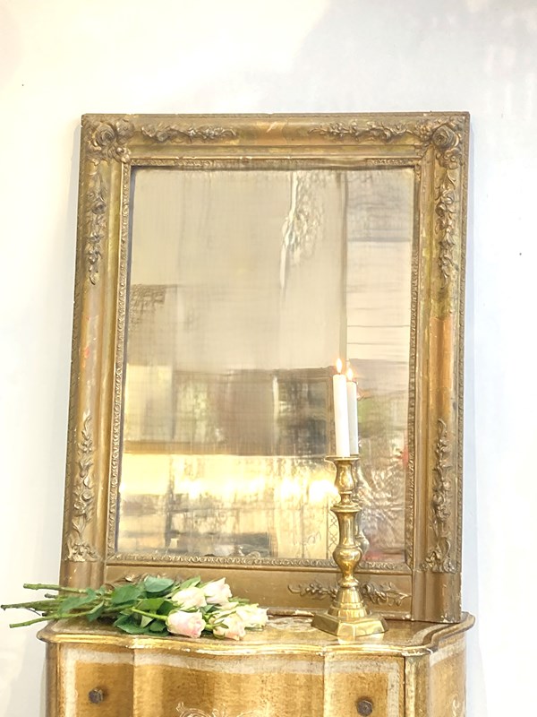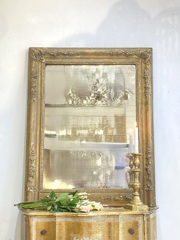 A handsome C19th French mirror with the original gilding and glass. The frame is decorated with beautifully cast foliage which is in lovely condition and the glass is slightly fogged and foxed giving a soft and gentle reflection. There are some small areas of damage to the frame as shown in the pictures - this has been left untouched and in original condition.