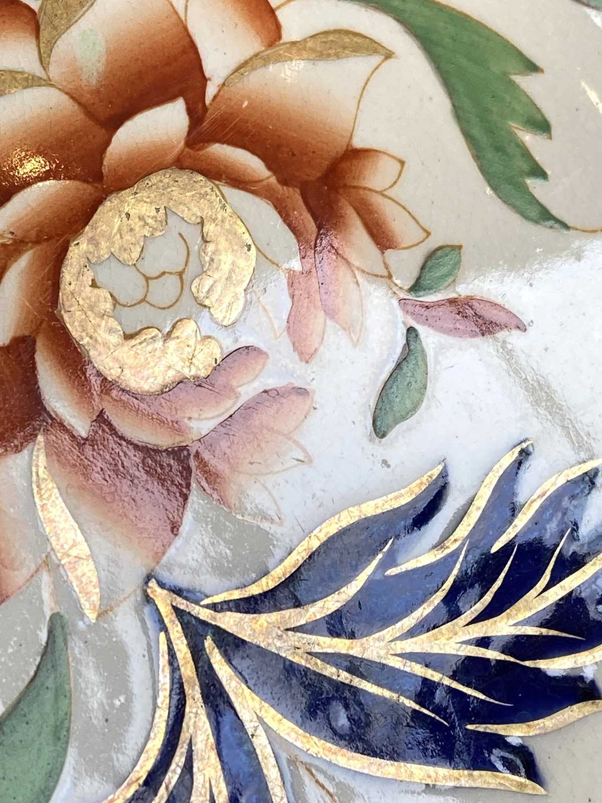 Hand-painted, they feature delicate underglaze blue outlines brought to life with vibrant overglaze enamels in rust orange and deep navy, finished with gilt accents. The ornate design includes a striking central chrysanthemum and peony motif. Crafted on a high-quality Pearlware / Queen’s Ware base, synonymous with Wedgwood’s enduring craftsmanship.