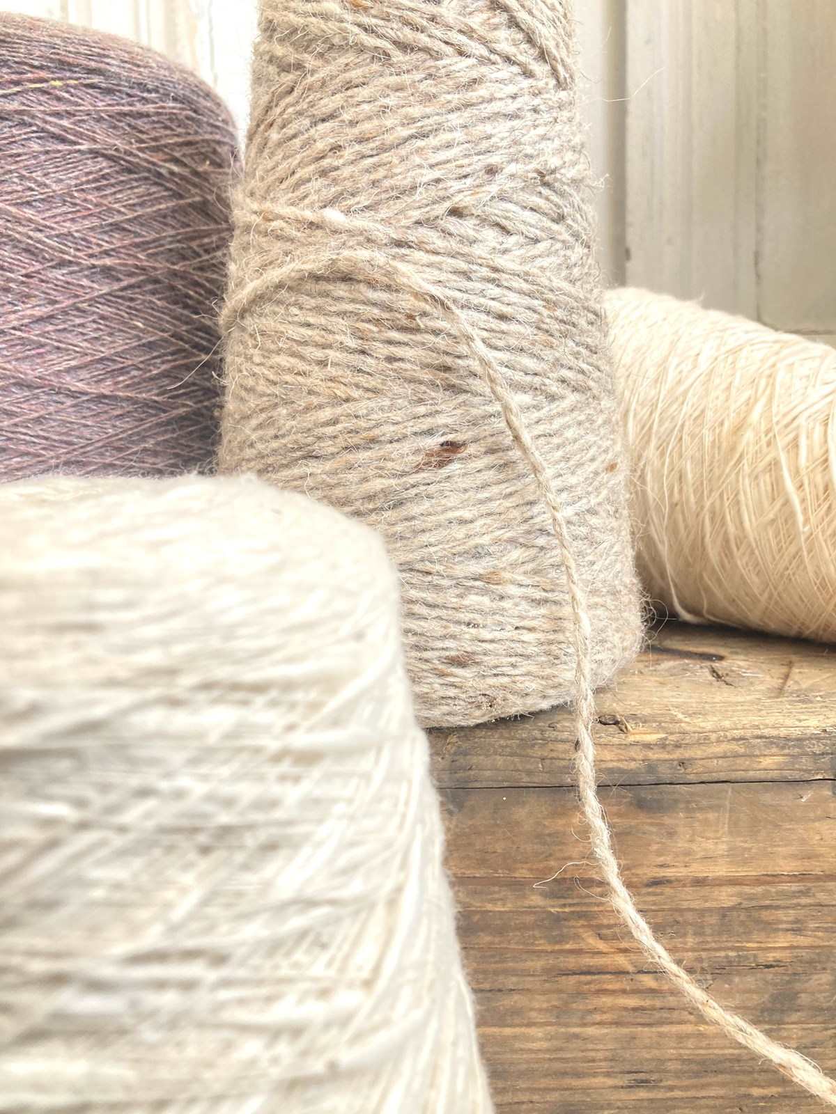 A collection of 4 vintage wool cones with yards & yards of wool on each - wonderfully chunky and tactile they make wonderful display props!