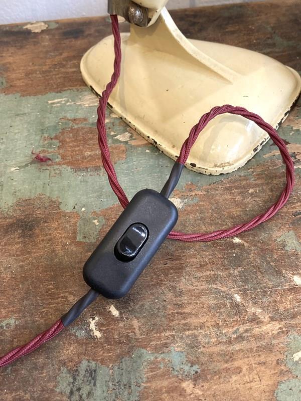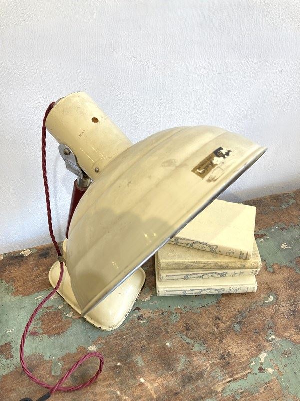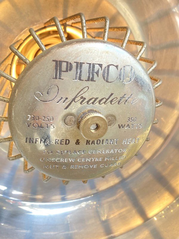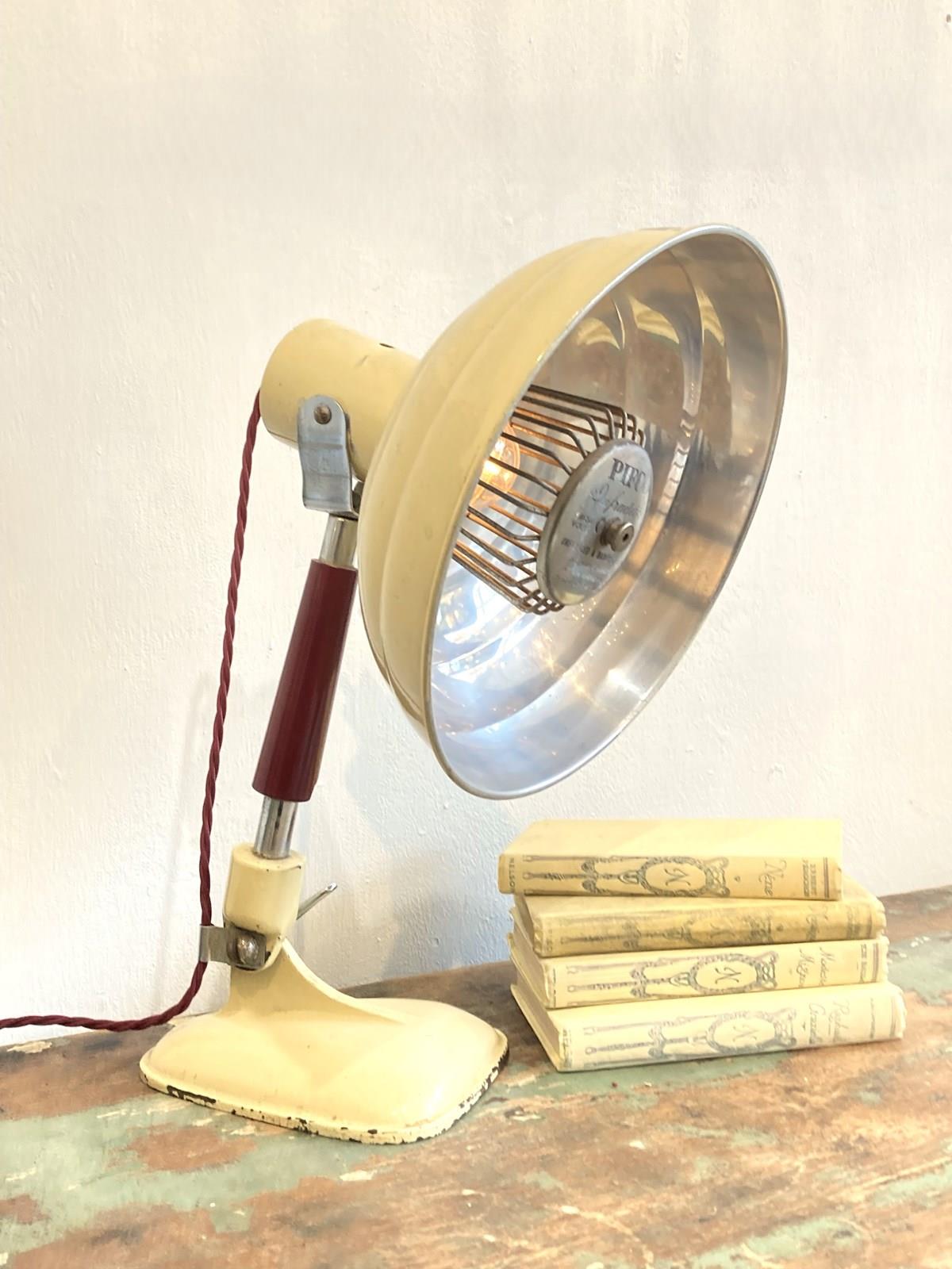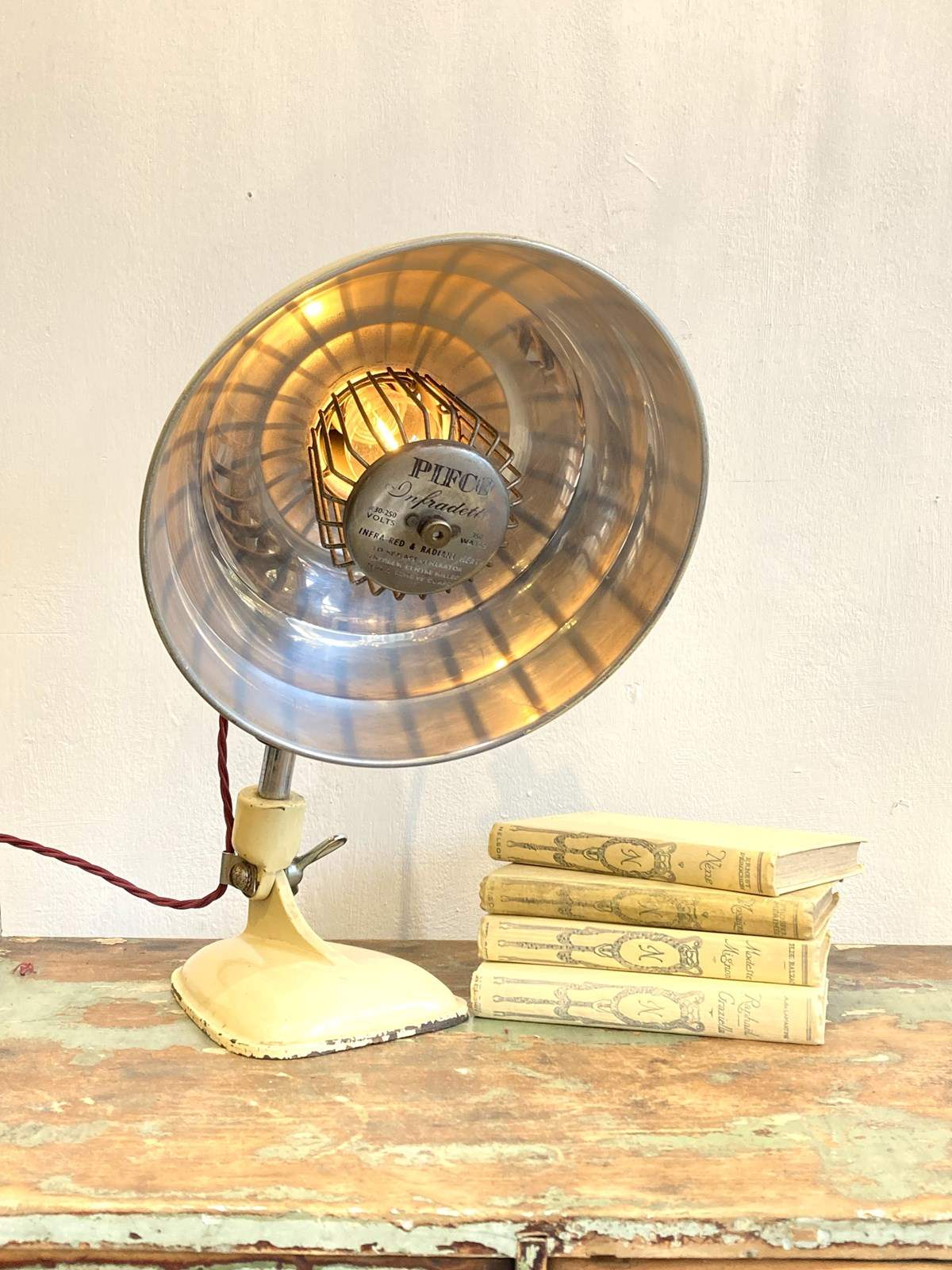 This 1960's Pifco Infradette heat lamp has been converted into a very stylish table lamp retaining all of it's midcentury, slightly space age styling with fabulous lettering in the centre. Wired using a dark red fabic braided cord to complement the rubber banding on the core with an inline switch. It may need some tinkering to get the shade to be repositionable but other than that it's in good vintage condition.