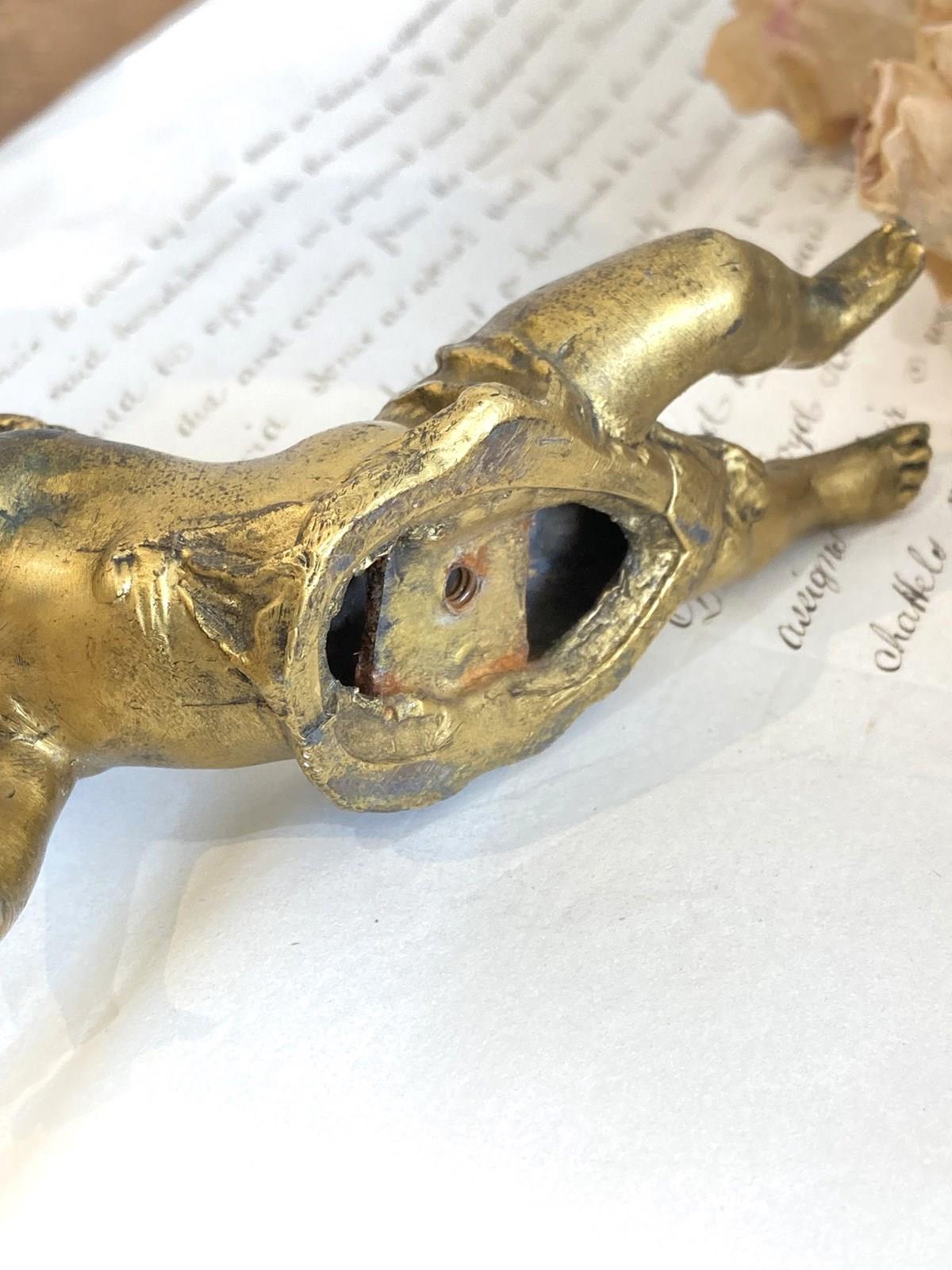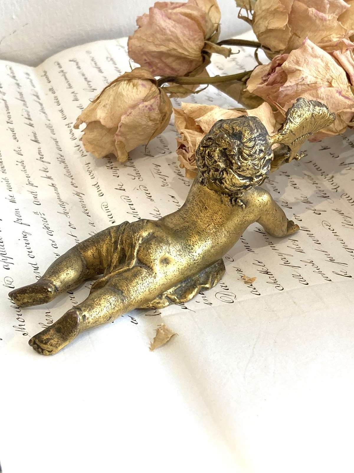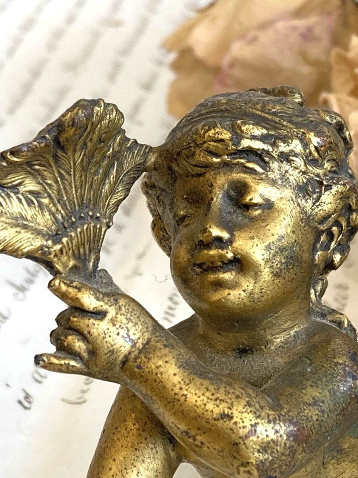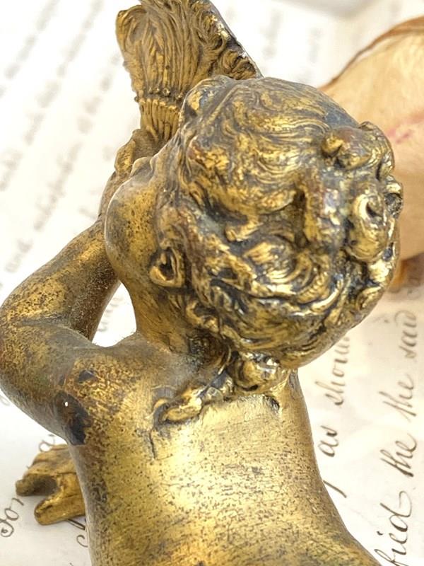 Such a sweet little antique brass figure of a cherubic style girl with her hair swept up, lying on her front holding a feather fan aloft. The detail is wonderful and she's very well modelled and cast with the pleats of the fabric flowing over her and little curling tendrils of hair falling down her back. Originally she would have adorned a clock or small piece of furniture but now she makes an utterly glorious little shelf-sitter.
