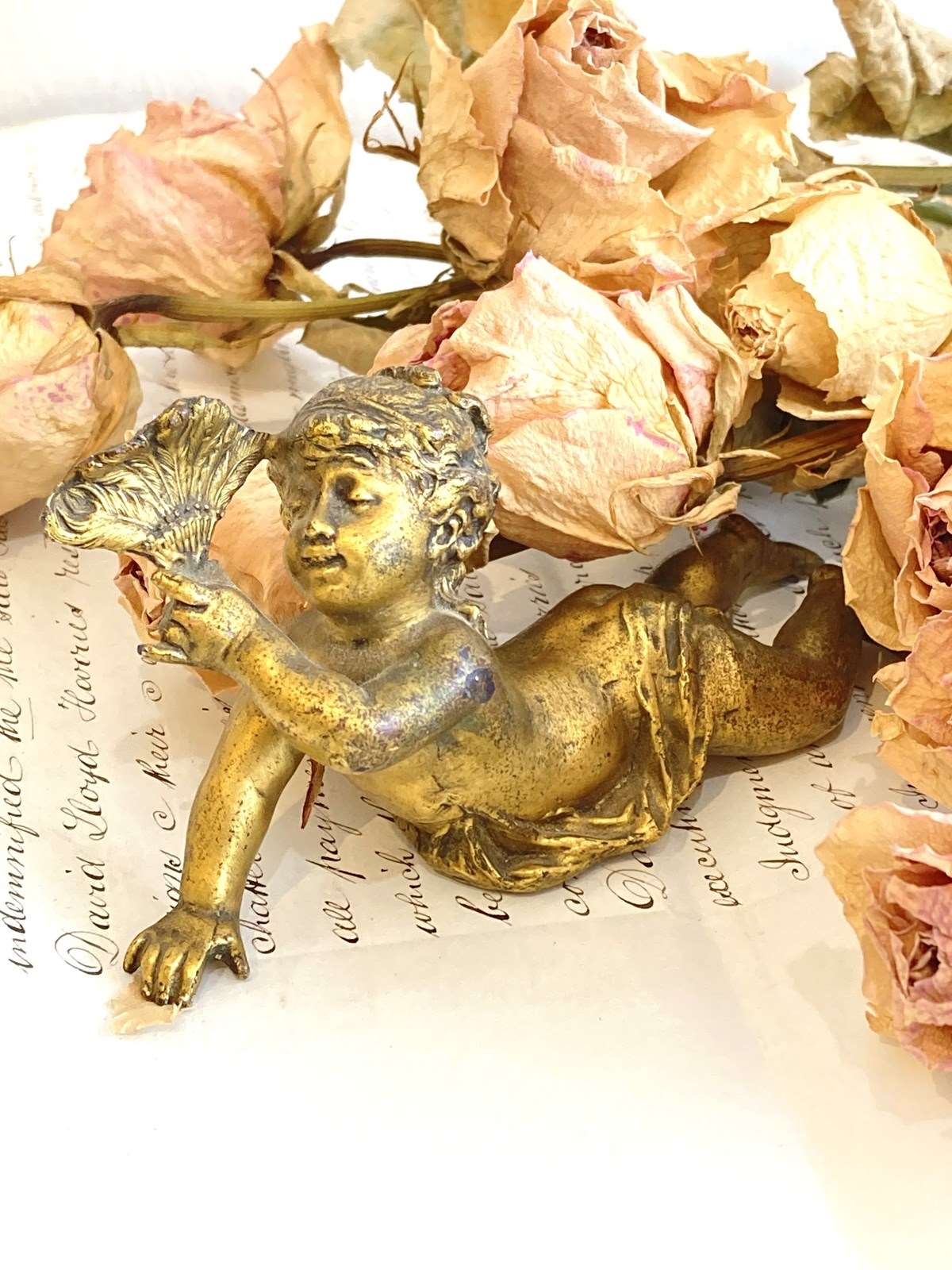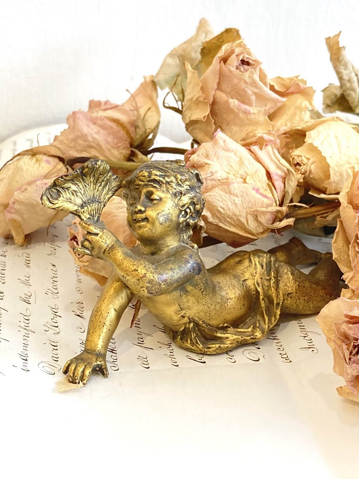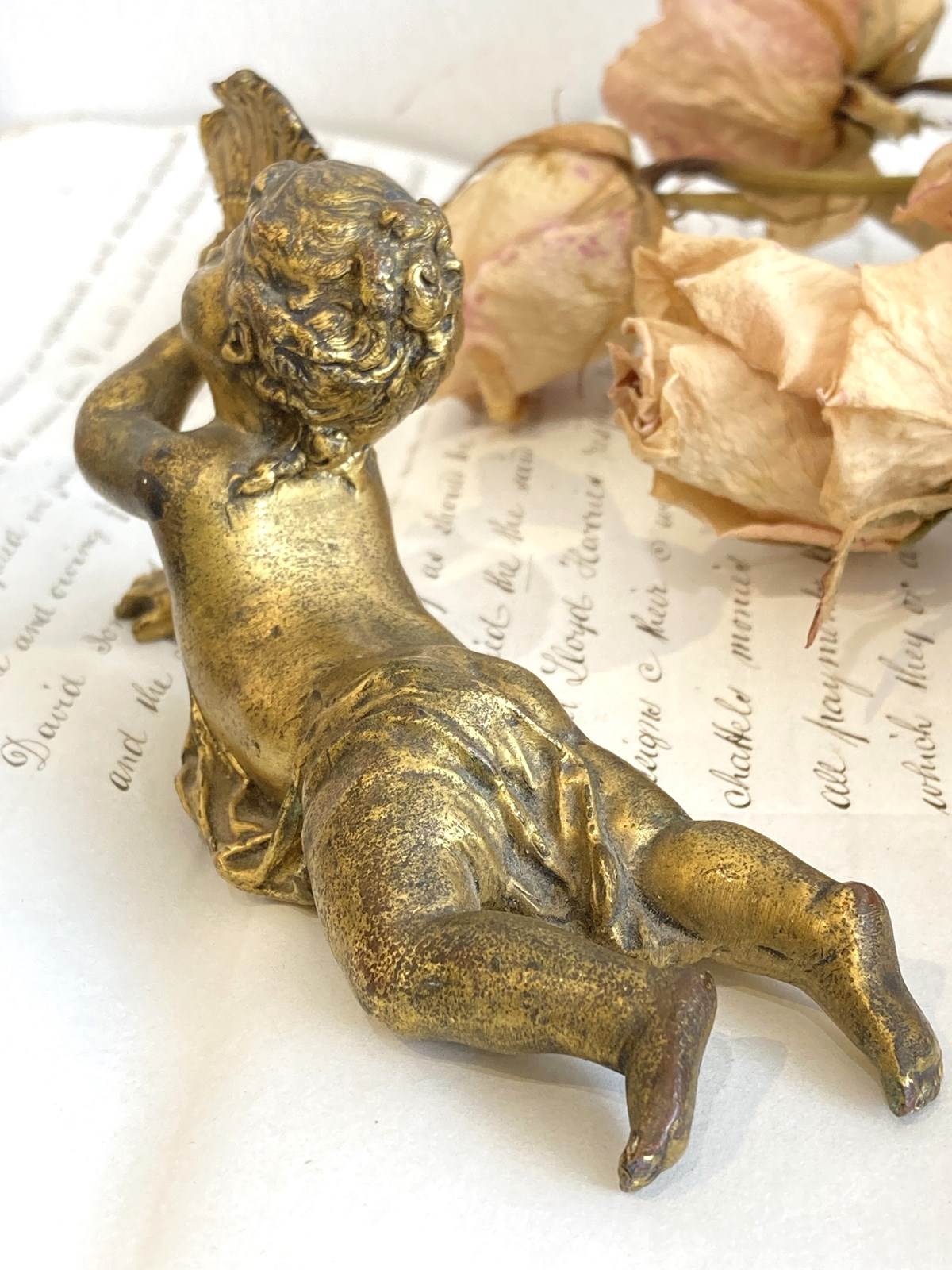 Such a sweet little antique brass figure of a cherubic style girl with her hair swept up, lying on her front holding a feather fan aloft. The detail is wonderful and she's very well modelled and cast with the pleats of the fabric flowing over her and little curling tendrils of hair falling down her back. Originally she would have adorned a clock or small piece of furniture but now she makes an utterly glorious little shelf-sitter.