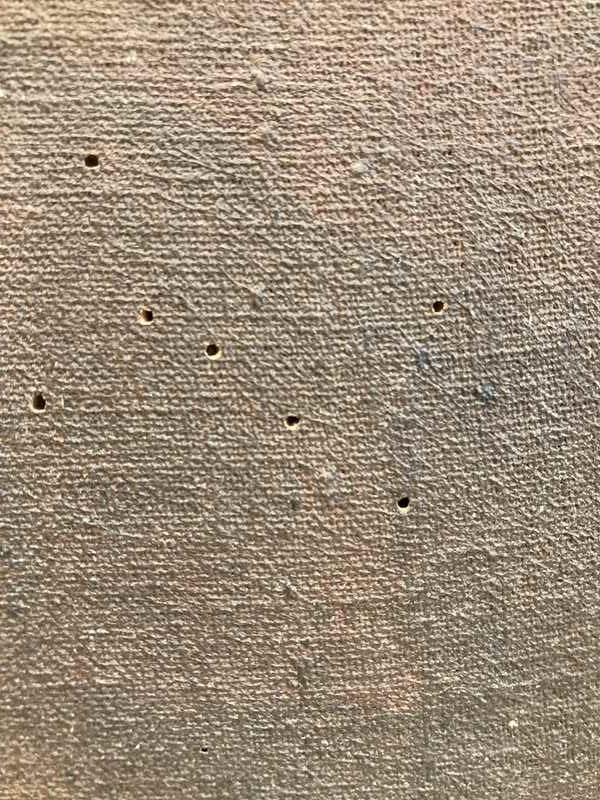 There is some historic woodworm which is no longer active in the bottom right hand corner which can't be seen from the front because it's within the dark part of his coat.