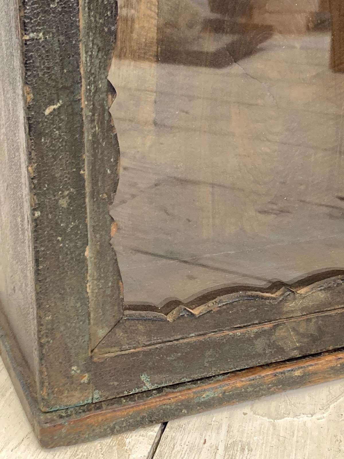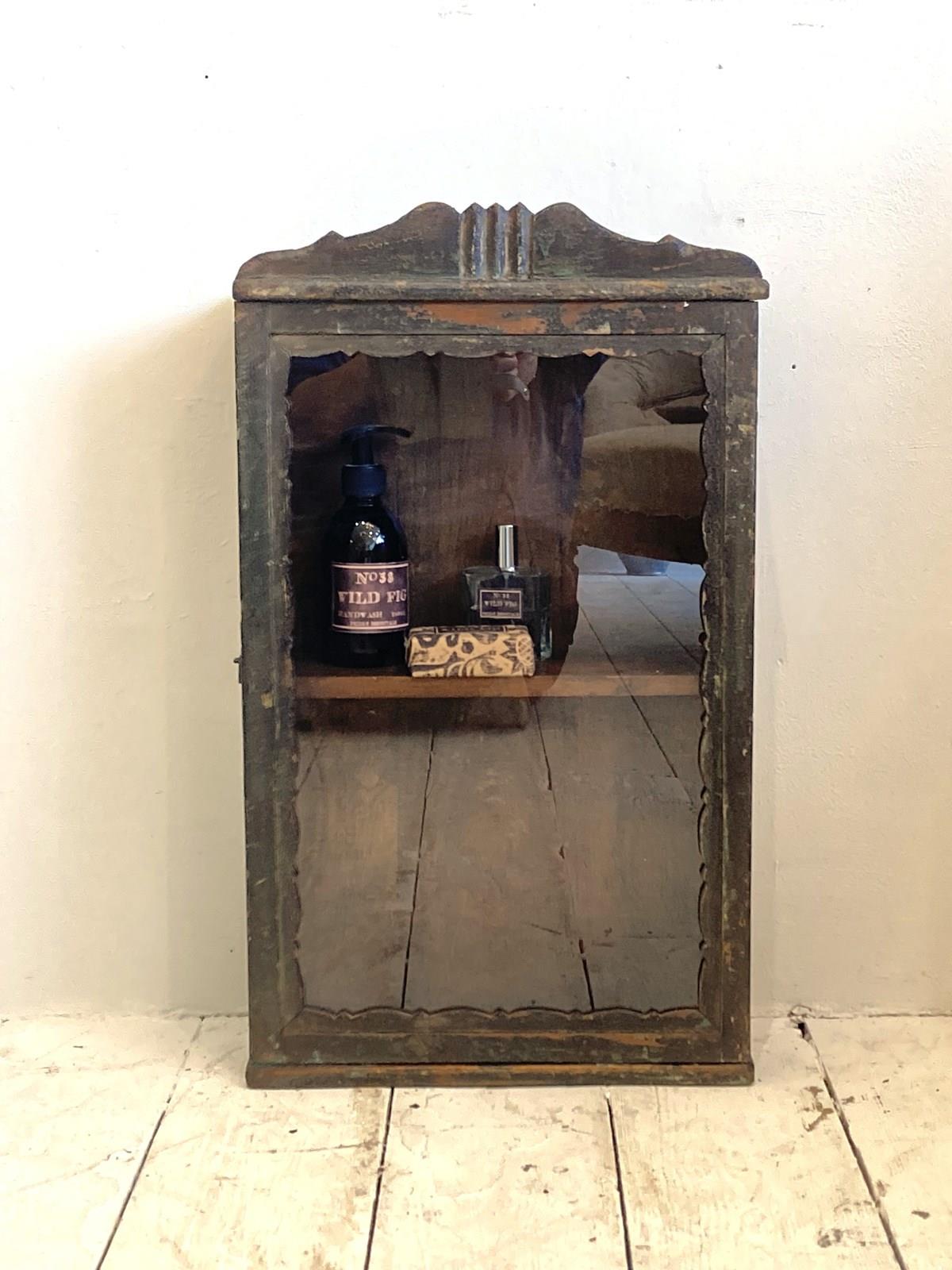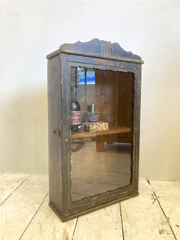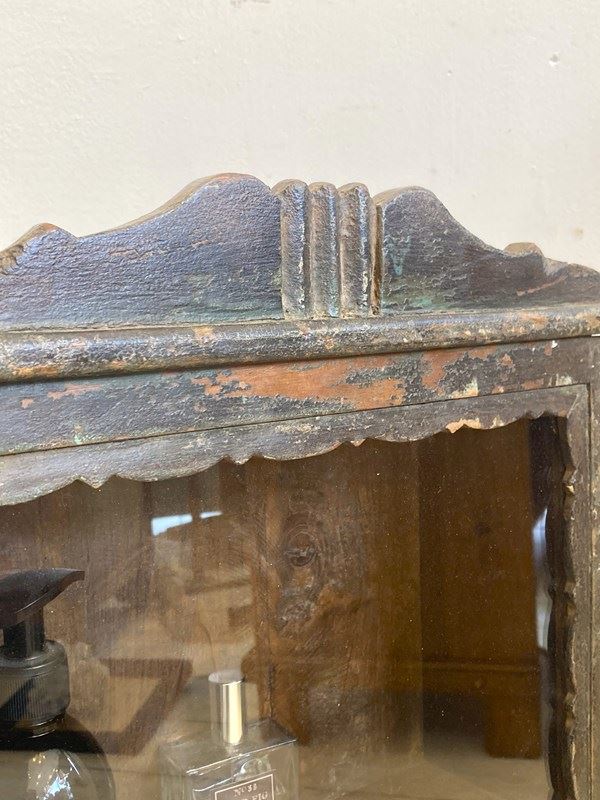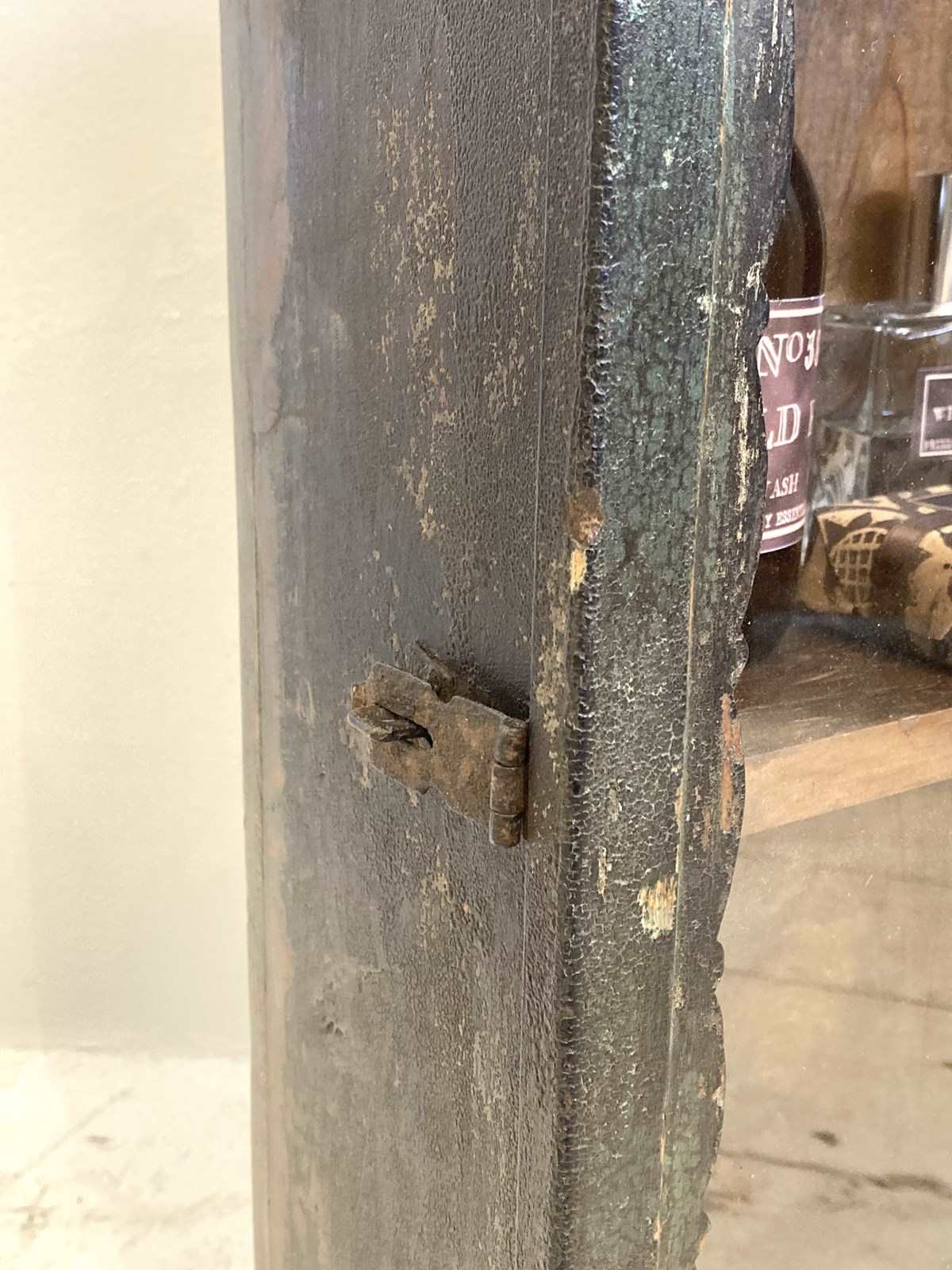 A great sized little Indian cabinet with glass door and single internal shelf. The cabinet has layers of original paint including green and black giving it a wonderful textural finish. The door secures with a latch on the left hand side and there are two hanging eyelet on the back.