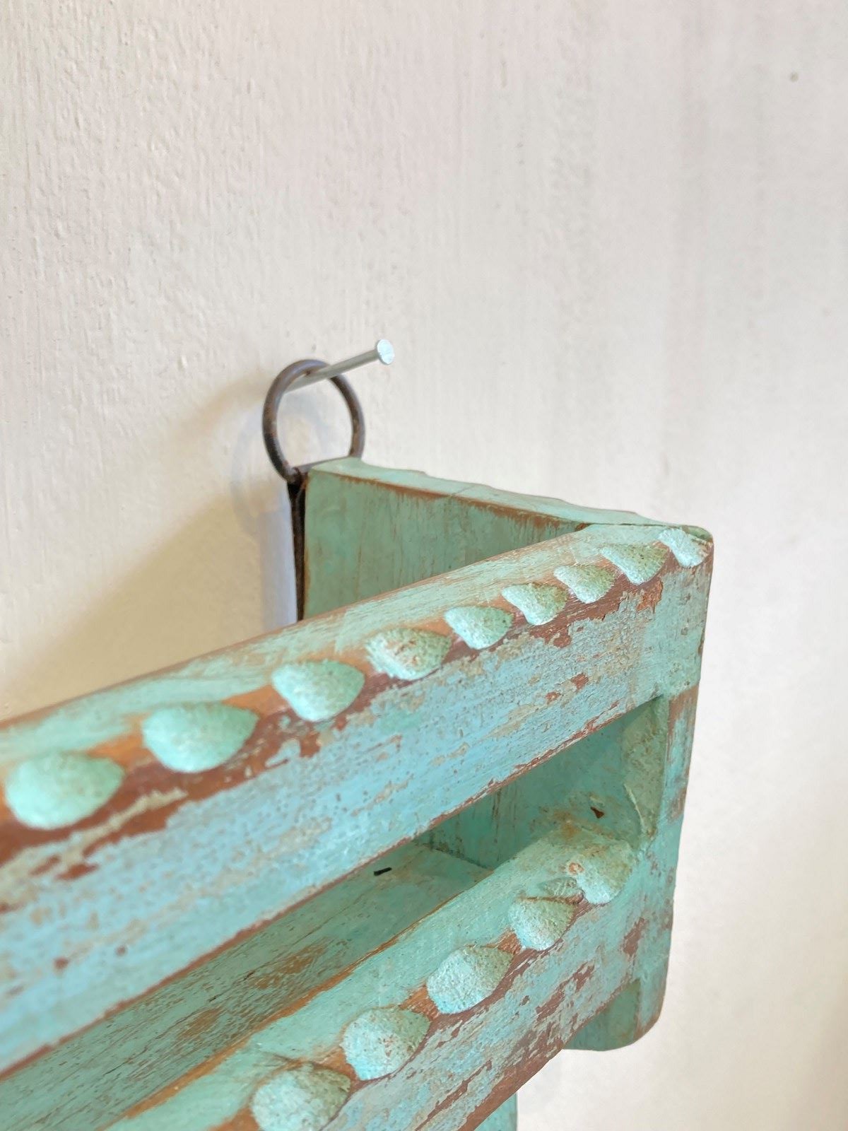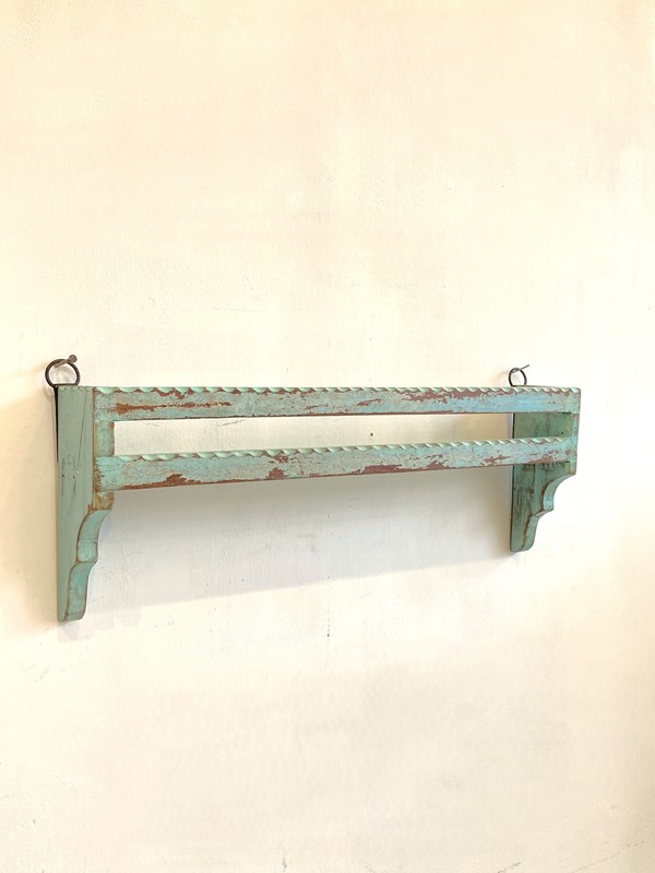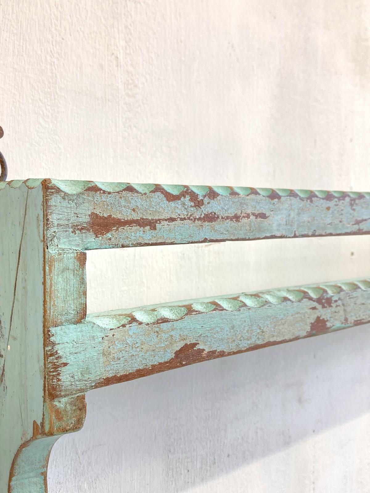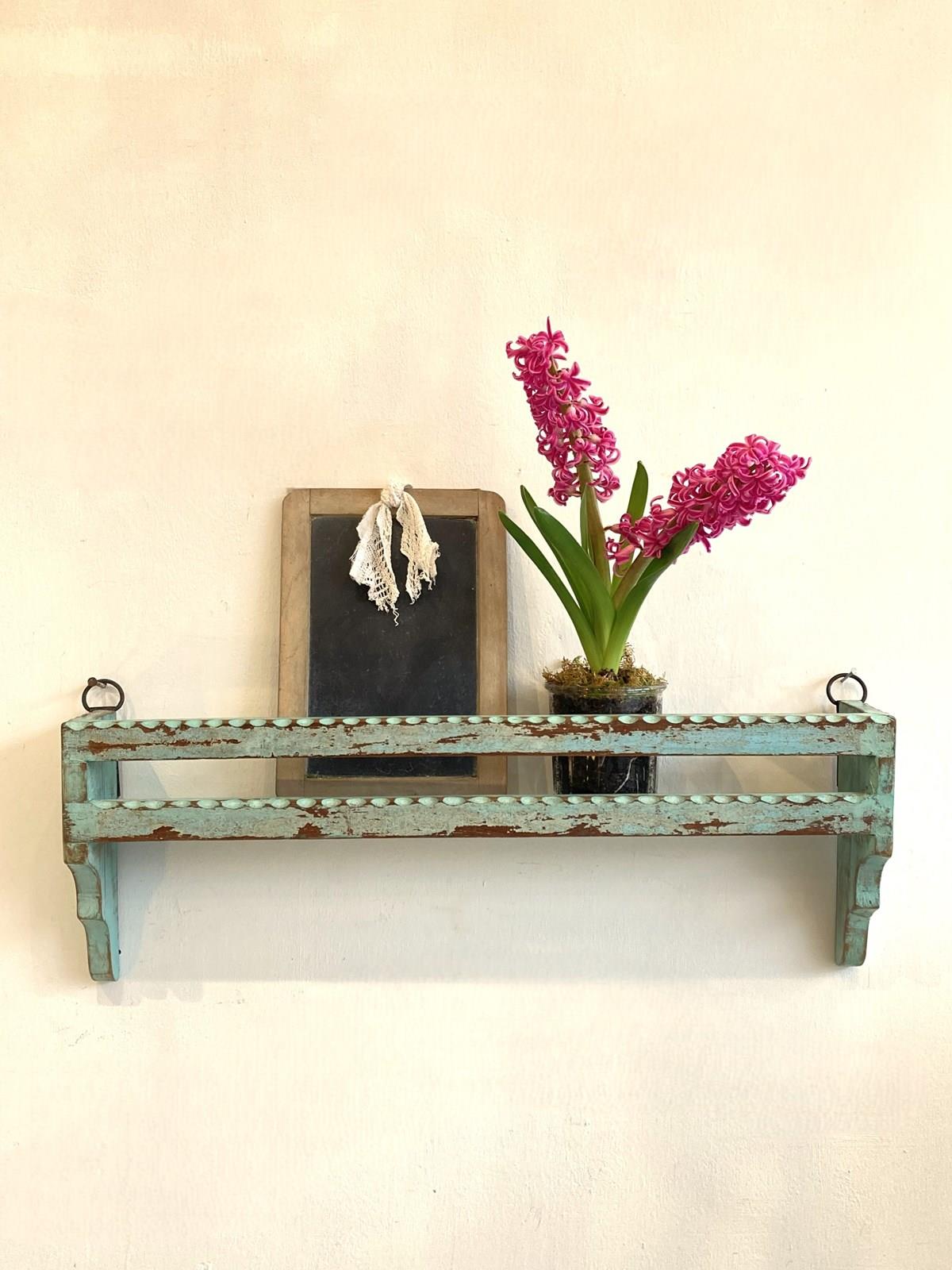 A simple hand-carved Indian shelf made from reclaimed timber with the original weathered blue paint. The shelf has a hanging loop at either end to wall mount.