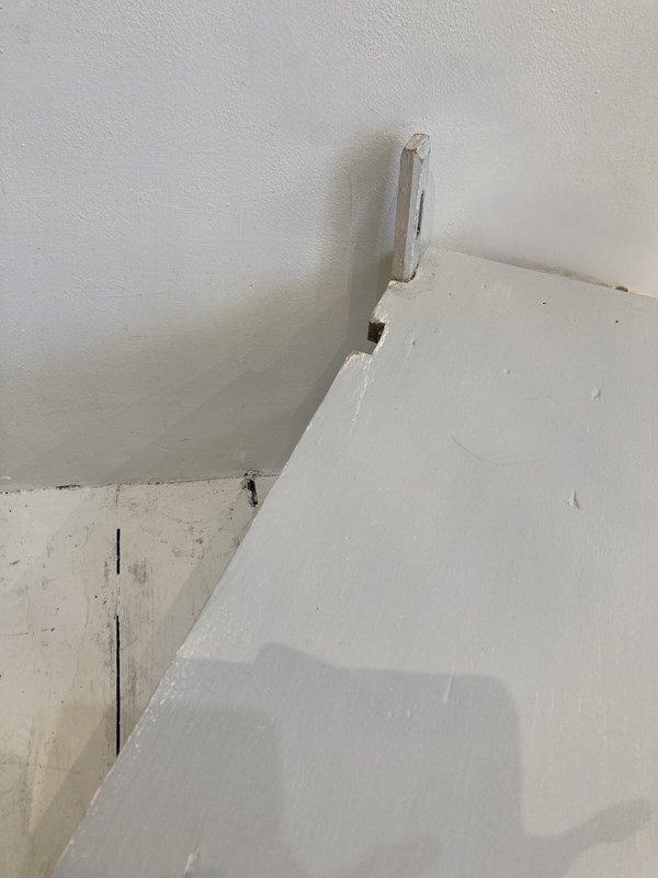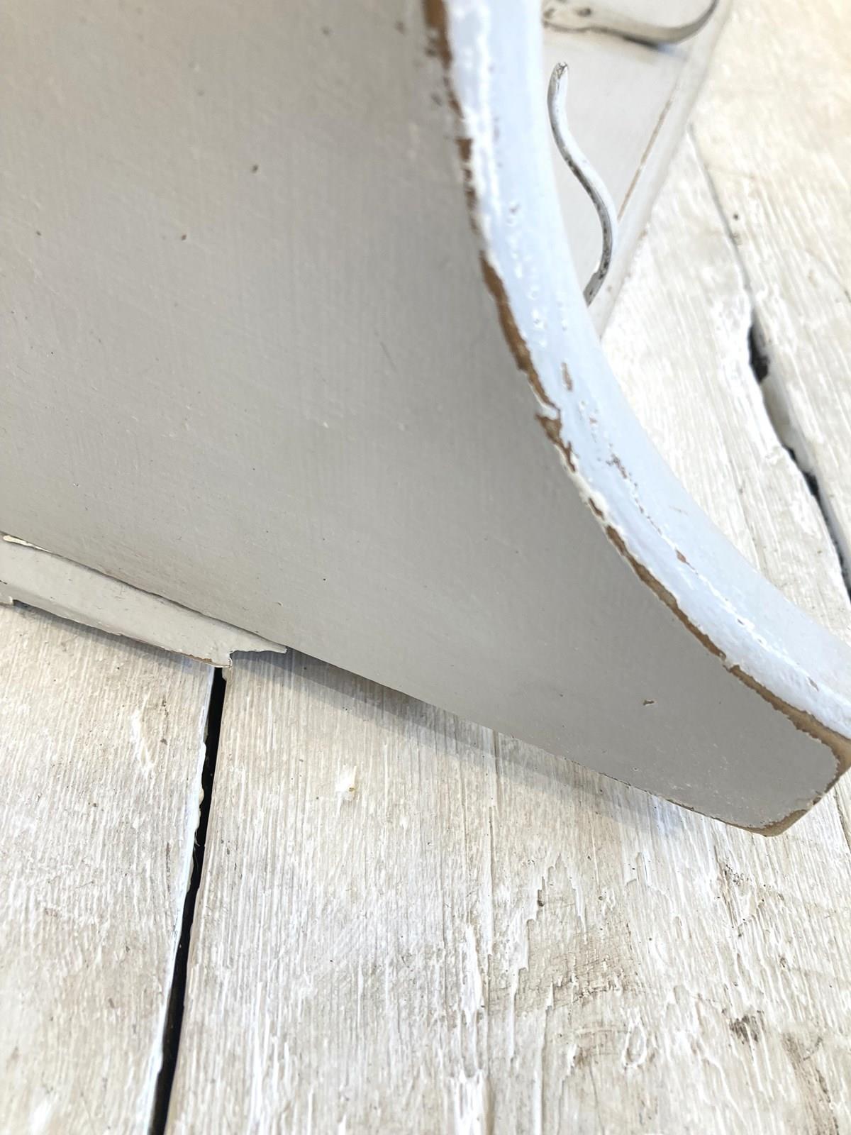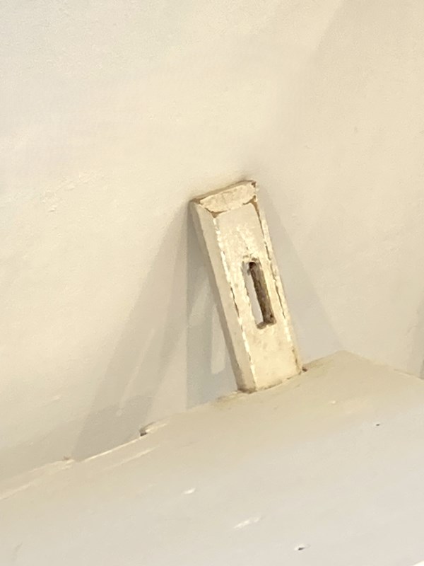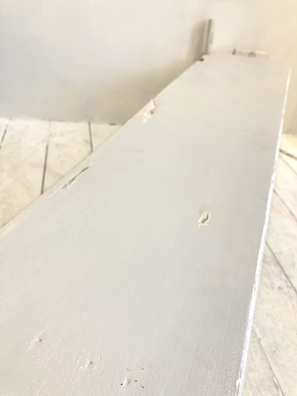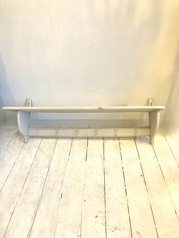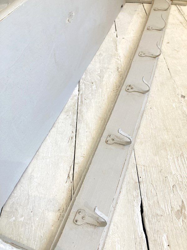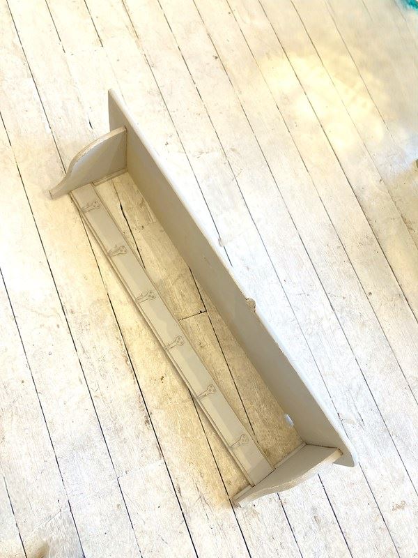 A substantial vintage French game shelf with 6 hooks and shelf on the top painted in Little Greene Paint Co 'French Grey' which has been given a gently weathered finish. There are holes in the uprights for attaching to a wall and on the right hand side at the back a small notch has been cut in from the back.