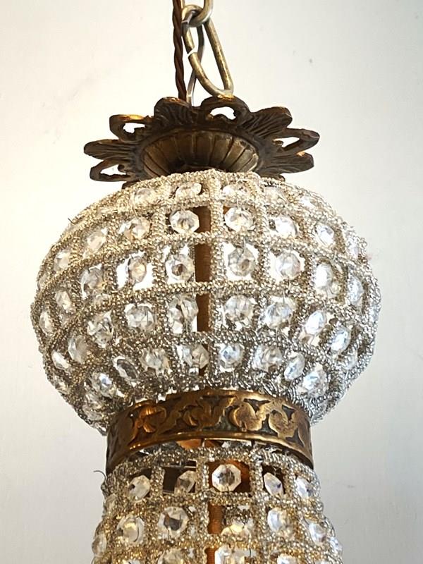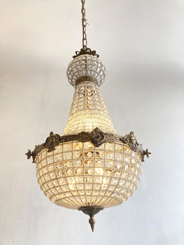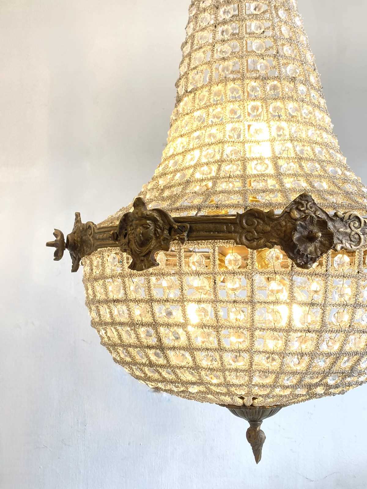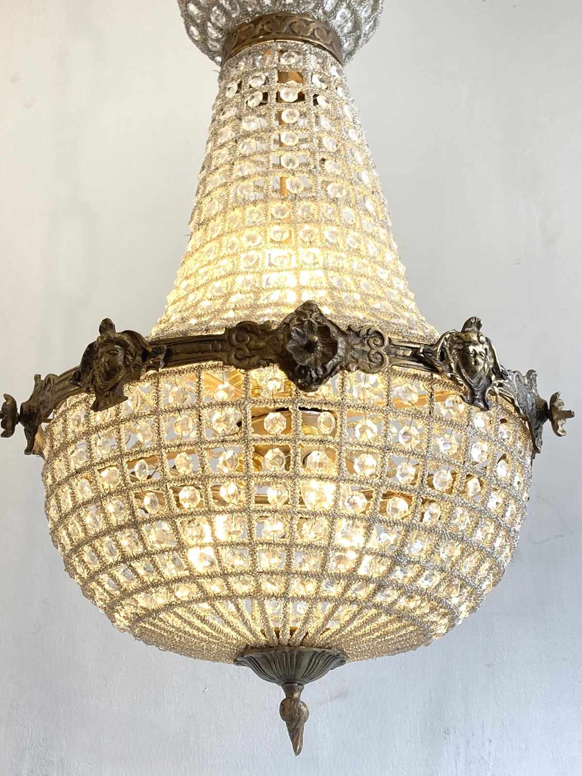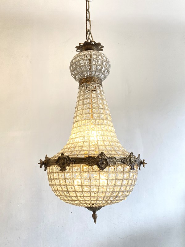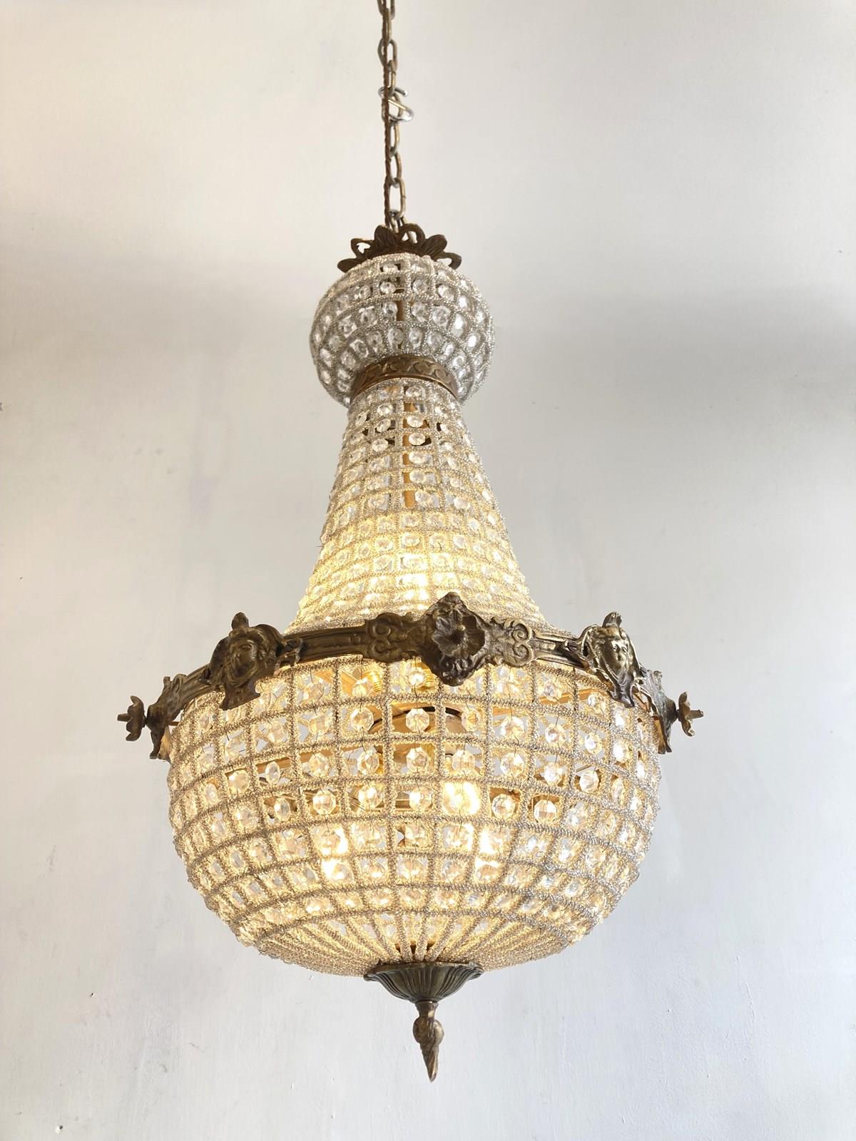 A gorgeous button empire chandelier; a vintage brass frame decorated with flowers and cherubs, with individually buttoned cells encased in twisted glass beads which diffuses the light beautifully and looks amazing when the light is dimmed.