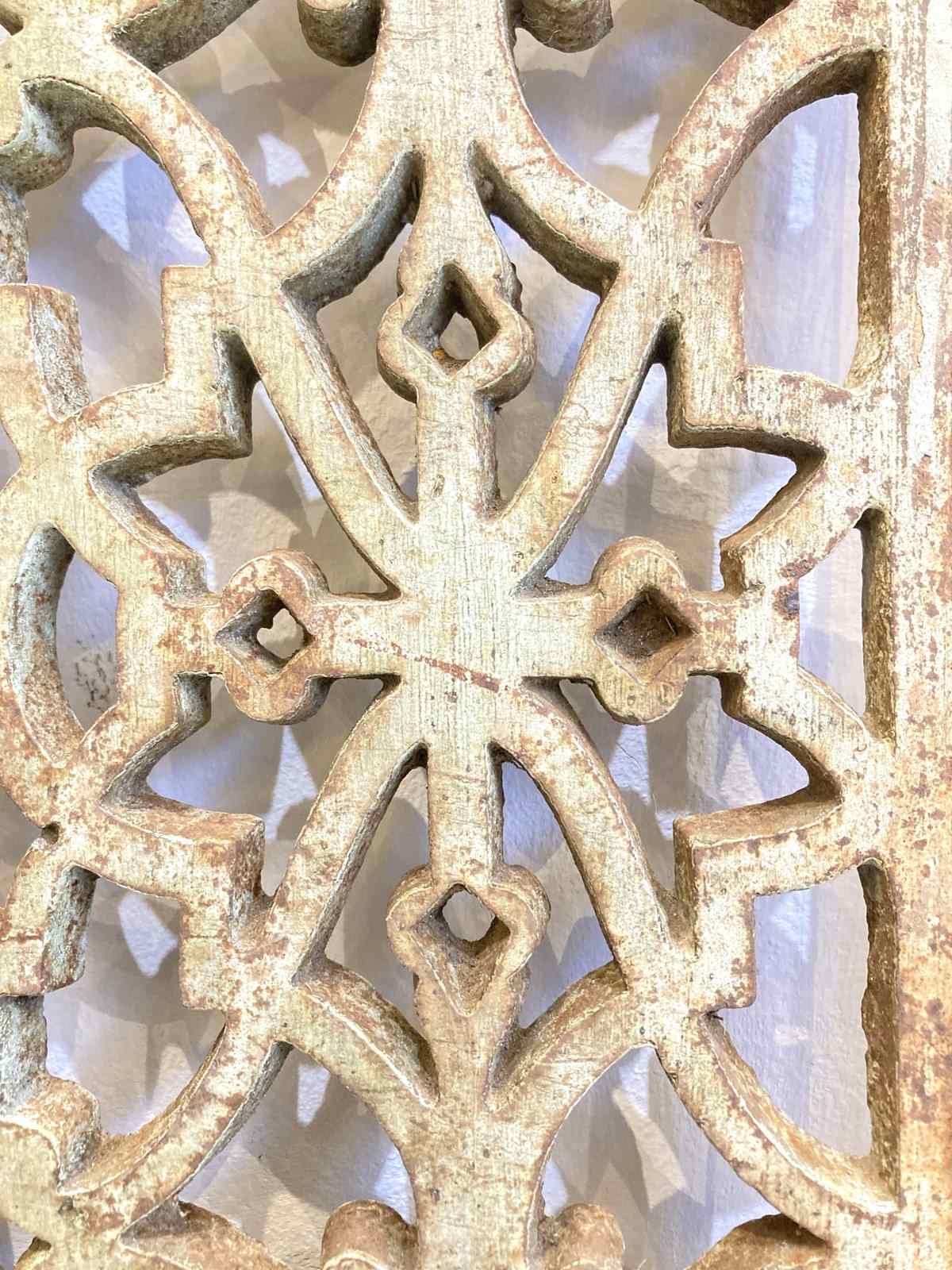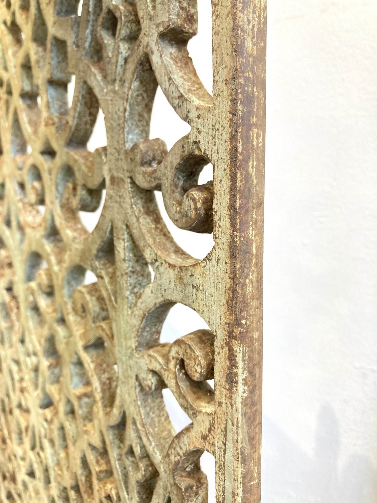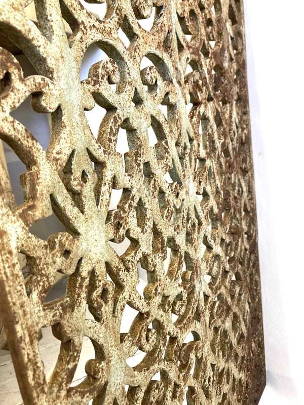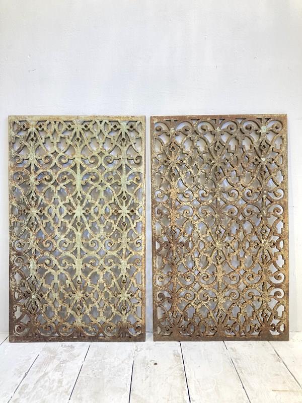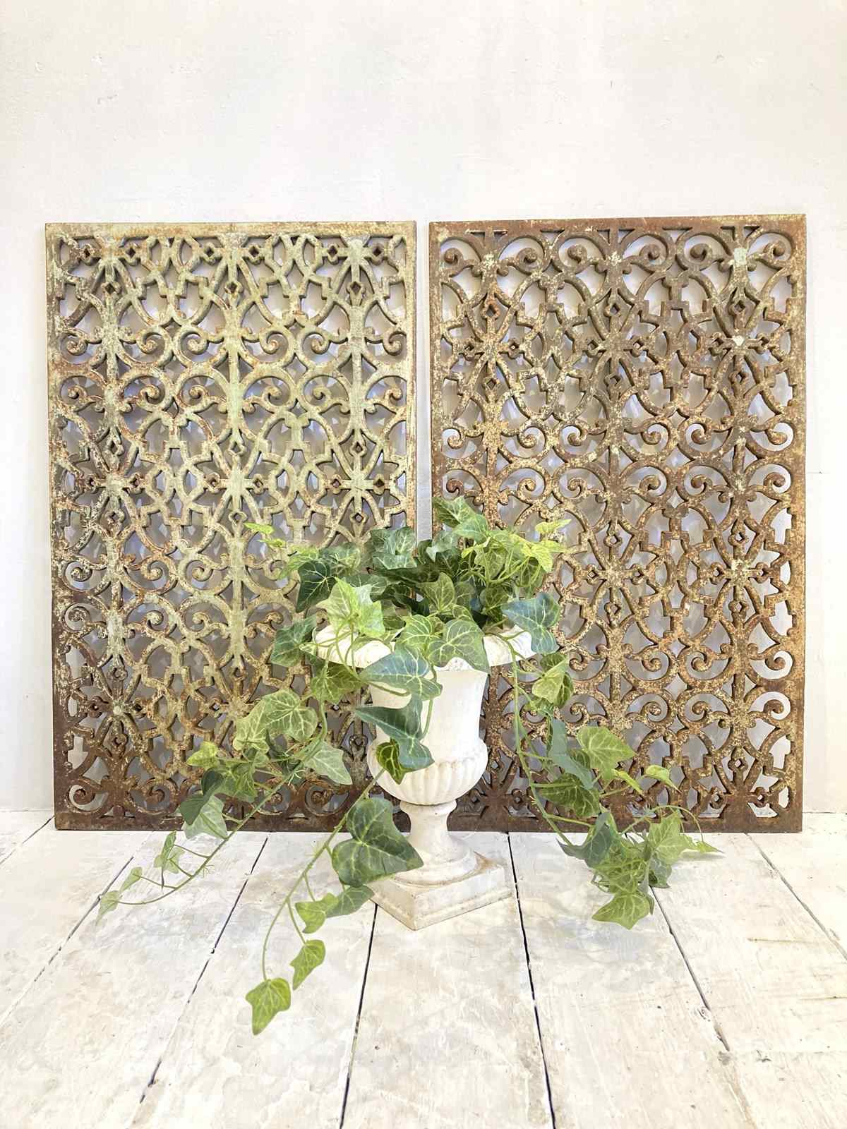 Two beautifully cast grills with an ornate and very decorative design and the remains of the original pale turquoise paint on both sides. Made from cast iron, they're very heavy and robust - in the right setting they'd look stunning either indoors or in a garden.