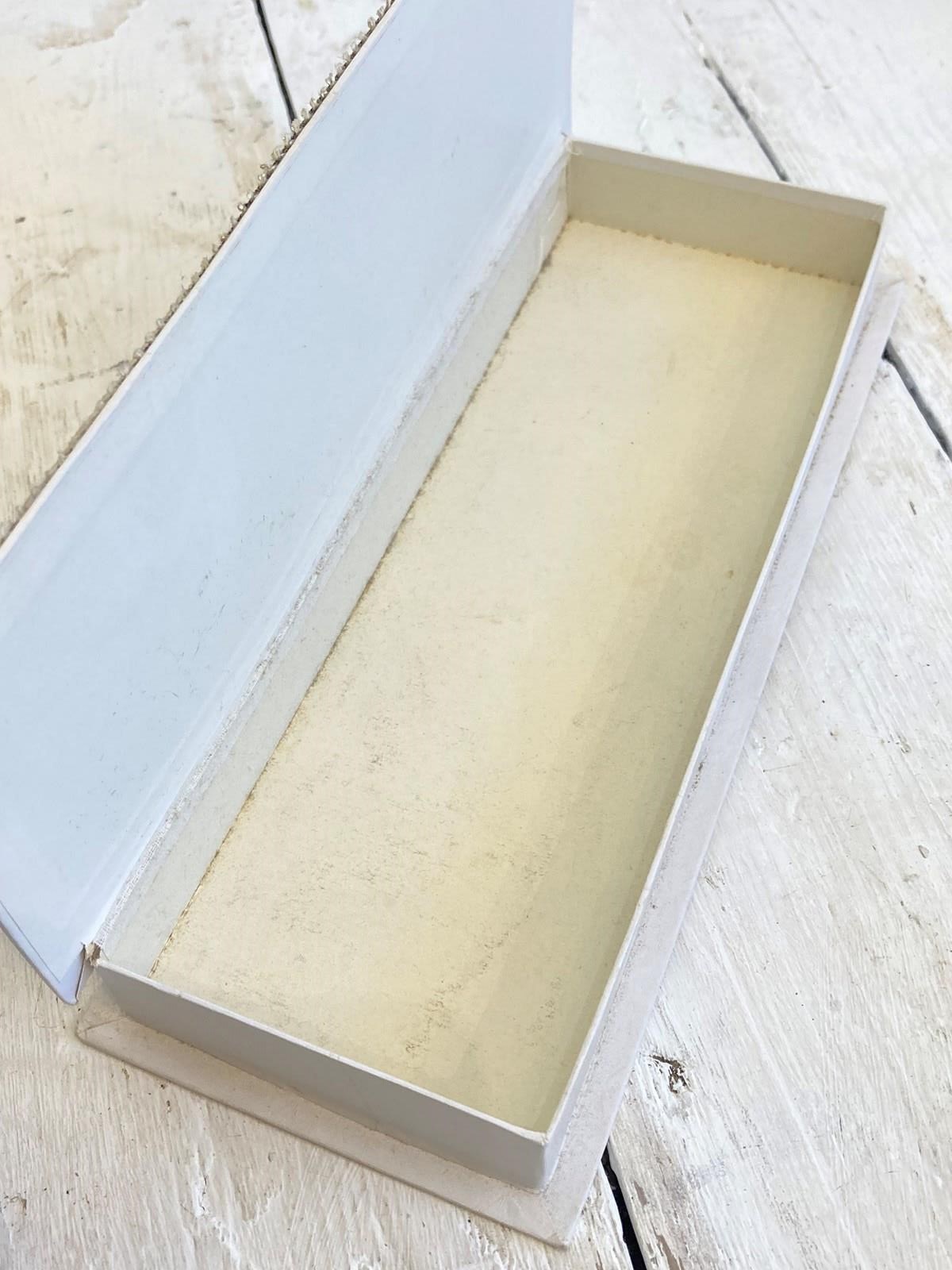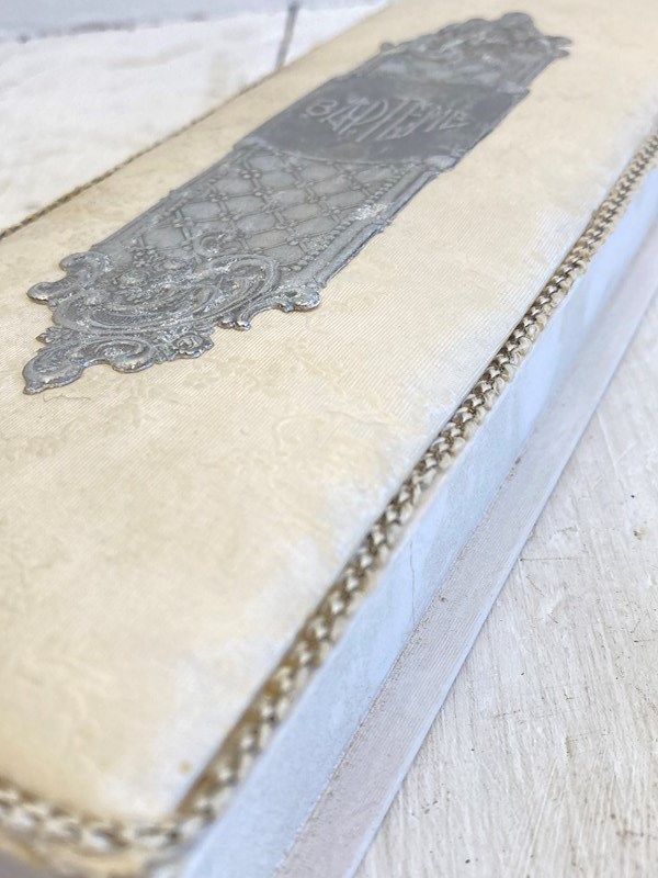 Originally produced to hold dragees (sugared almonds) - a traditional gift at a French baptism or christening, this box is of a very simple design but so pretty! Made from card with a slightly padded fabric lid, there's a simply braided edging to the box and a complimentary paper label cleverly produced to look like metal. A great display piece or perfect to repurpose as a gift box today!