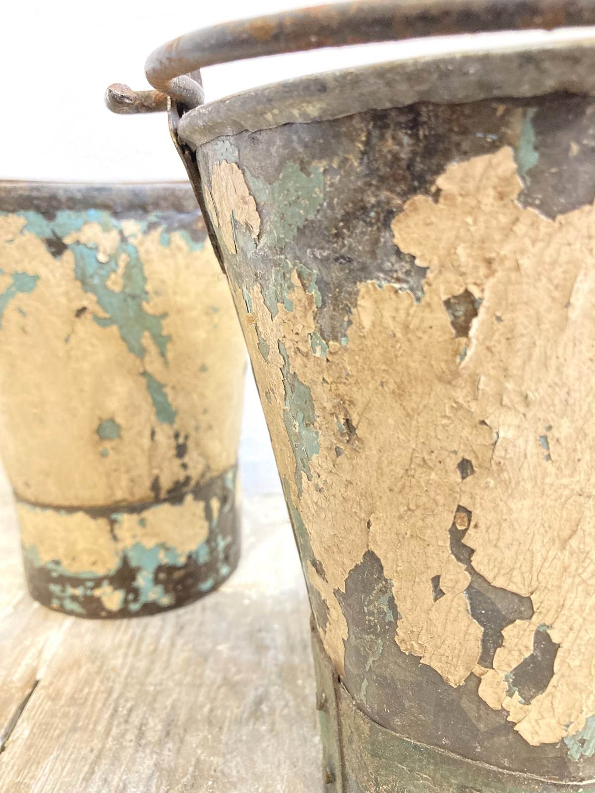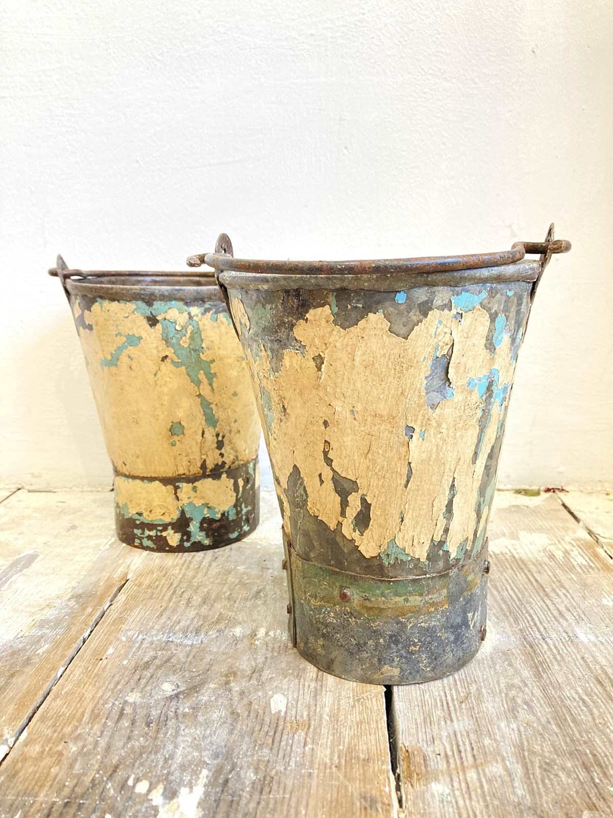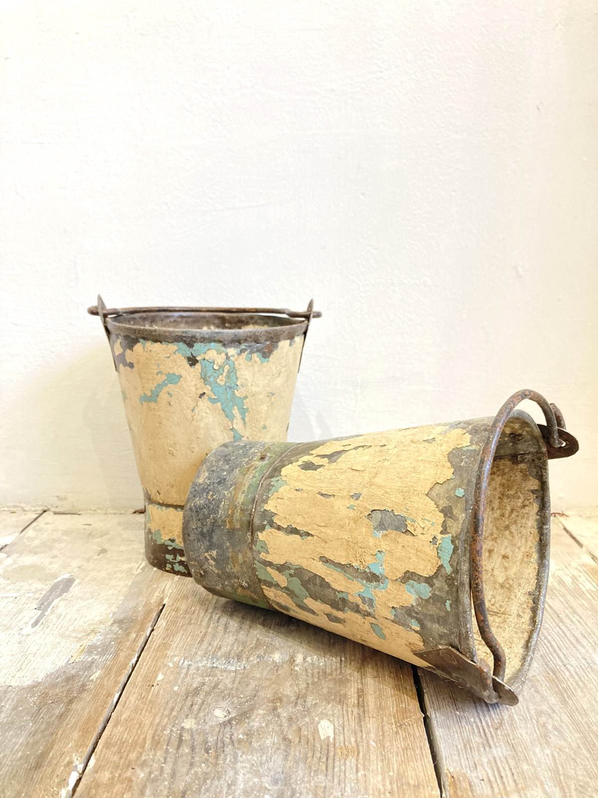 These darling little buckets are just so decorative and useful - for anything from a pot-plant to your wooden spoons in the kitchen! Each has a swing handle and layers of old paint so each one is individual.