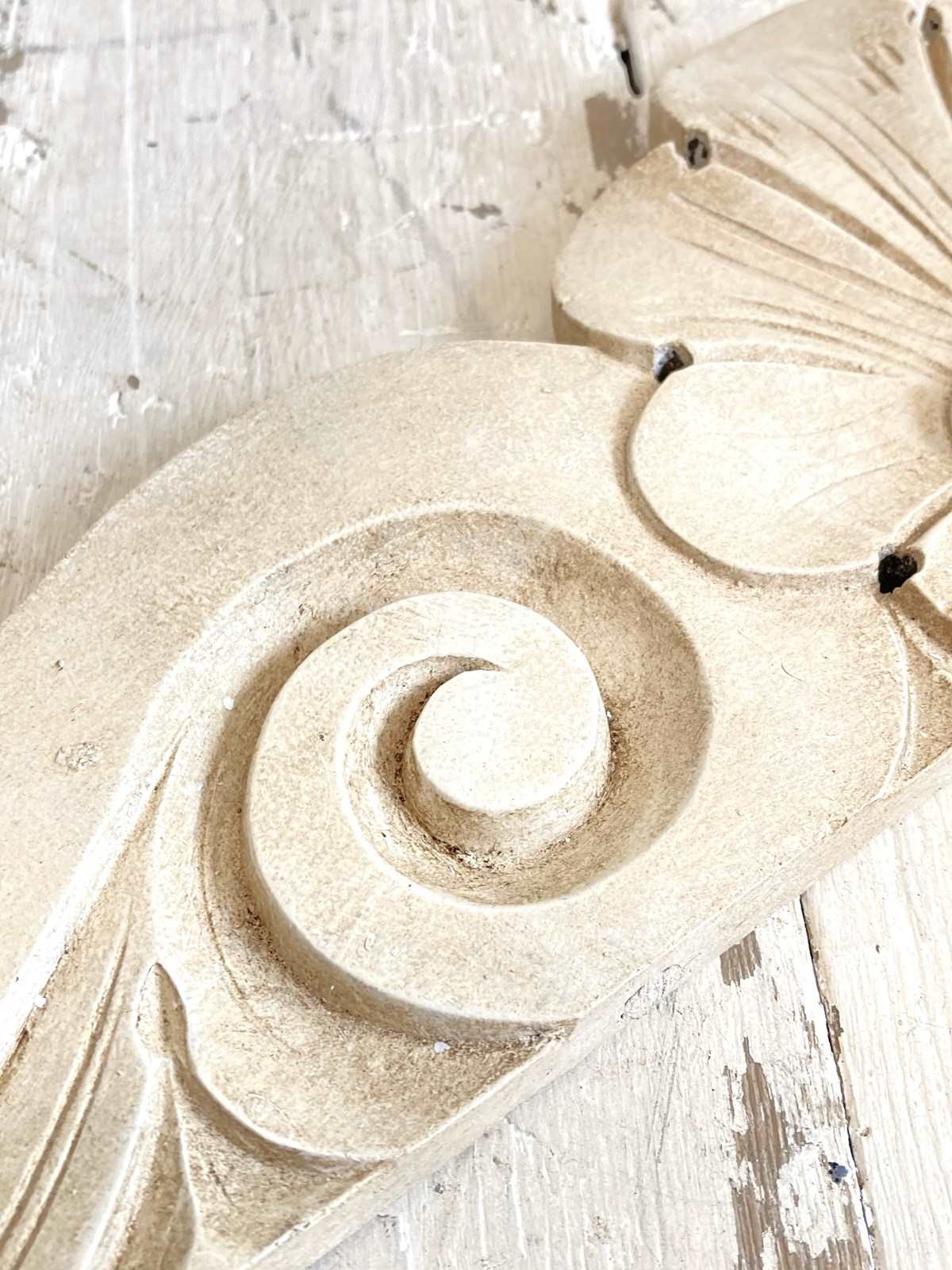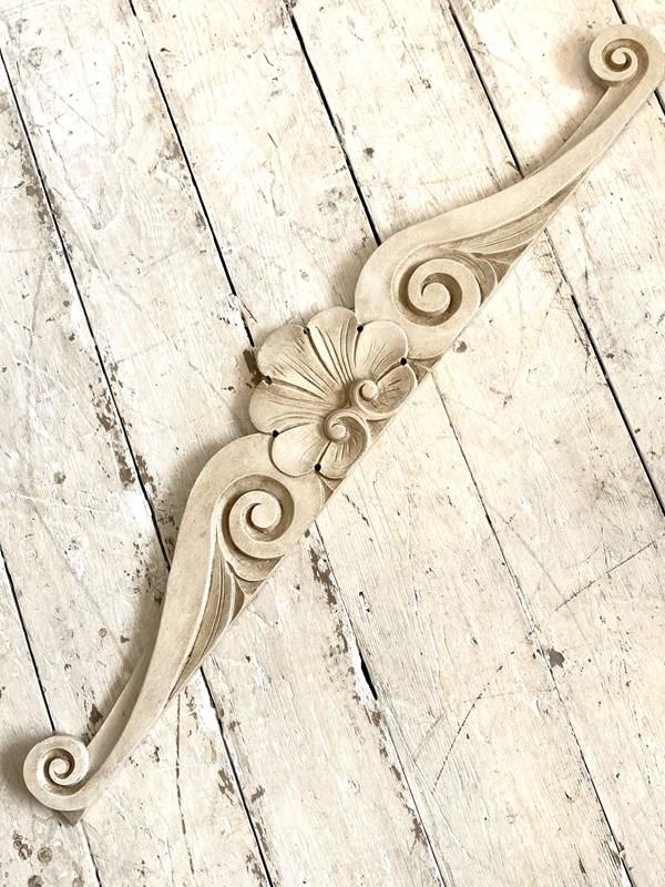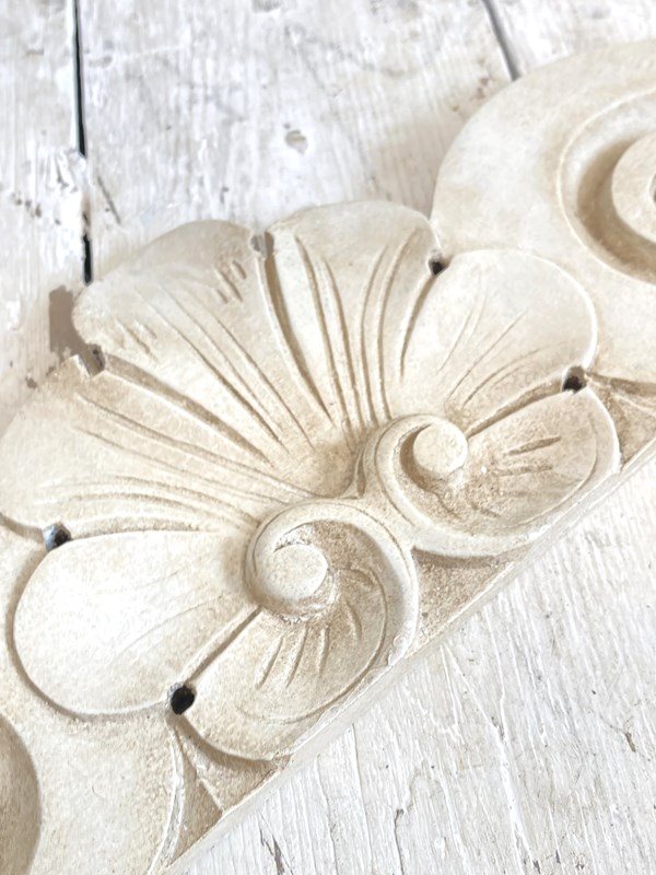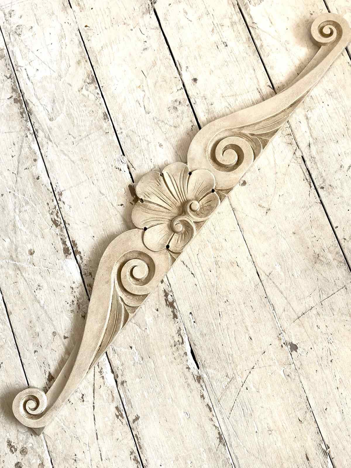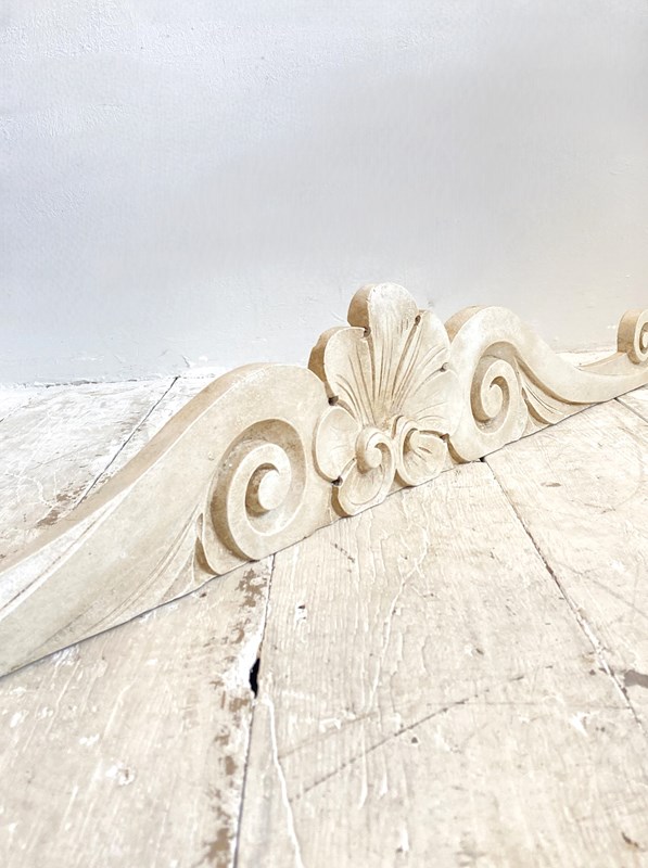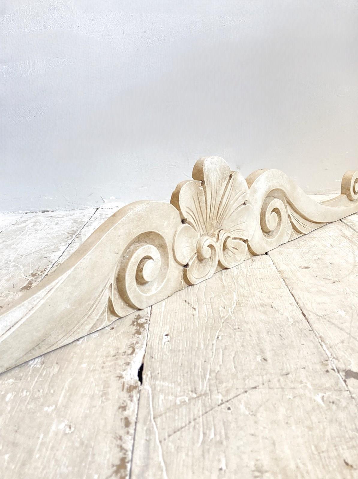 A decorative, hand carved antique French pediment which would originally have been part of a piece of furniture but now looks wonderful mounted above a doorway, mirror or headboard. Painted with a textured and aged finish.