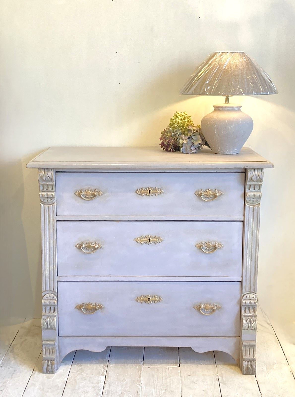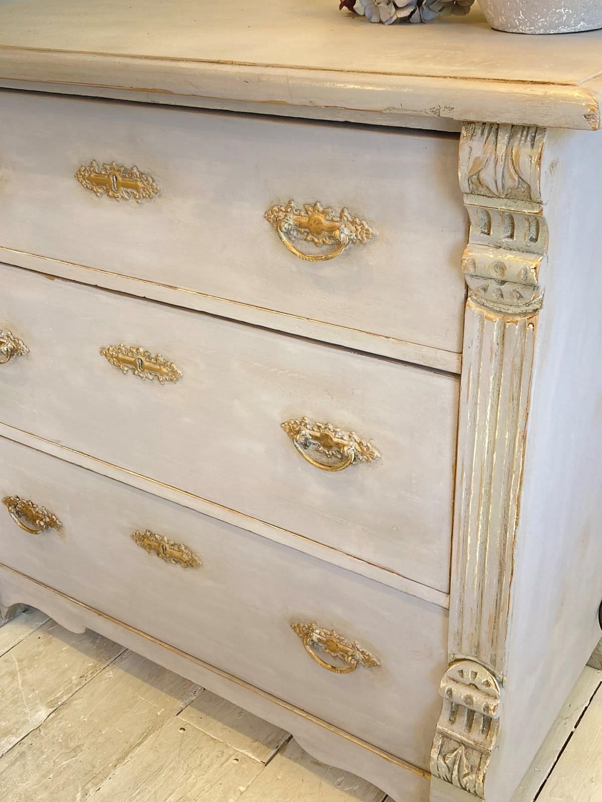 A very pretty painted pine chest of drawers with original ornate brass handles and escutcheons. Dating from the very early 1900's this has attractive carved decoration and fluting on the sides with three evenly sized drawers. The later paint is a bluey-grey and given a gently weathered finish. In great condition with good proportions.