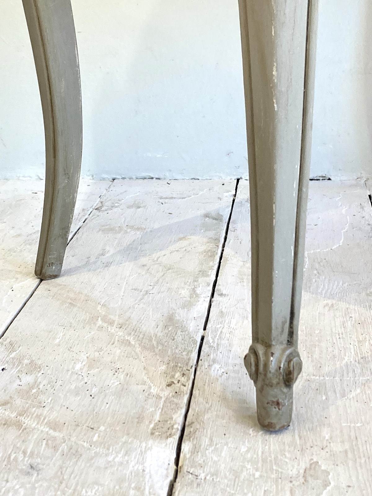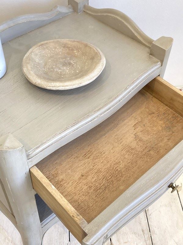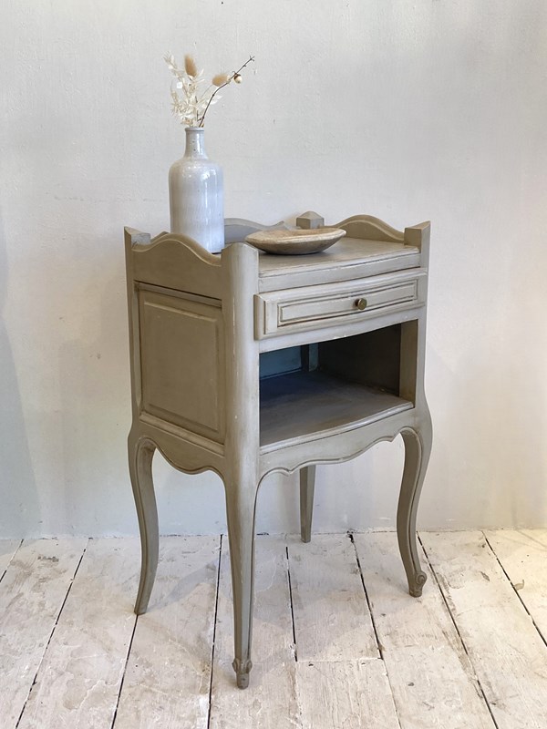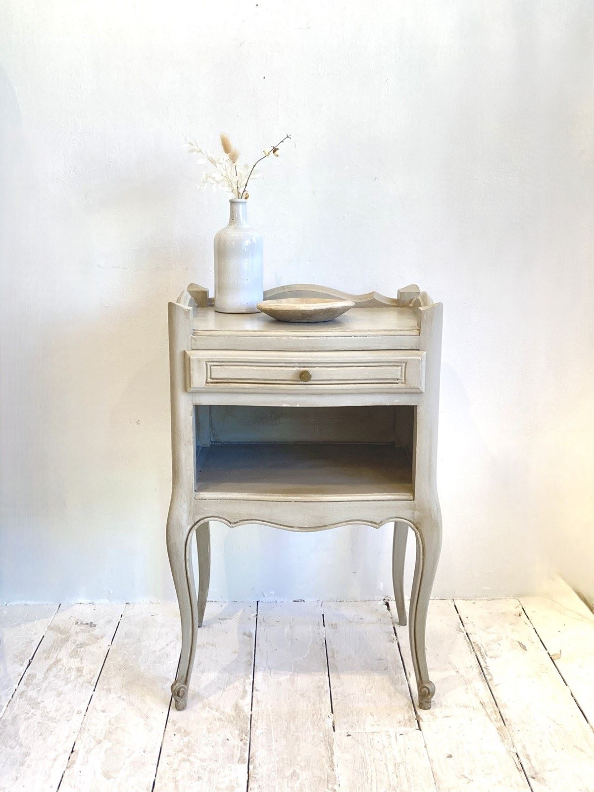A beautiful quality vintage French oak bedside table with single drawer and cubby hole on elegant cabriole legs. This has been later painted in a soft grey.