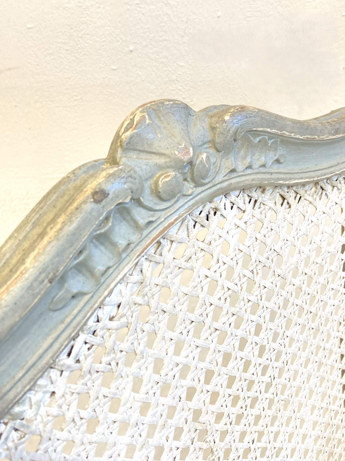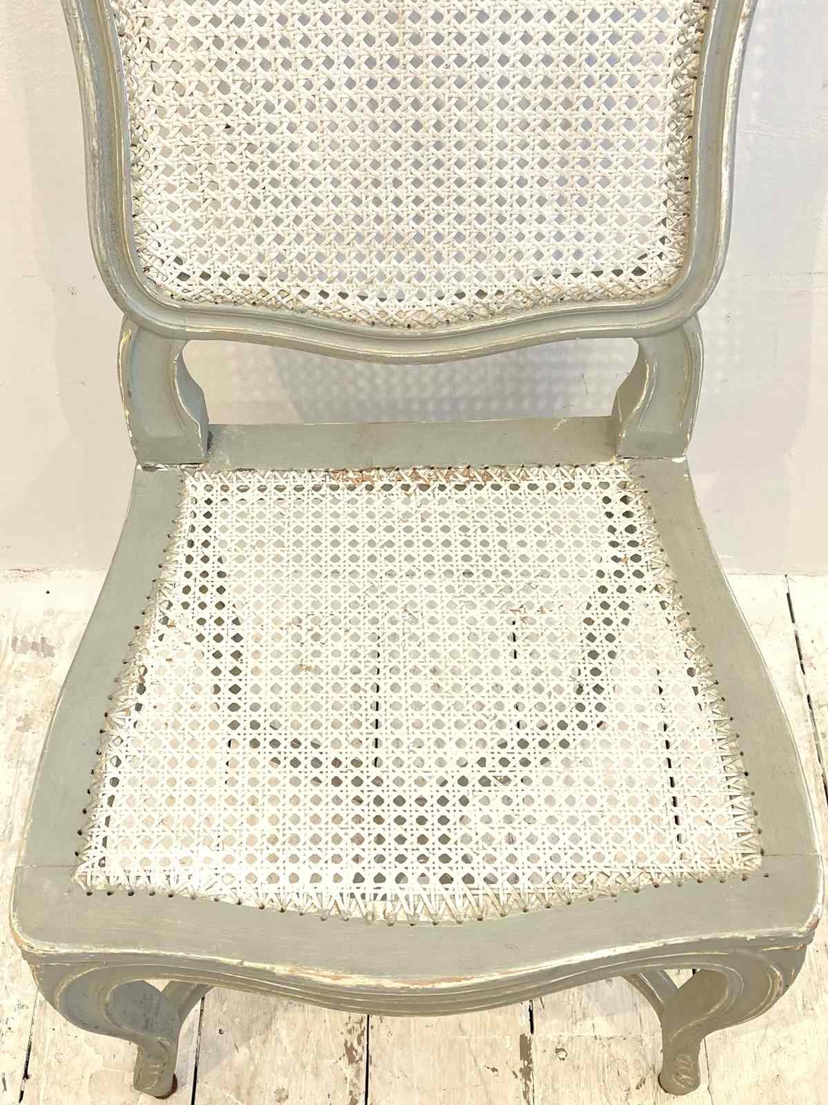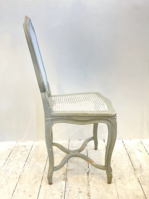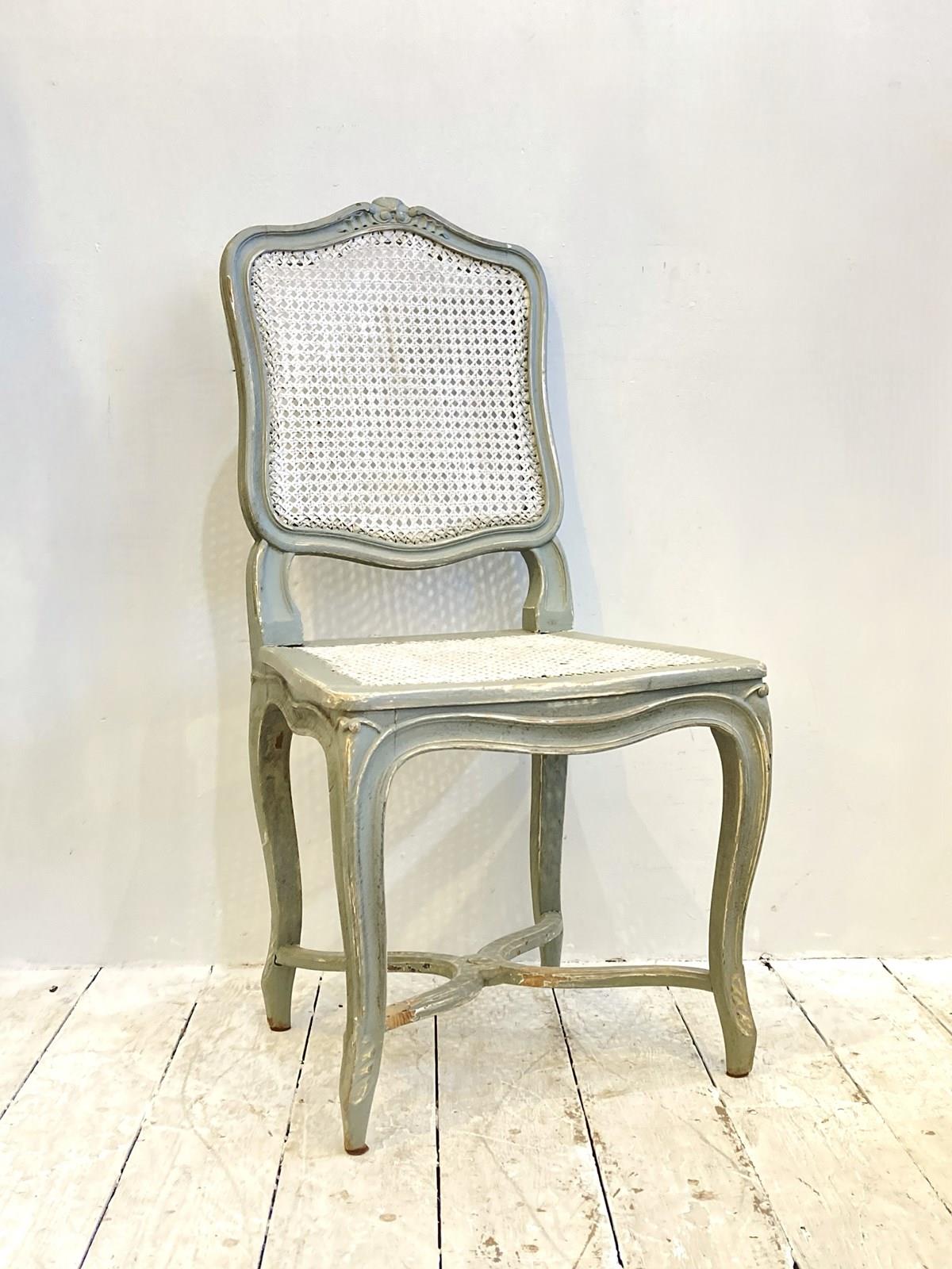 A rather pretty and useful single chair which could be used for a desk or dressing table - made in France from oak, this has been painted a while ago in a mid-grey which has worn over time with use. The caned seat and back are in excellent condition.