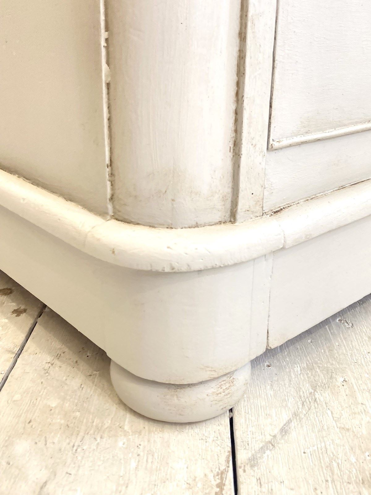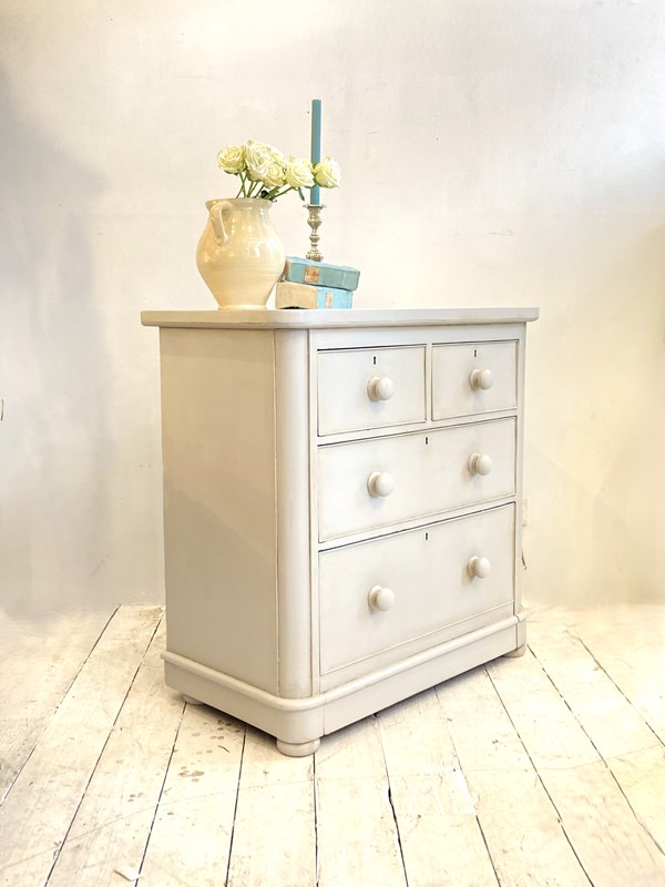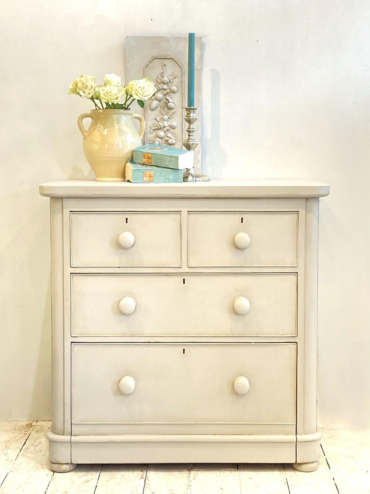 A wonderfully proportioned Victorian chest of drawers with 2 short over 2 long drawers with their original bun knobs. Unlike antique pine examples, this has an impressively deep bottom drawer which provides excellent storage for bulkier items like jumpers or linens. The chest has been fully restored structurally to ensure all drawers run easily and painted in Little Greene Paint Co 'French Grey' which is a soft neutral.