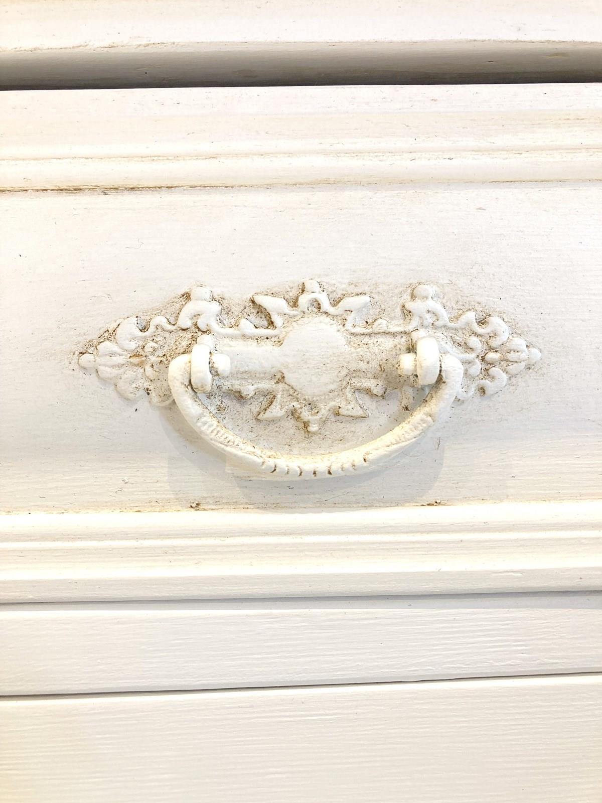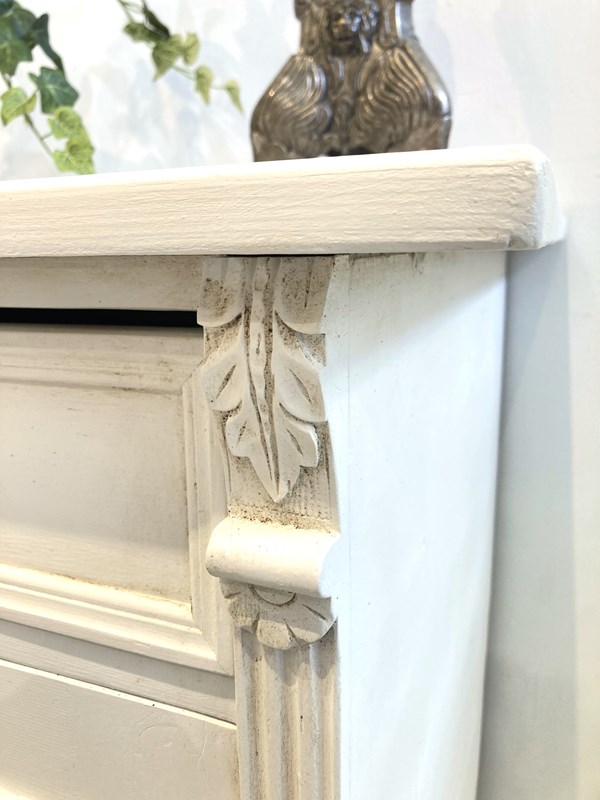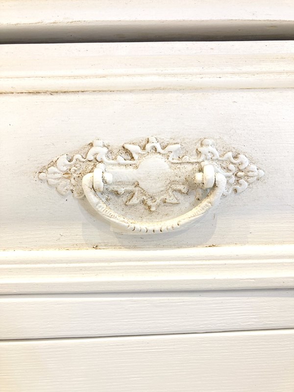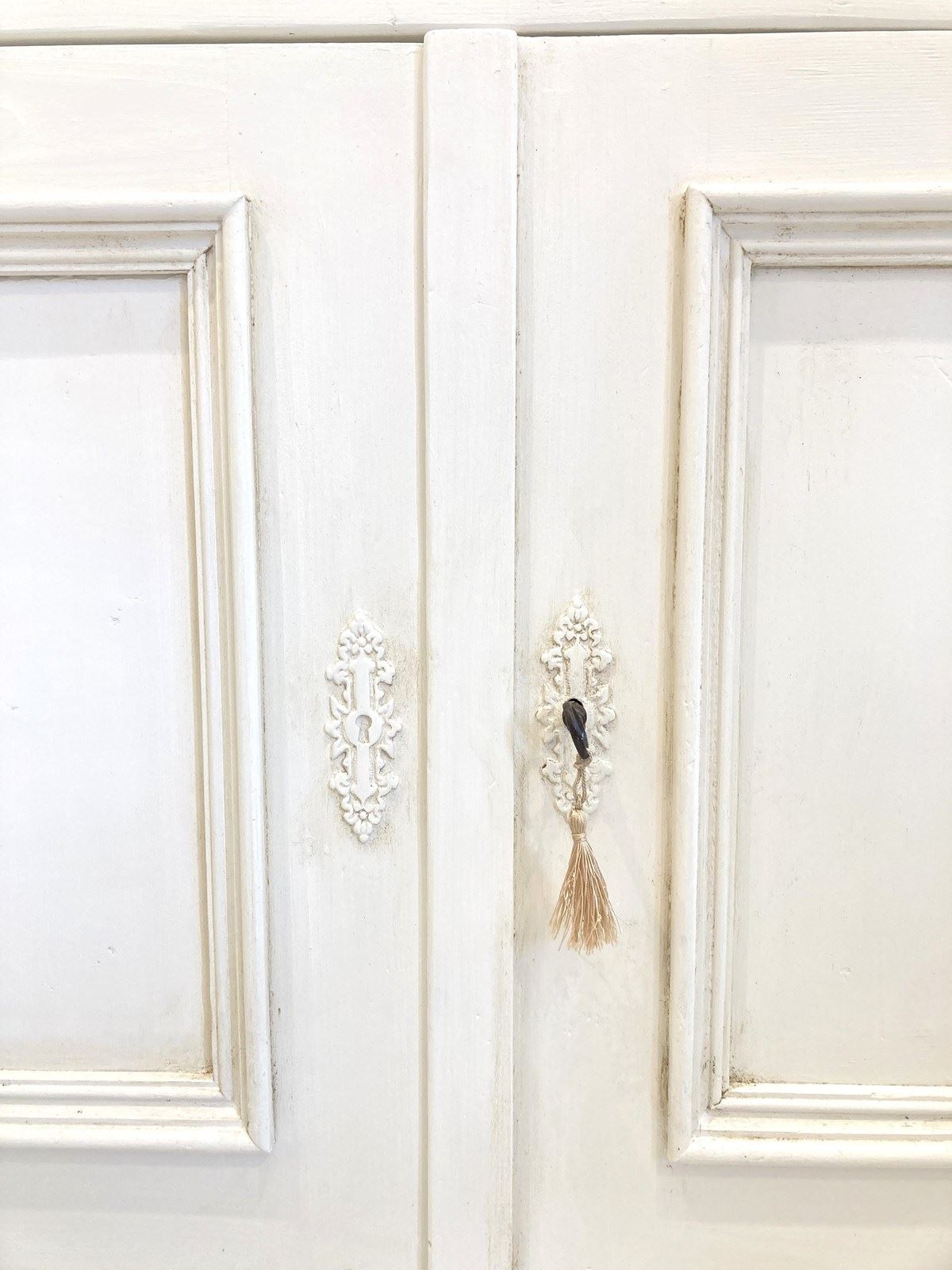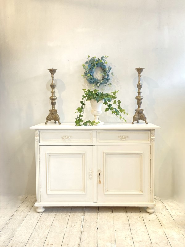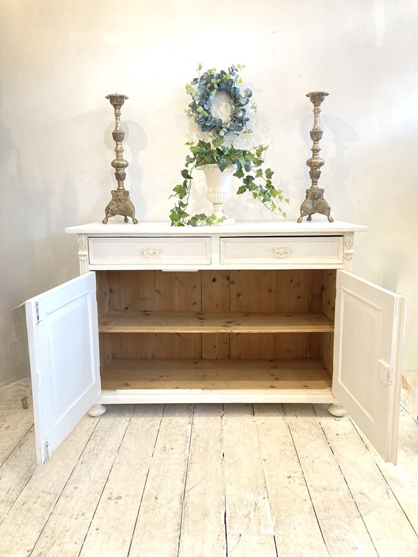 This C19th pine sideboard or buffet has just the most wonderful proportions - wide and shallow which is perfect for storage; there are two drawers at the top then a large cupboard with a single fixed shelf. The panelled doors secure with two latches on the left and a working lock and key on the right, the escutcheons match the drawer handles which is rather nice. There's simple reeded decoration down either sides below a carved scroll at the top on either side. In lovely condition - really clean with no prior woodworm. Painted in Little Greene Paint Co 'Slaked Lime' which is a soft white.