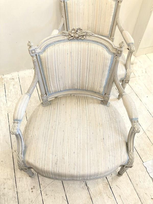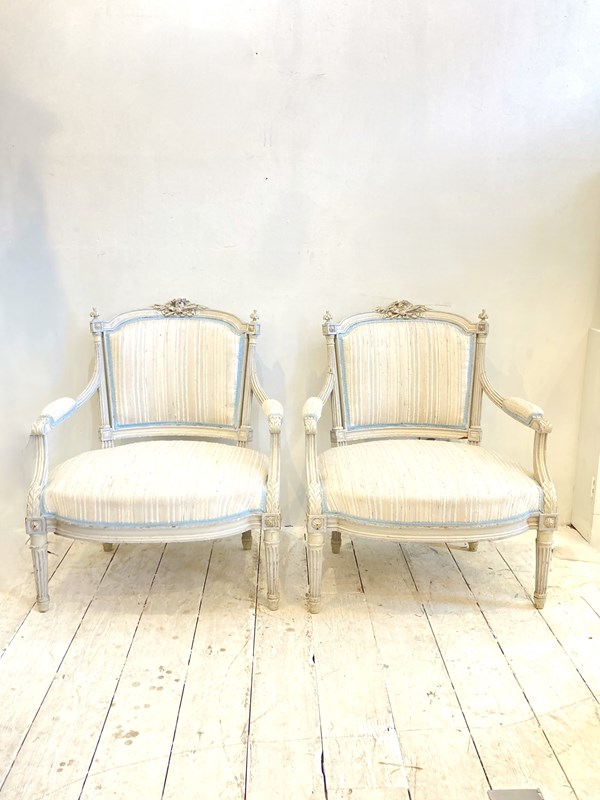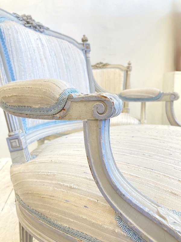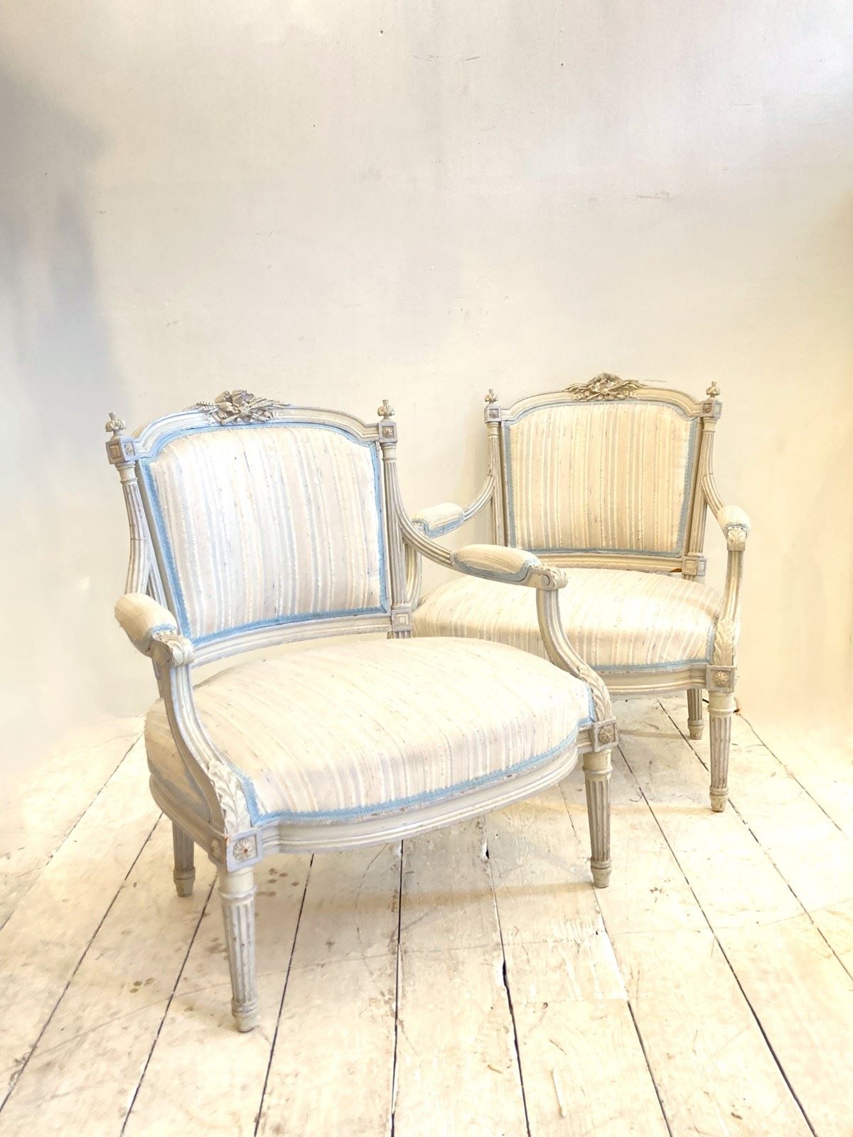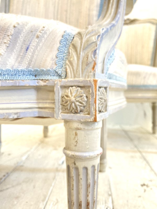 A genuinely beautiful pair of C19th French fauteuil with fluted tapered legs, carved rosettes and the original soft grey paint which has authentically weathered with age. The quality of the carving, especially on the cresting rail is fabulous - ears of wheat tied with a bowed ribbon may have been commissioned specifically for a family for whom this was pertinent as it's not a common decorative feature.