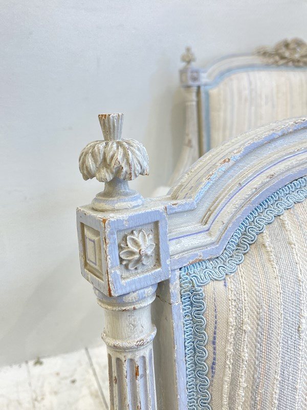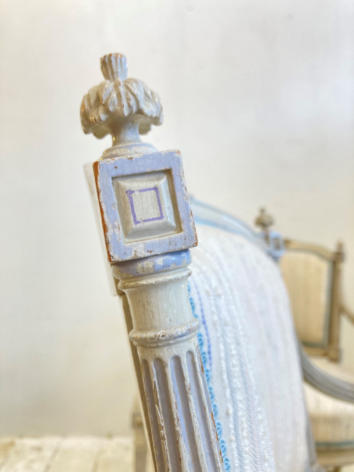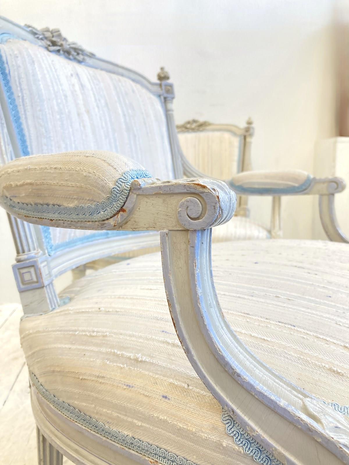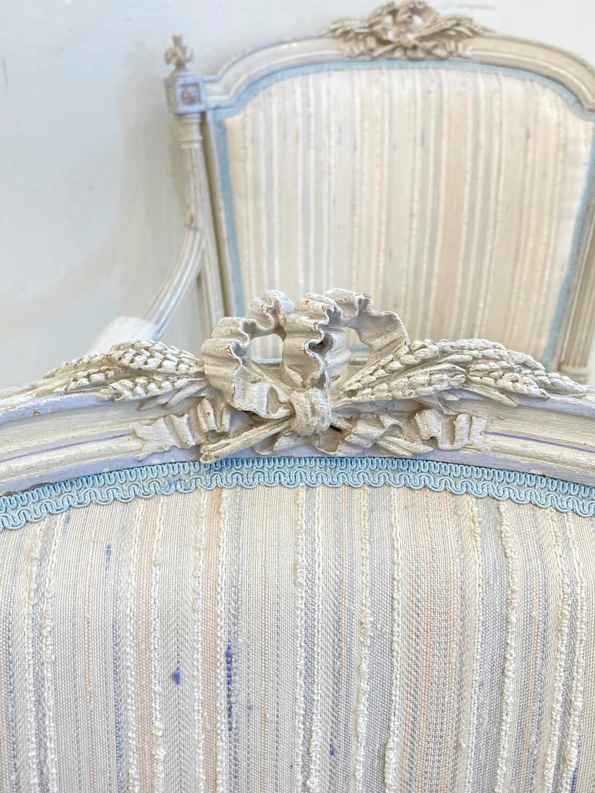 Upholstered in a wonderful, textural blue & white stripe with a blue braided finish which echoes the suble blue painted details on the frame - the upholstery is not new but is in very good and serviceable condition. The generously wide seats are very well sprung and comfortable and there's no movement in the frame.