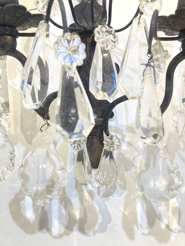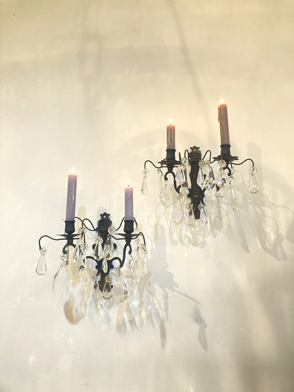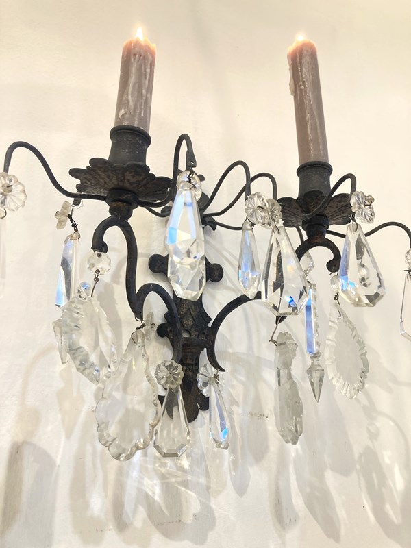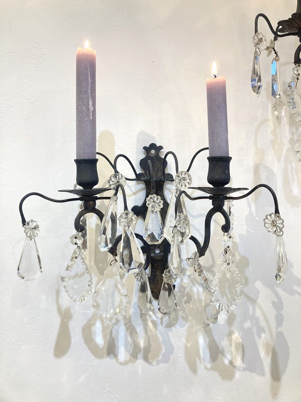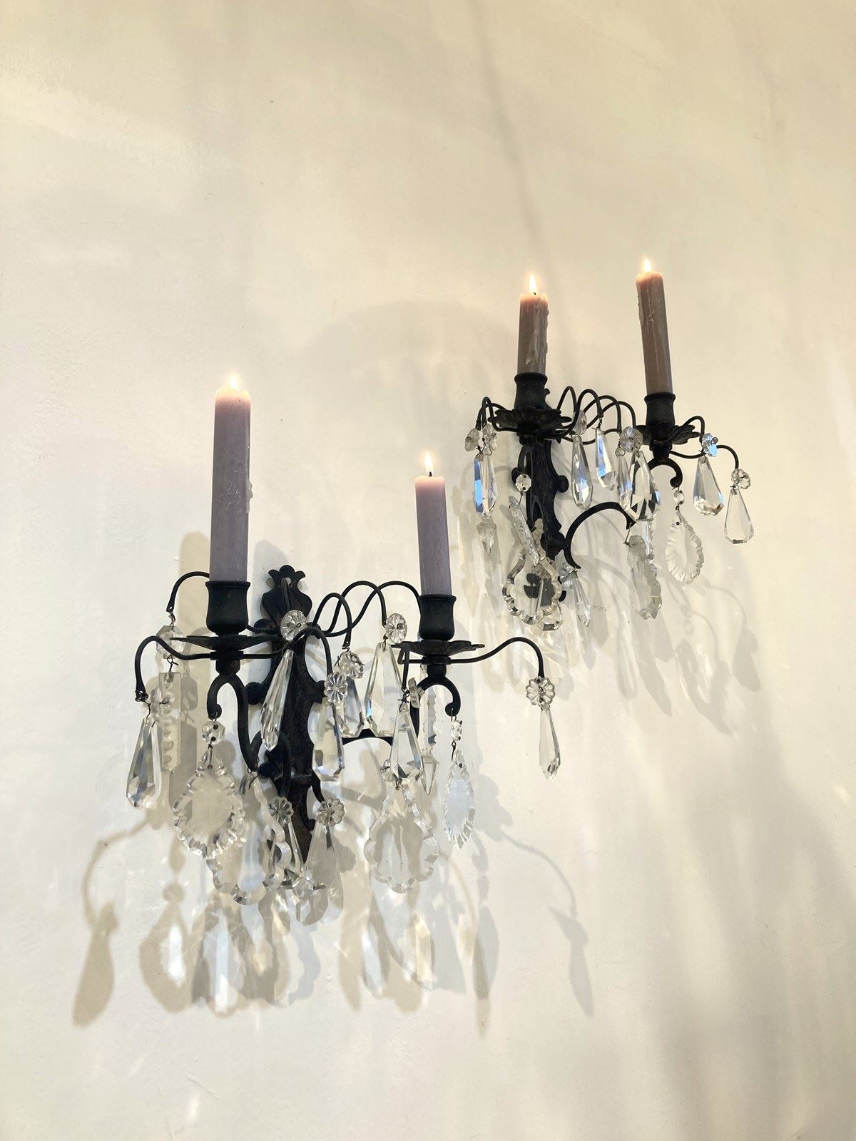 A pretty pair of vintage French 2 arm candle sconces dressed with an array of crystal pear & Albert drops mixed with glass flower buttons and old faceted flat-backs. These have been used and show signs of their age with the wire arms a little bent and wavy but this does add to the rustic, relaxed French country look.
