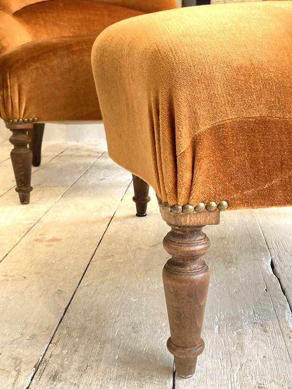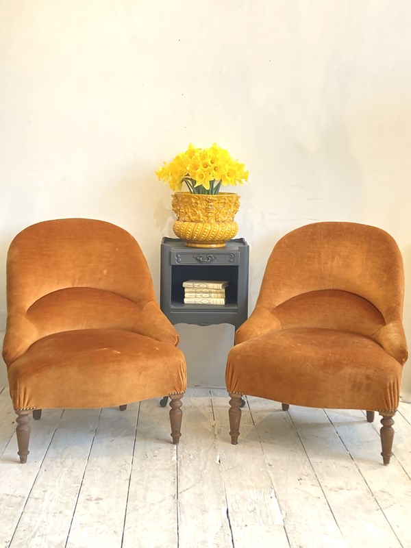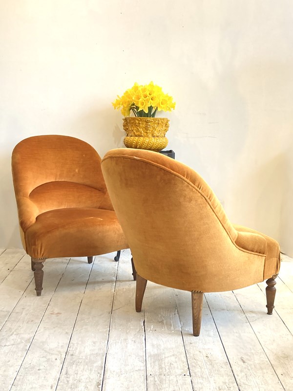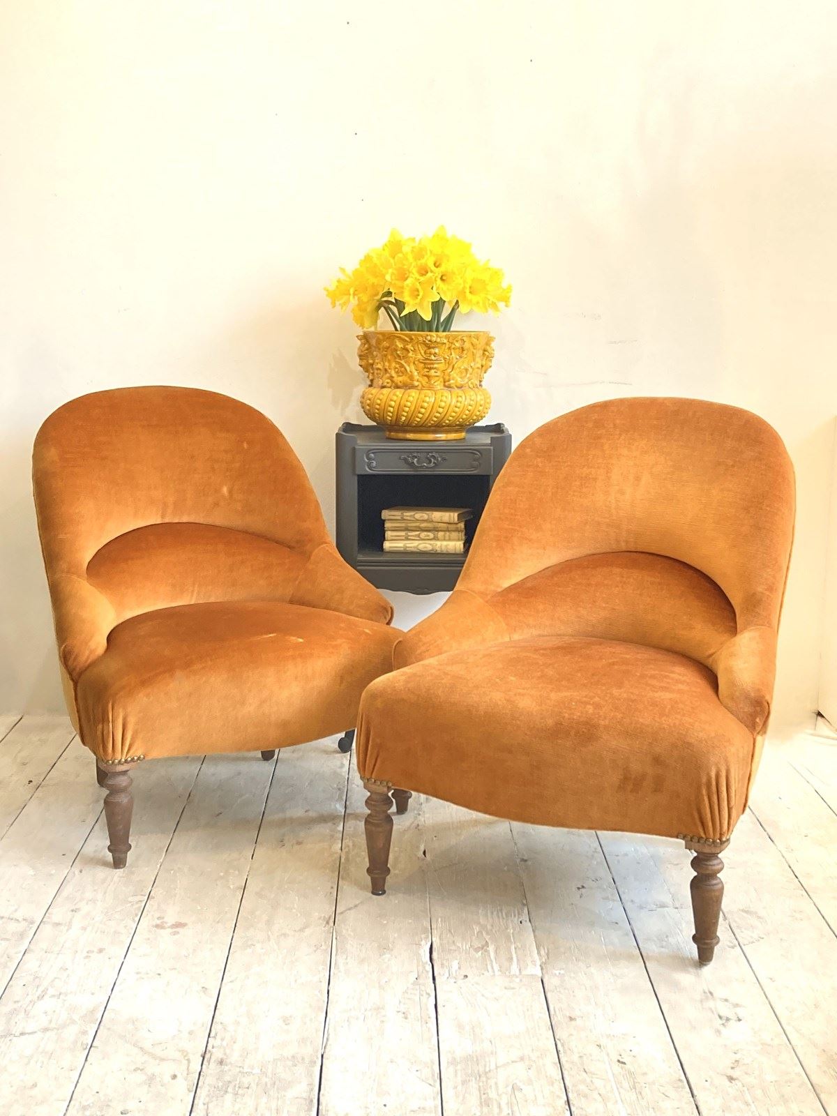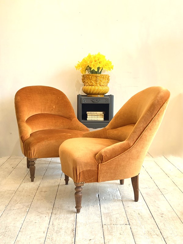 A really stunning pair of antique French Napoleon III tub or crapaud chairs on turned legs. They're super-comfortable and structurally in excellent condition but the real bonus is the old velvet upholstery which is the most wonderful warm ochre colour and in very good condition - there's a tiny spot of missing pile on the seat of one (pictured) but otherwise they're absolutely ready to enjoy as they are.