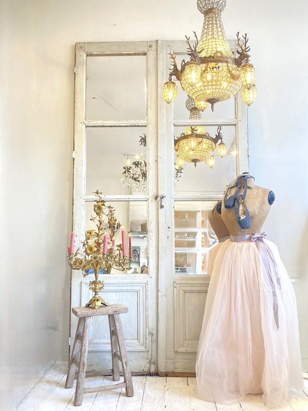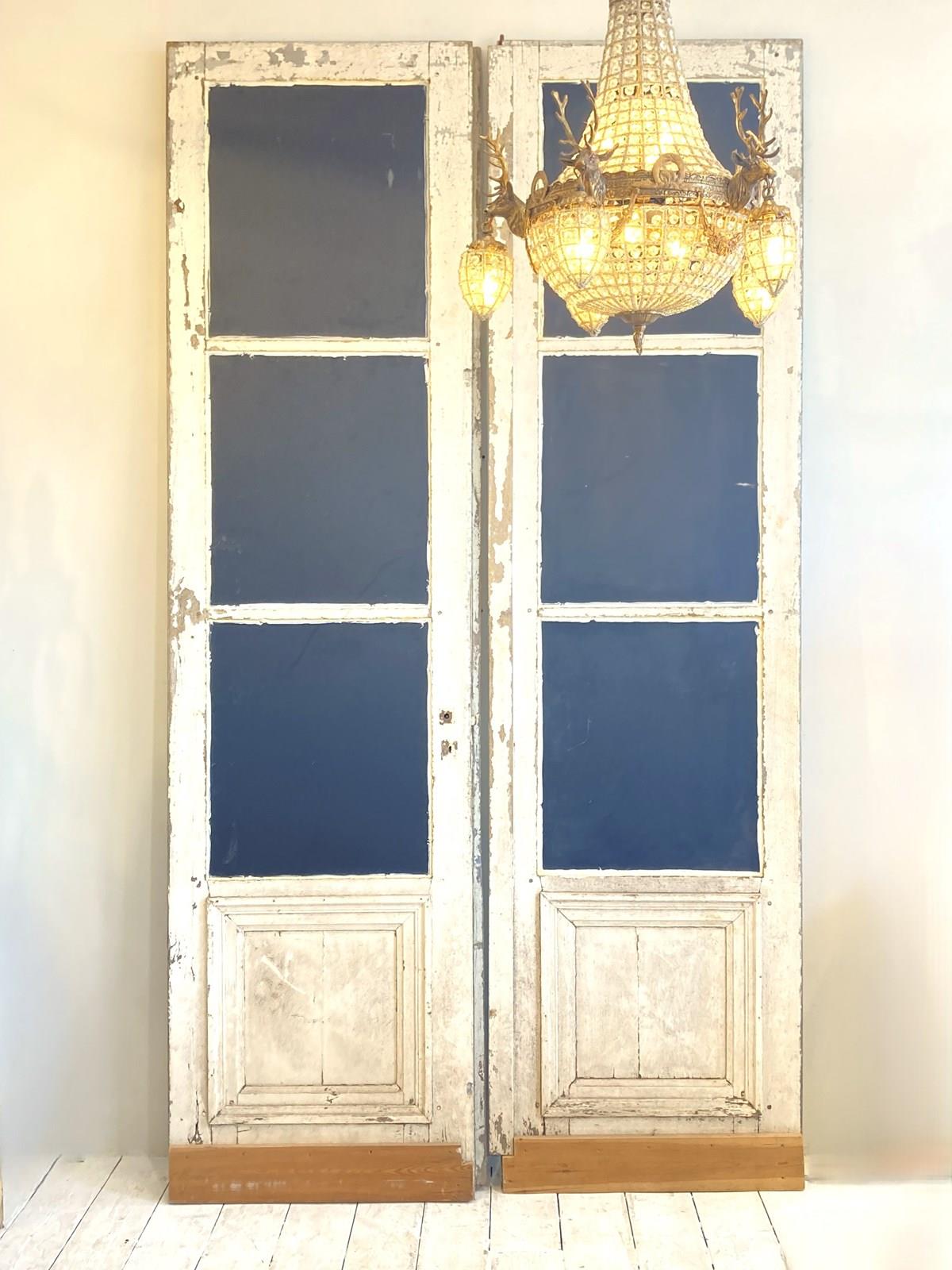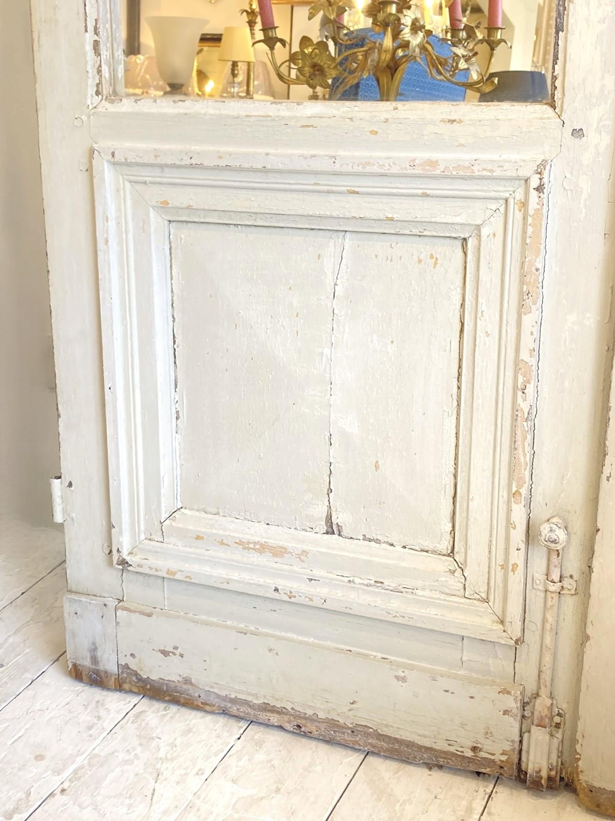 A stunning pair of oversized antique doors which have the top three panels on both sides mirrored, retaining the bottom wooden panel which has the most wonderful original weathered old paint. The doors have their original hardware which adds to their decorative charm but it's the sheer scale of these that makes such an impact.