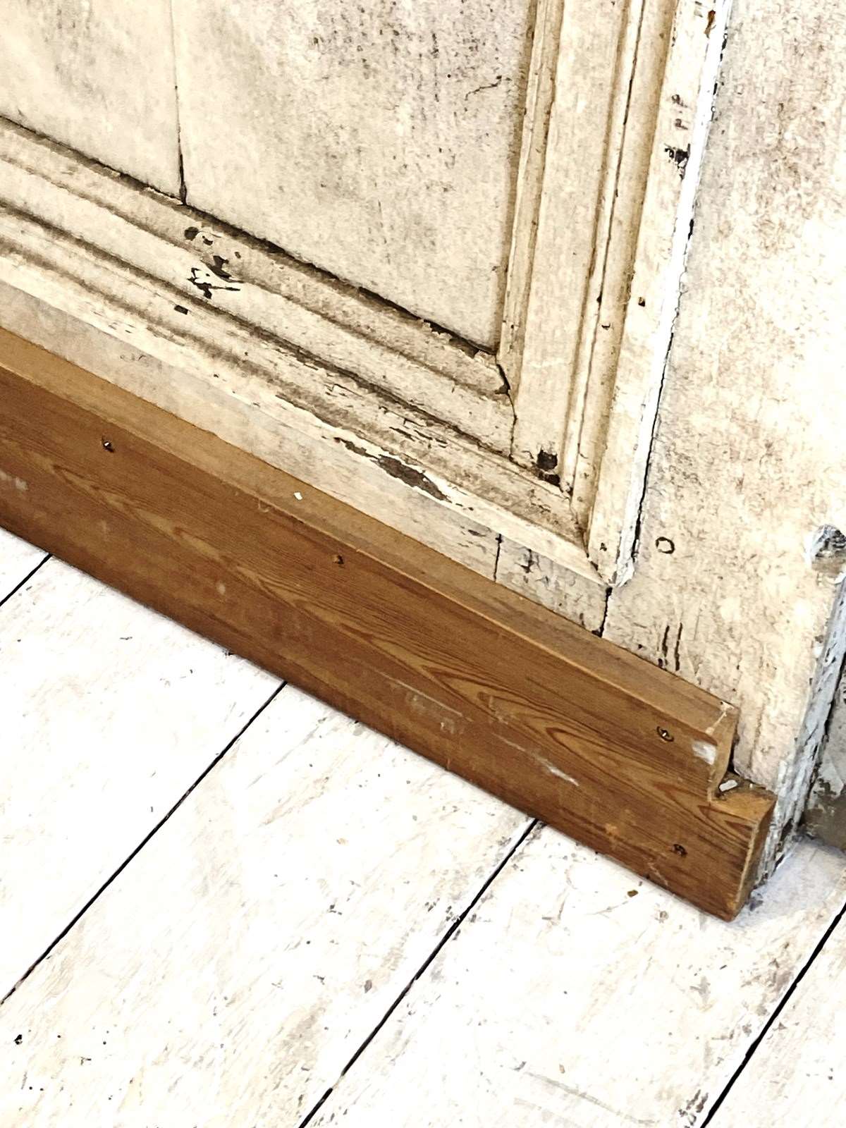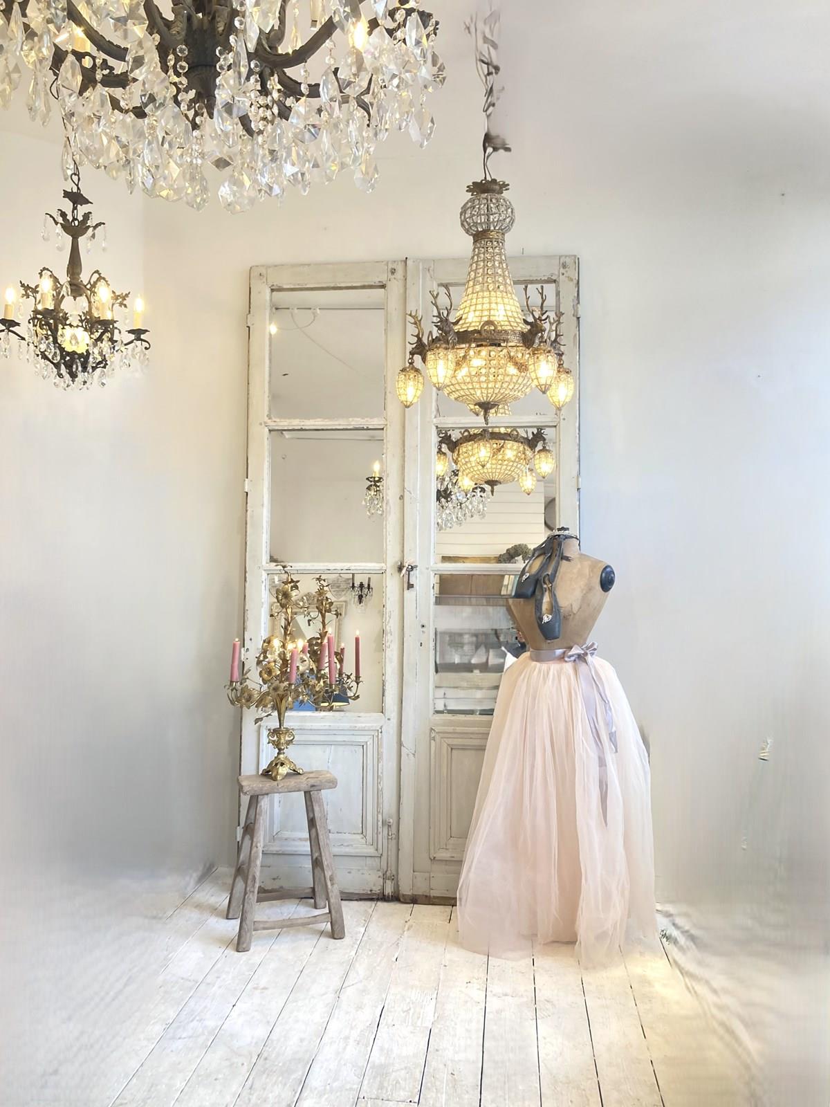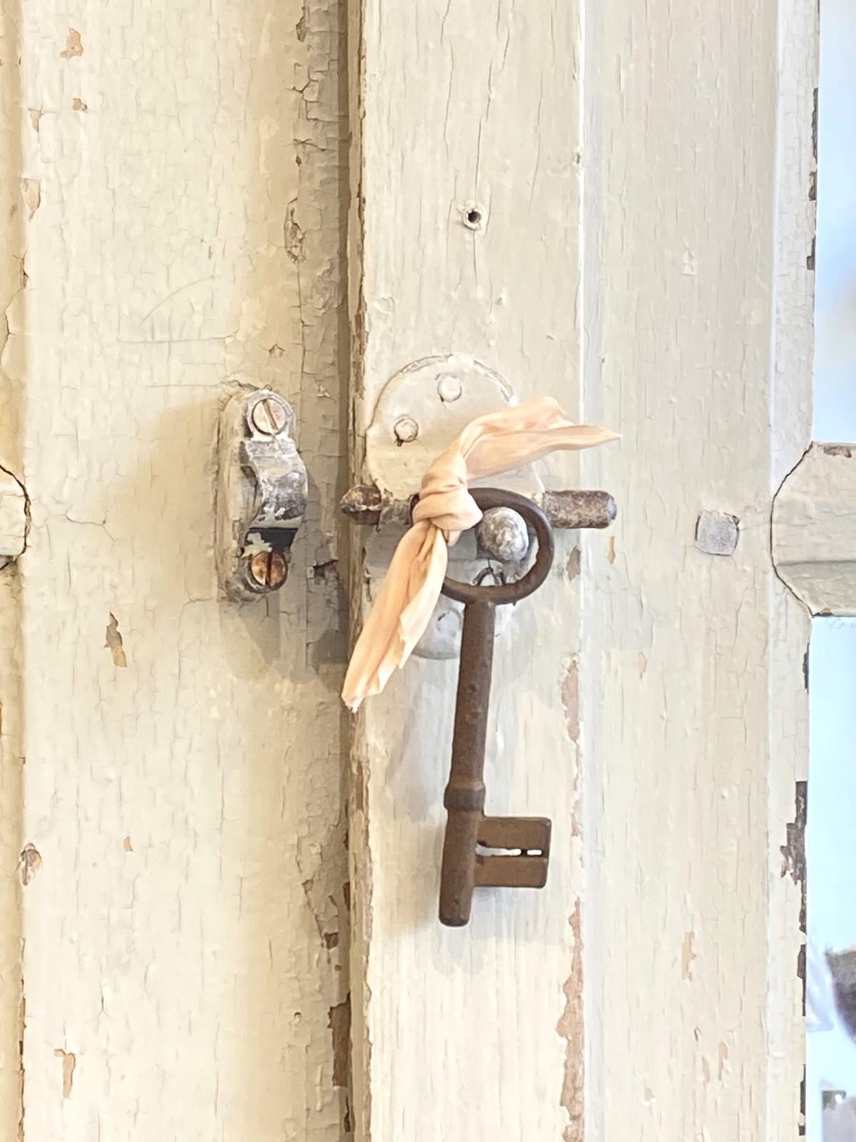A stunning pair of oversized antique doors which have the top three panels on both sides mirrored, retaining the bottom wooden panel which has the most wonderful original weathered old paint. The doors have their original hardware which adds to their decorative charm but it's the sheer scale of these that makes such an impact.