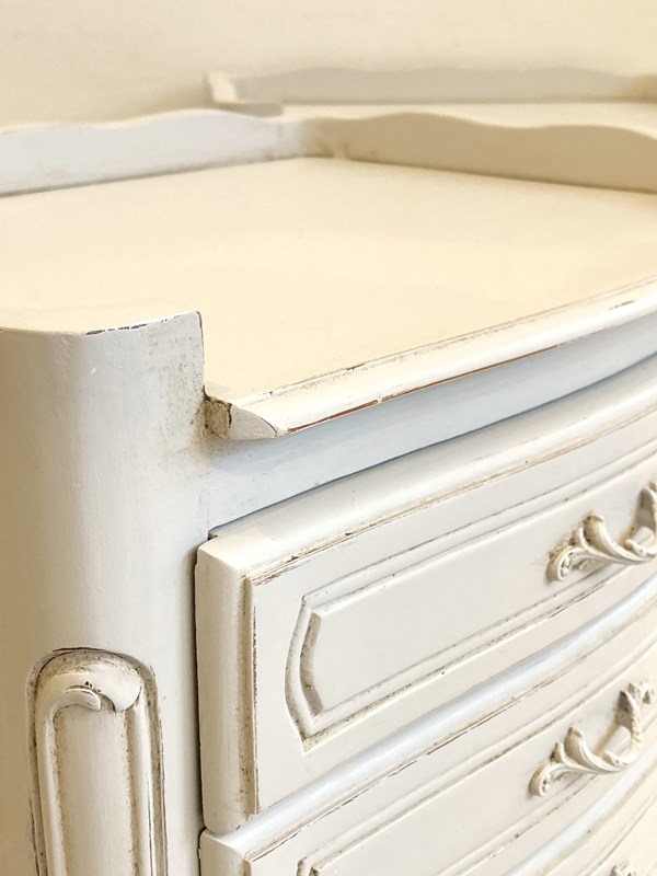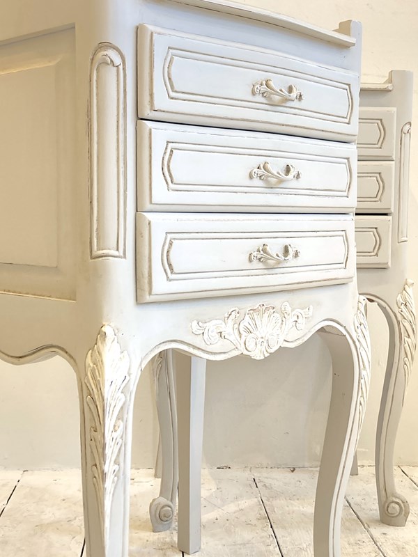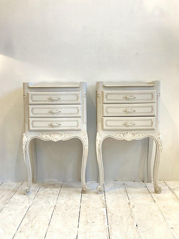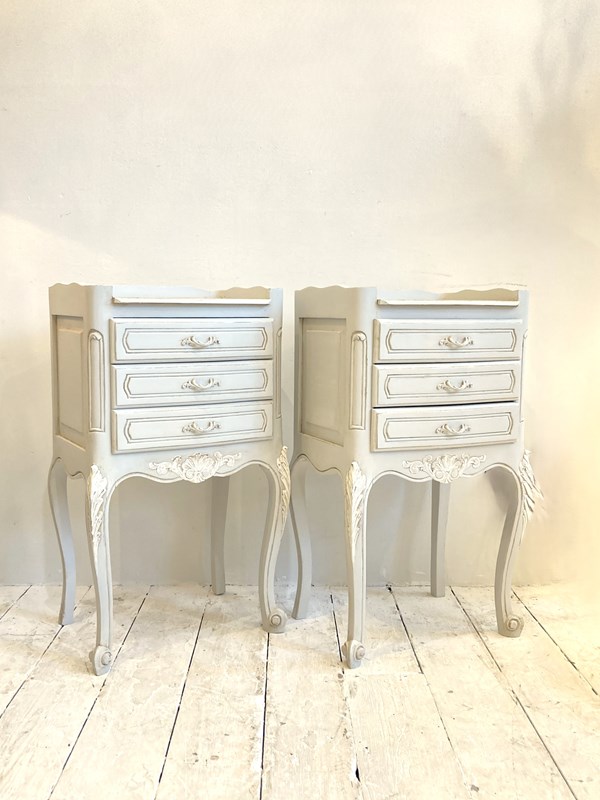 A pretty pair of vintage French bedside tables with three drawers. Painted in Little Greene Paint Co 'French Grey', we've picked out the beautifully carved detail in white and then given it a weathered finish. These don't have a great deal of age but are lovely quality and weight.