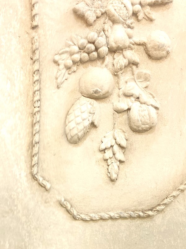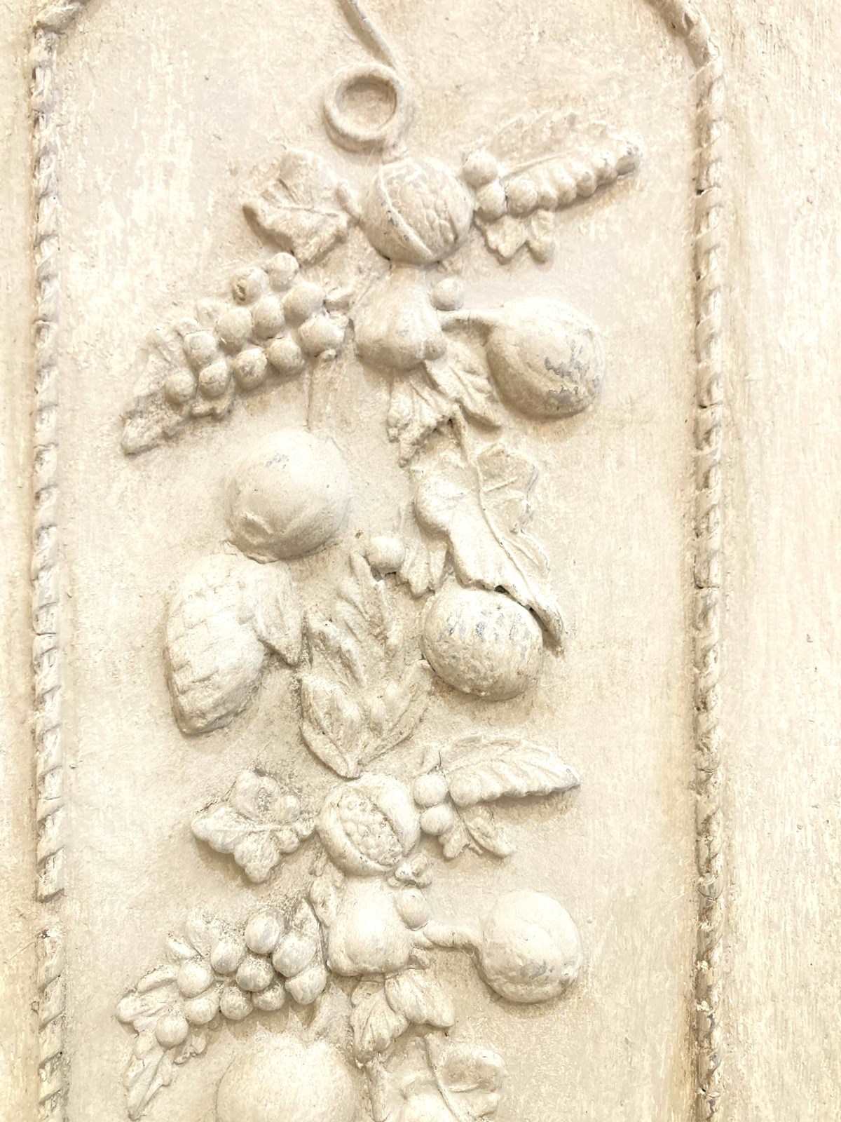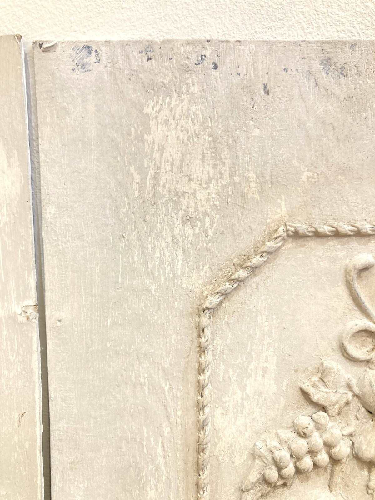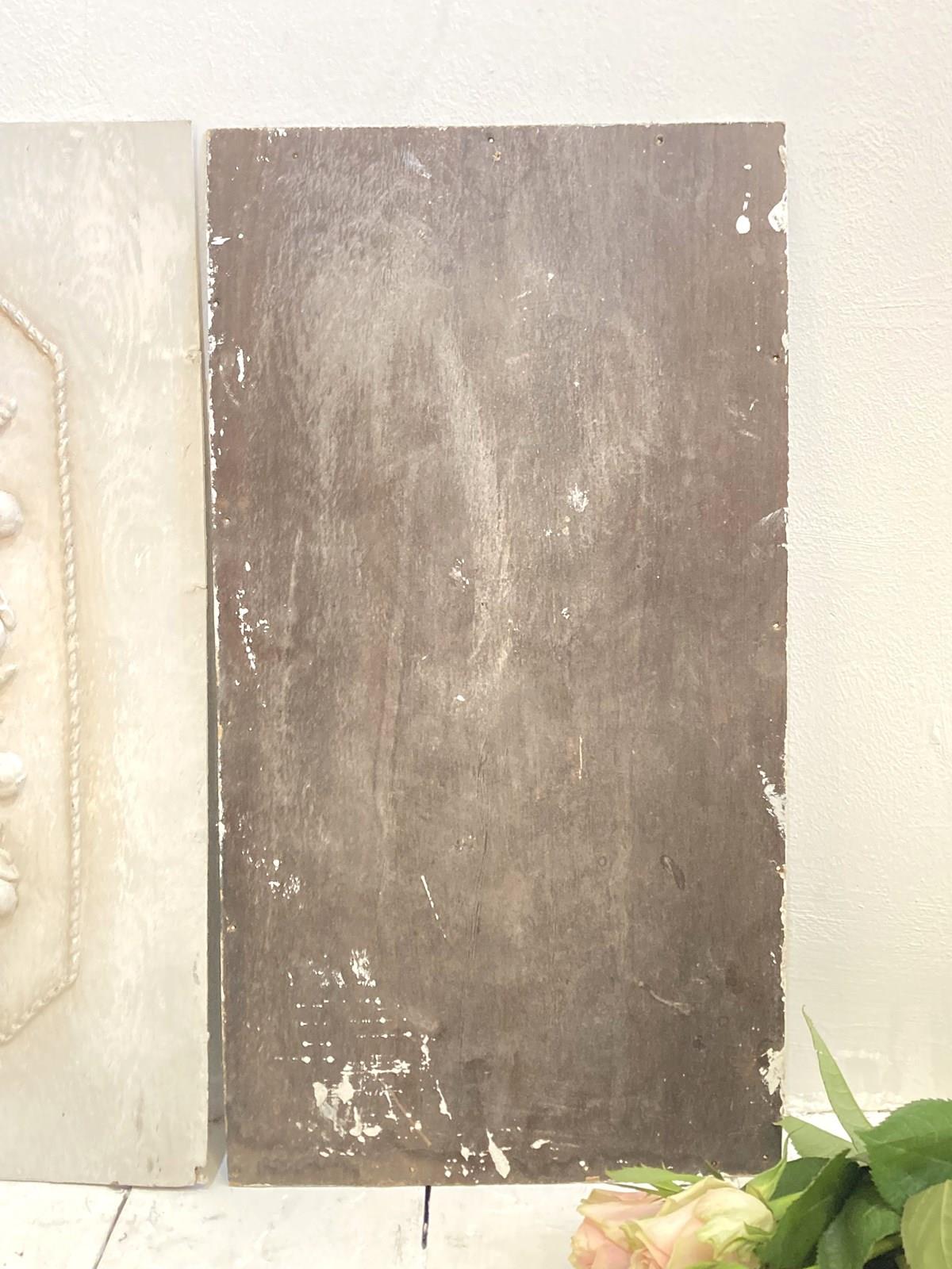 A very decorative pair of antique panels with applied carved detail which would have been part of a larger piece at some point. Painted in layers of white and grey paint and on a very thin backboard, these would benefit from mounting or framing to hang. c.1900.