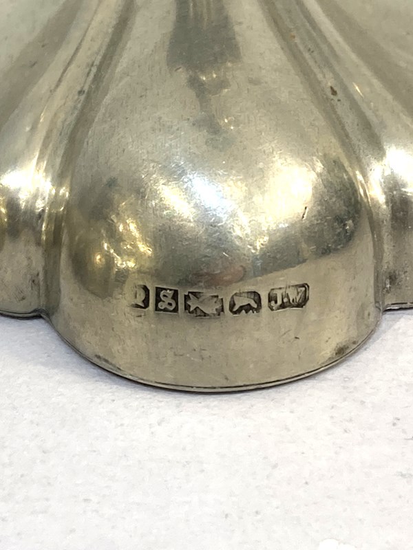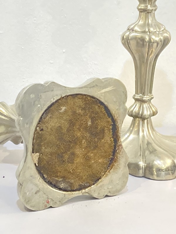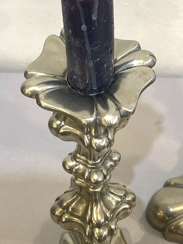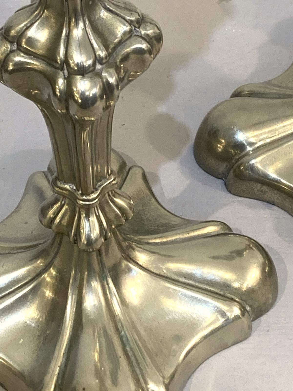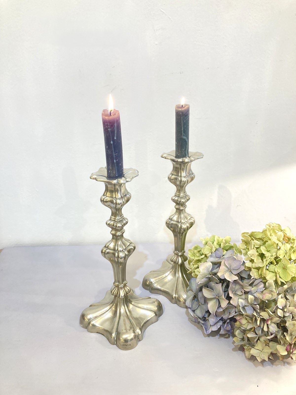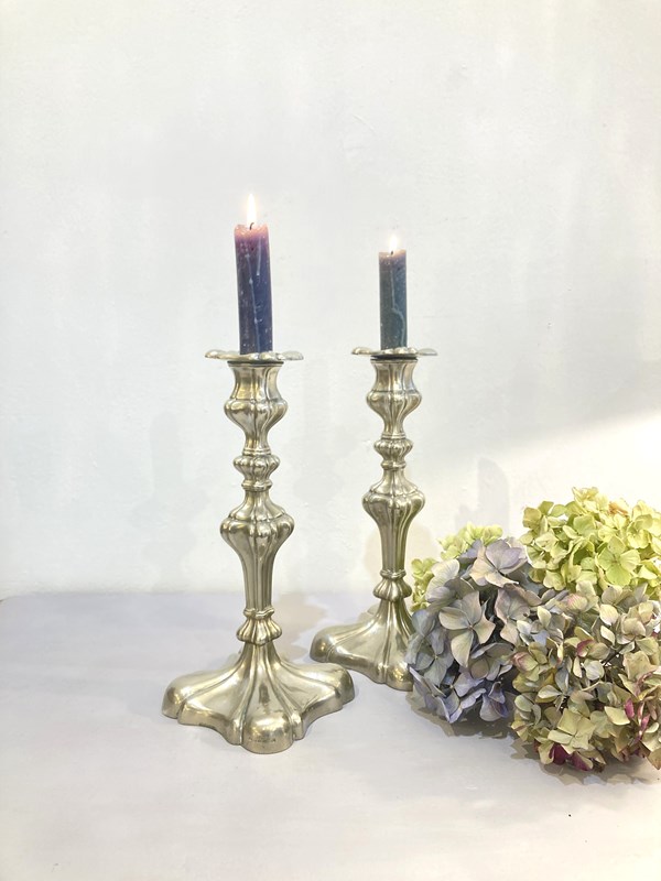 An elegant pair of silver plated candlesticks c.1880 in lovely condition. They're both stamped with a makers mark and have removable cups at the top for cleaning. They have an early Georgian style with petal formed square base and candleholder, and flowing but understated design.