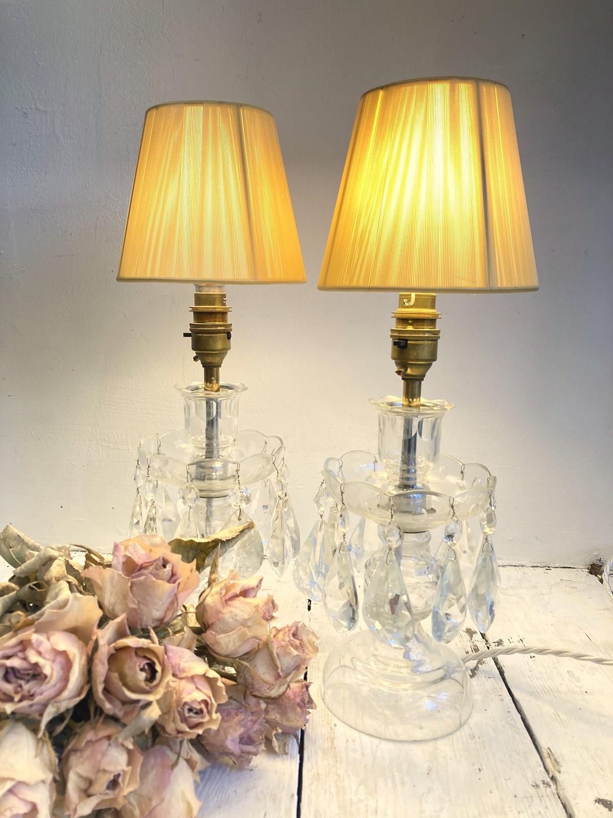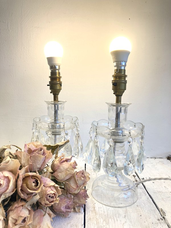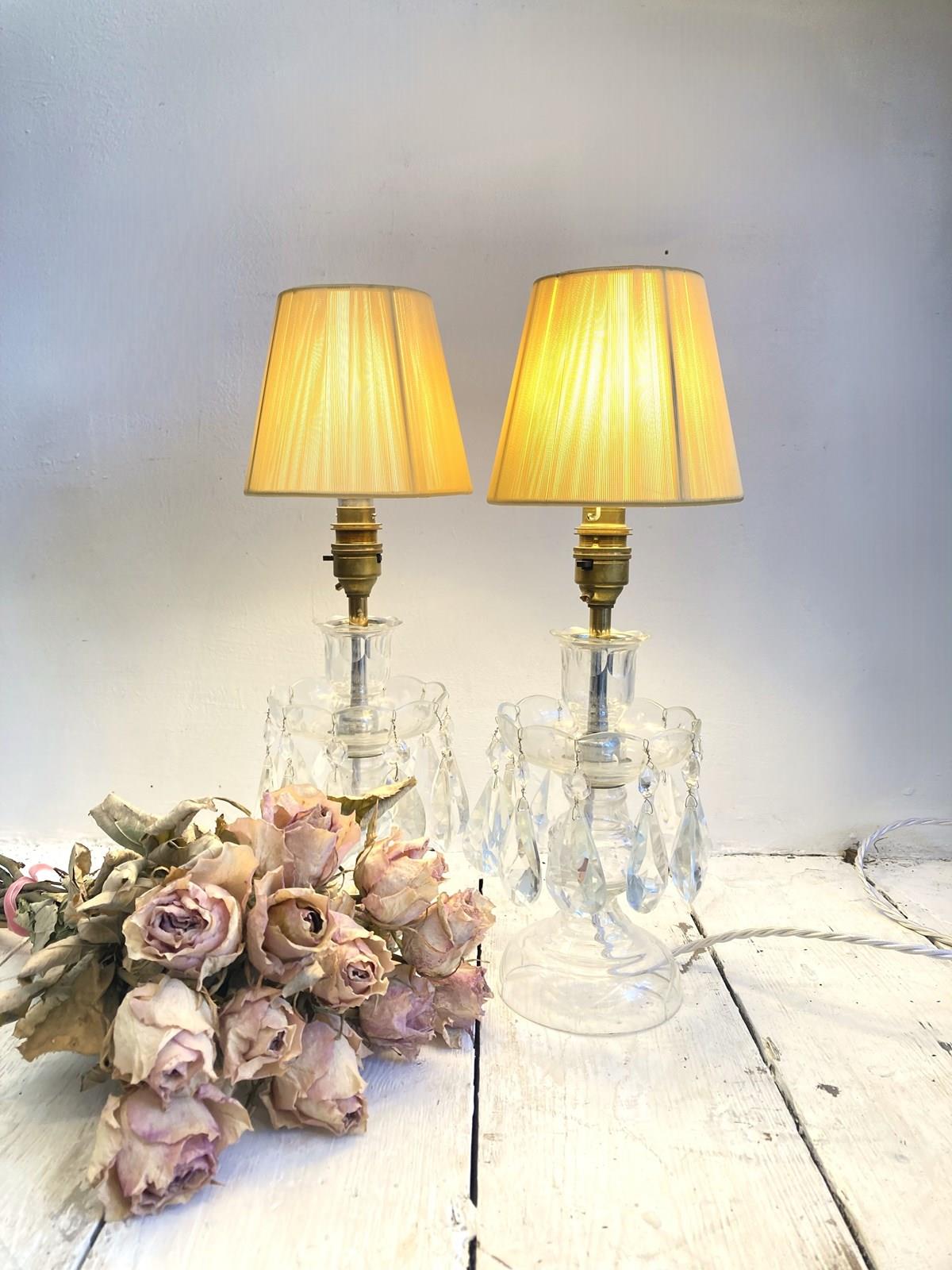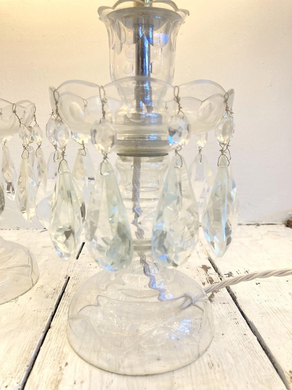 A sweet little pair of vintage glass table lamps with a cut glass inverted bell base and a glass cup with ogee ground decoration dressed with vintage crystal pear-shaped drops. Elegant and glamorous.