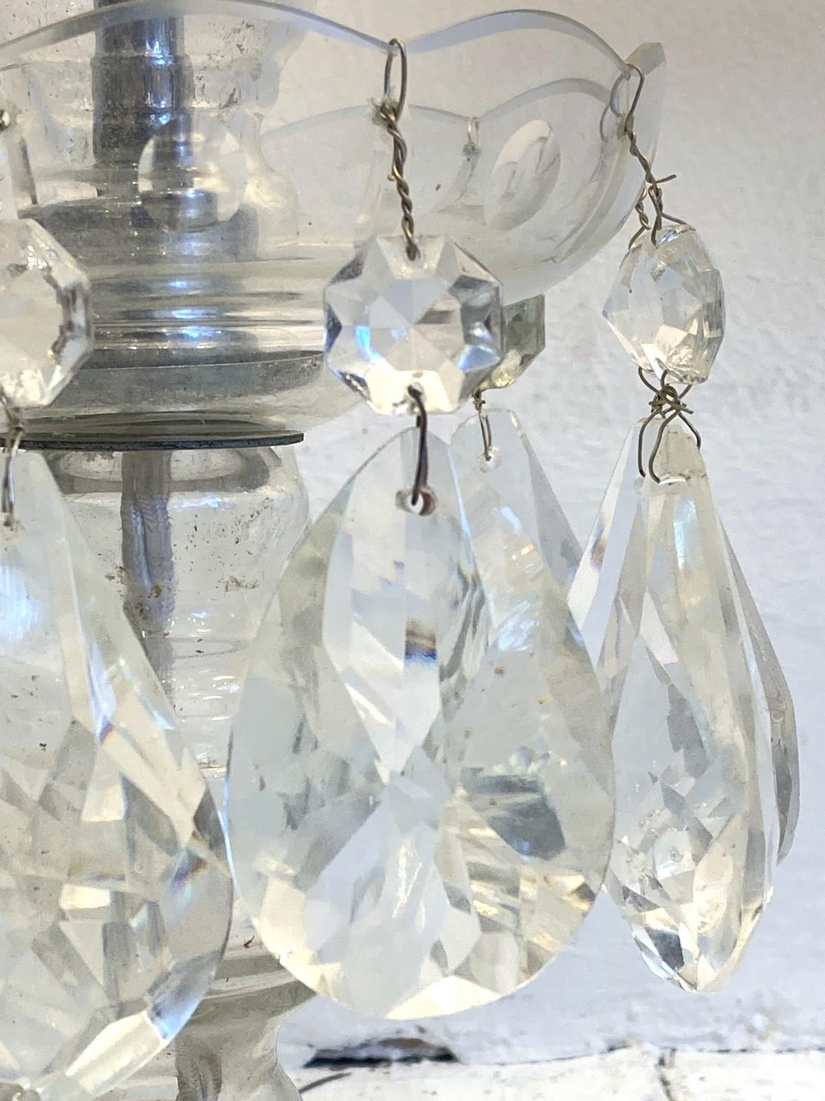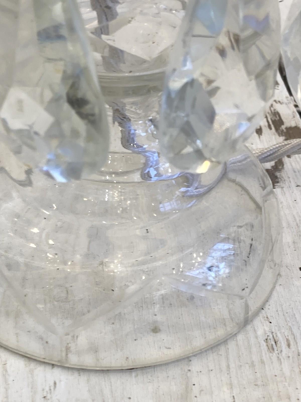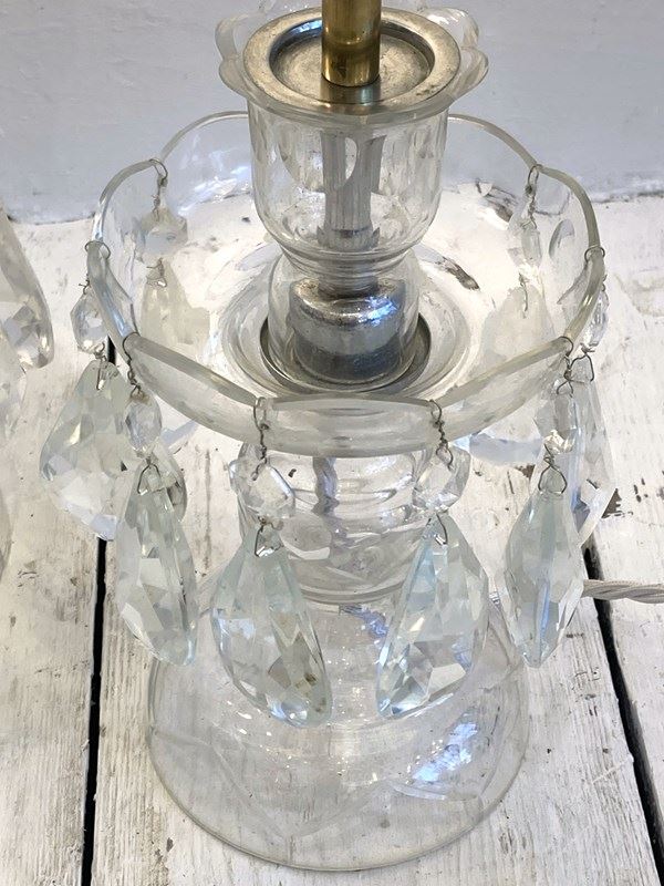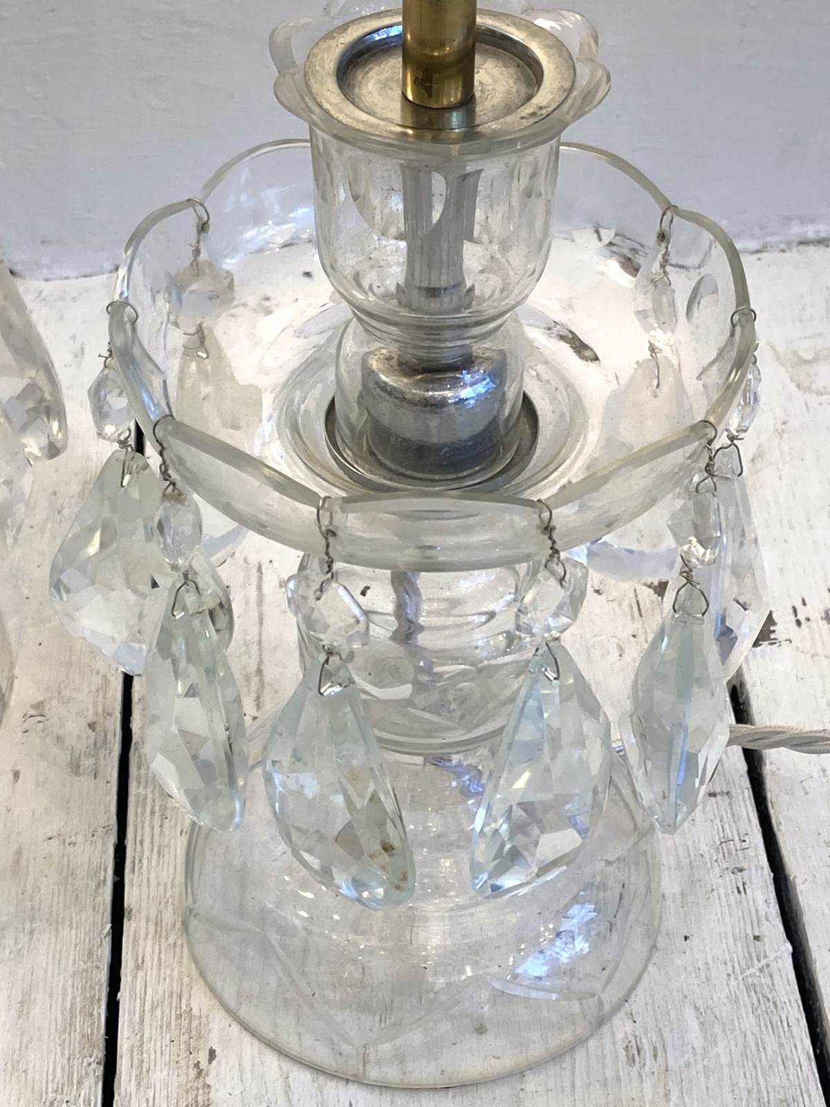 A sweet little pair of vintage glass table lamps with a cut glass inverted bell base and a glass cup with ogee ground decoration dressed with vintage crystal pear-shaped drops. Elegant and glamorous.