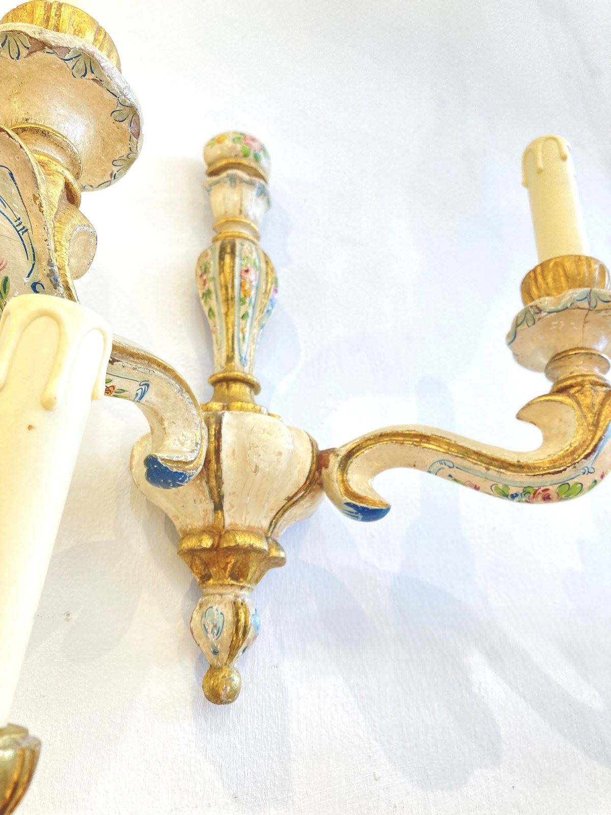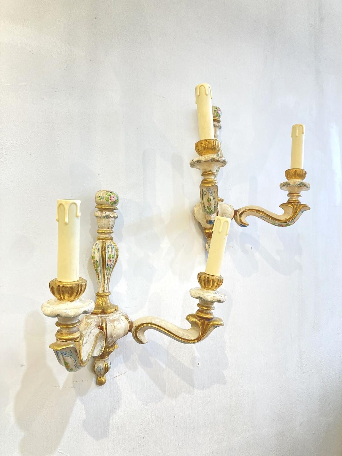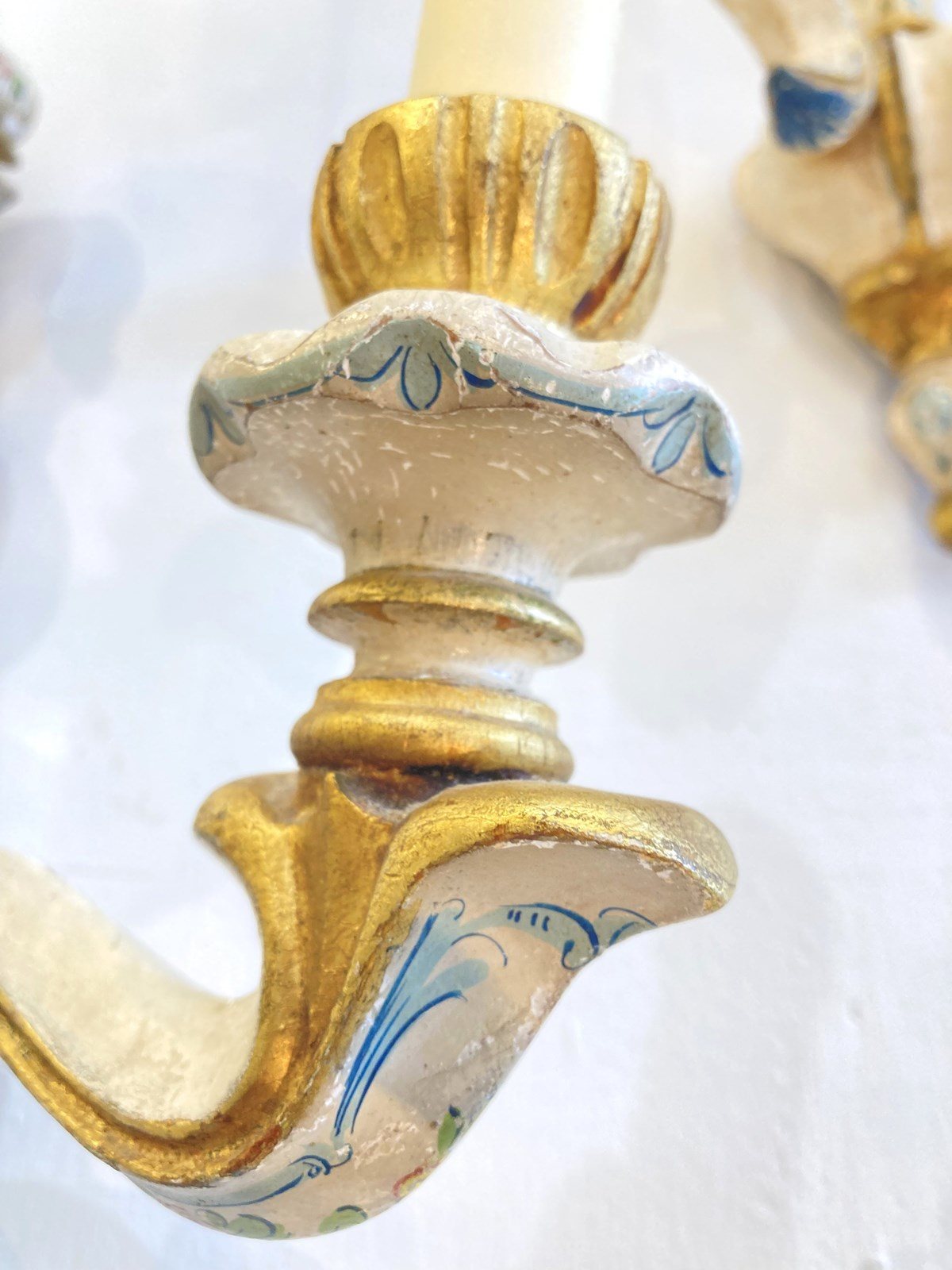 These very pretty vintage wall lights are carved and then handpainted with darling little flowers against a white and gilt background. The paint has worn beautifully, creating a soft & & romantic look.
