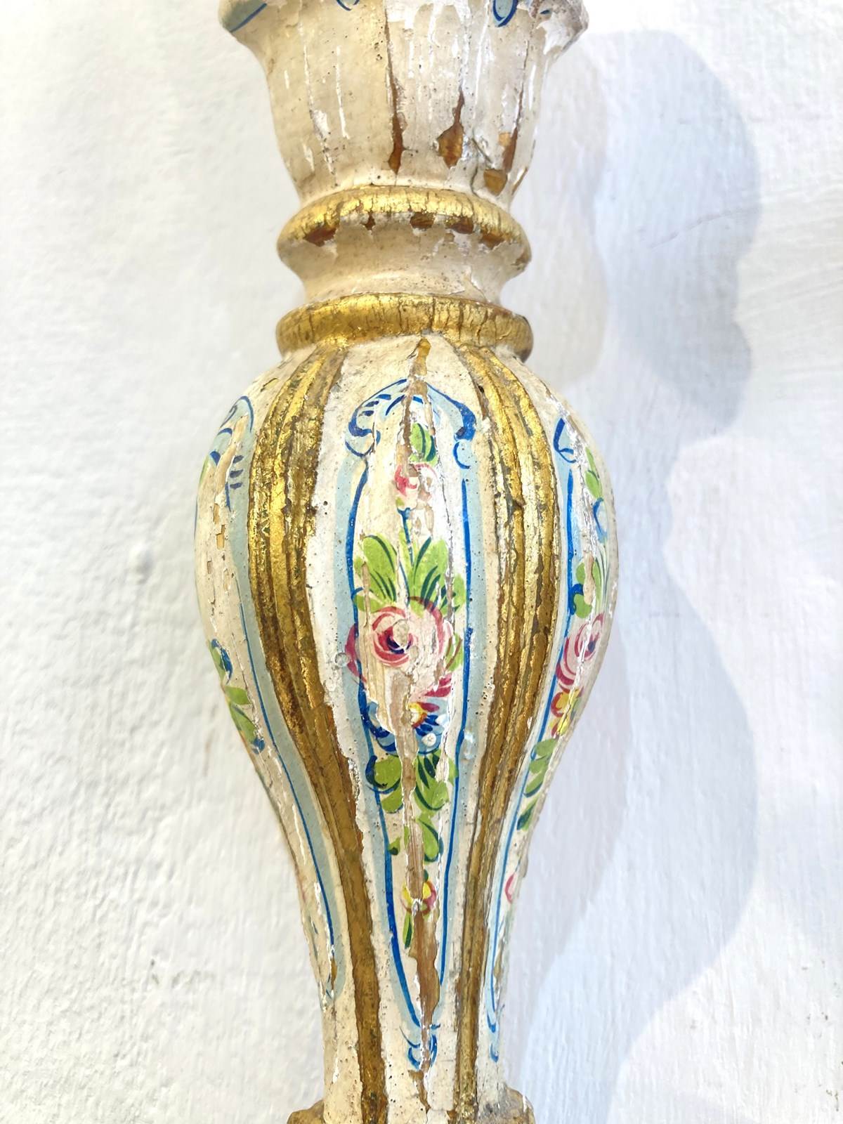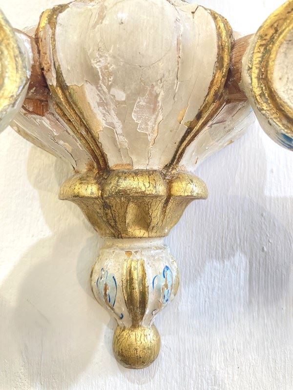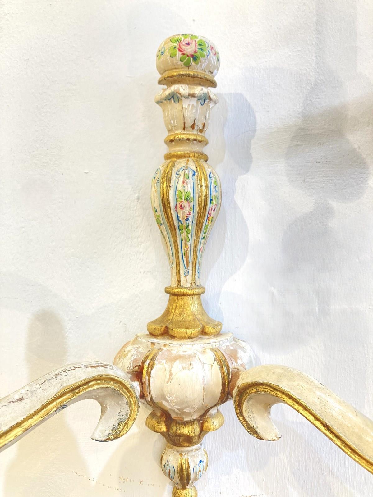 These very pretty vintage wall lights are carved and then handpainted with darling little flowers against a white and gilt background. The paint has worn beautifully, creating a soft & & romantic look.