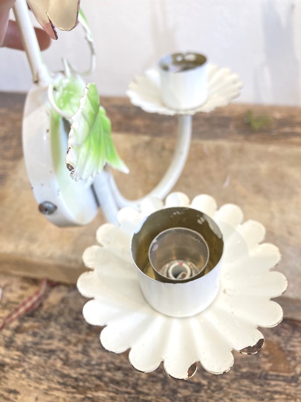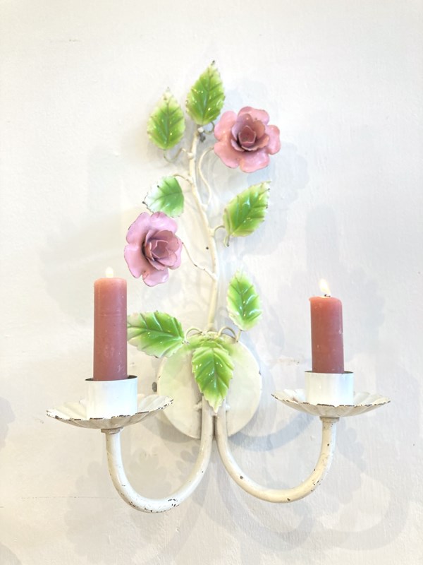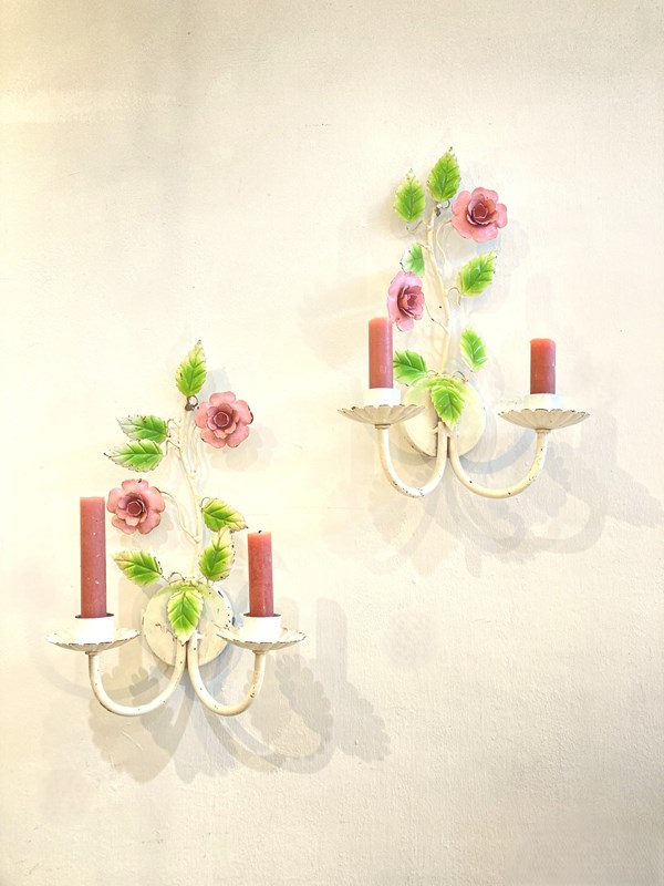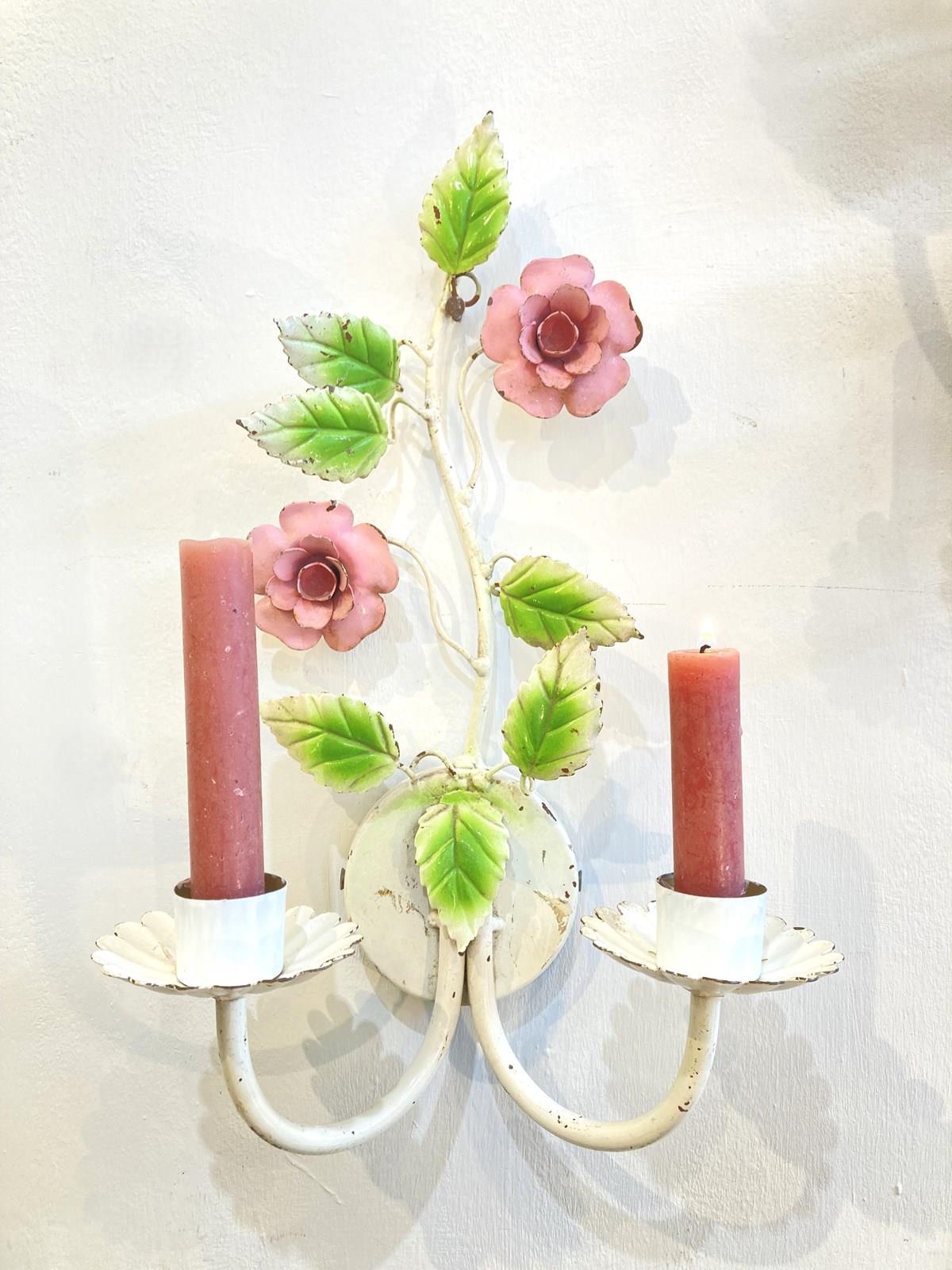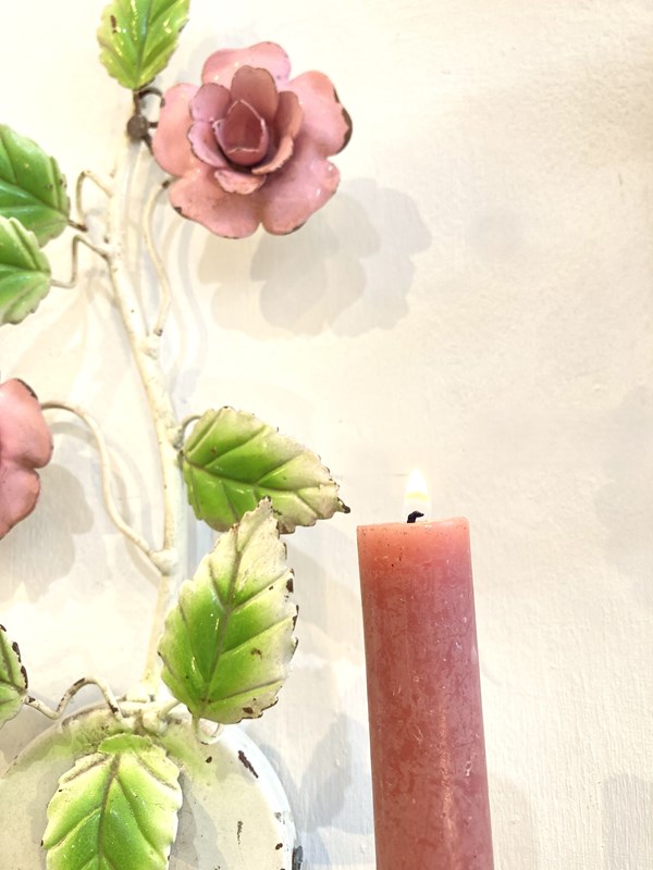 Such a pretty pair of vintage toleware candle sconces. These would have originally been wired for electricity and could be converted back if required but there's something so lovely about candle sconces! Each has two arms and is decorated with pink flowers and green leaves.