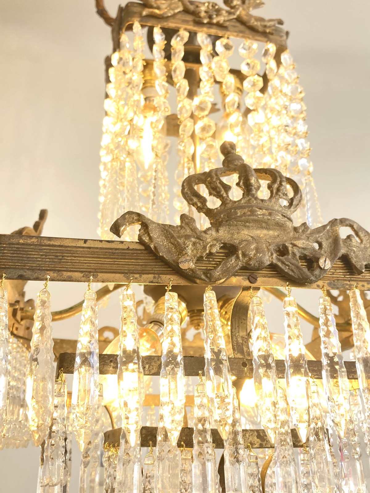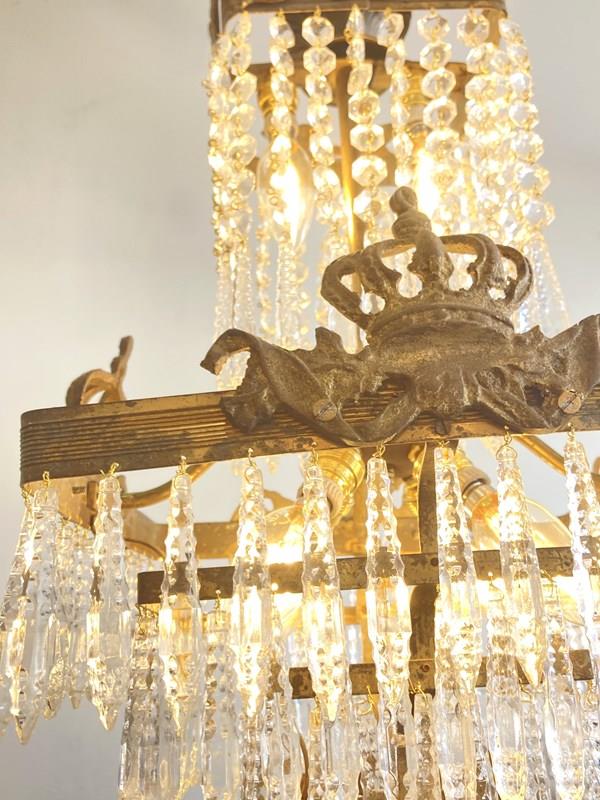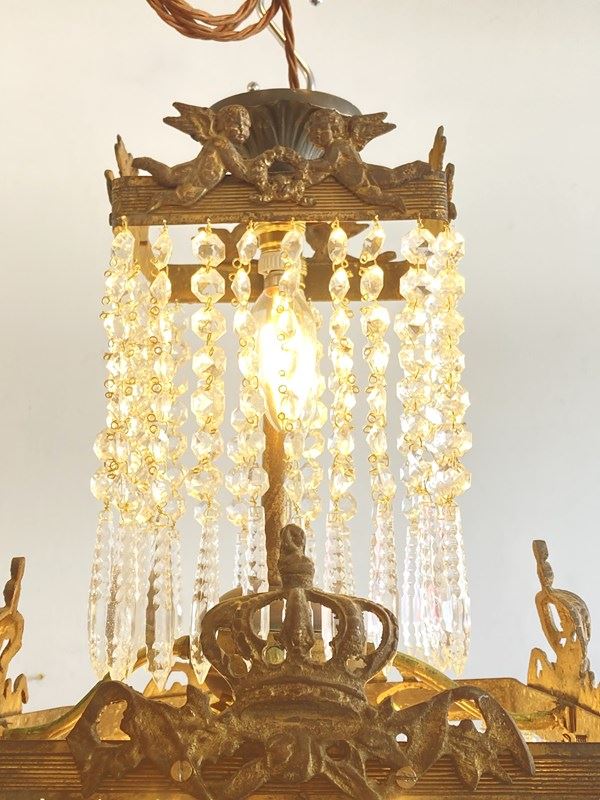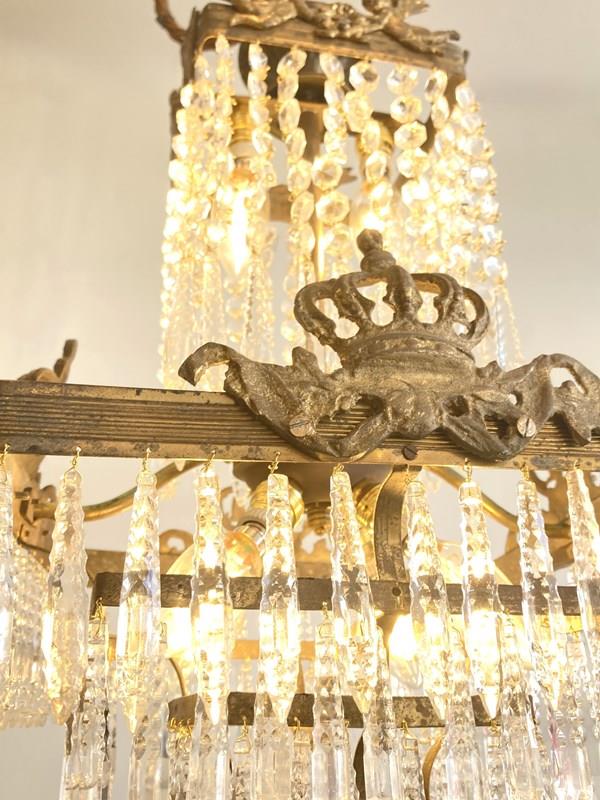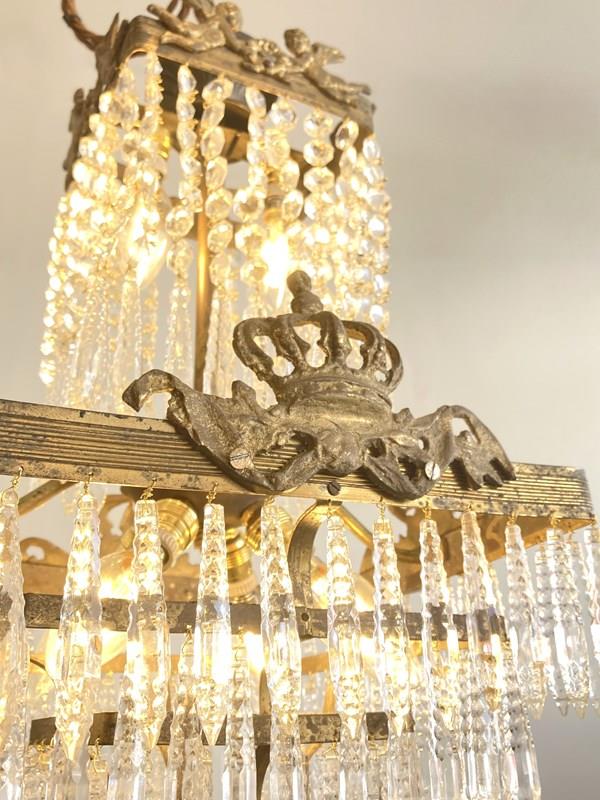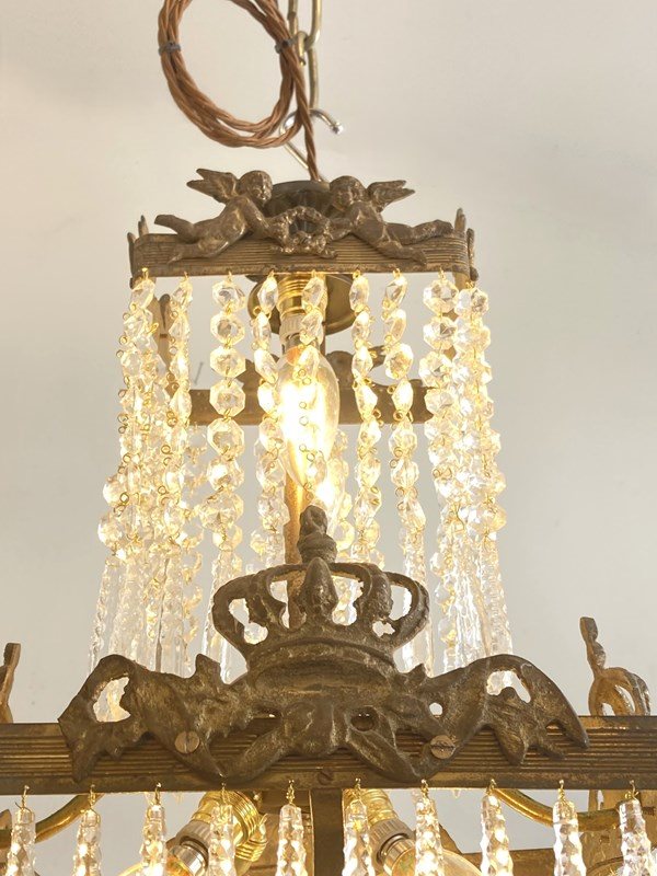 A rare and striking antique chandelier c.1900-1910 - this is unusual for a number of reasons. Firstly it has a good amount of age as it dates from the very early part of the 1900's. The shape is unusual - we find it very hard to get hold of square chandeliers and in the right place they are absolutely stunning; the shape of this is enhanced by the two tiers. Finally the cast decoration is rather rare - on the top tier, each side is decorated with putti or cherubs (which is quite a common decorative theme for chandeliers) but the bottom, larger tier boasts the most wonderful crowns on all four sides which is a motif that we've never seen on a light before. Grand, opulant and full of character!