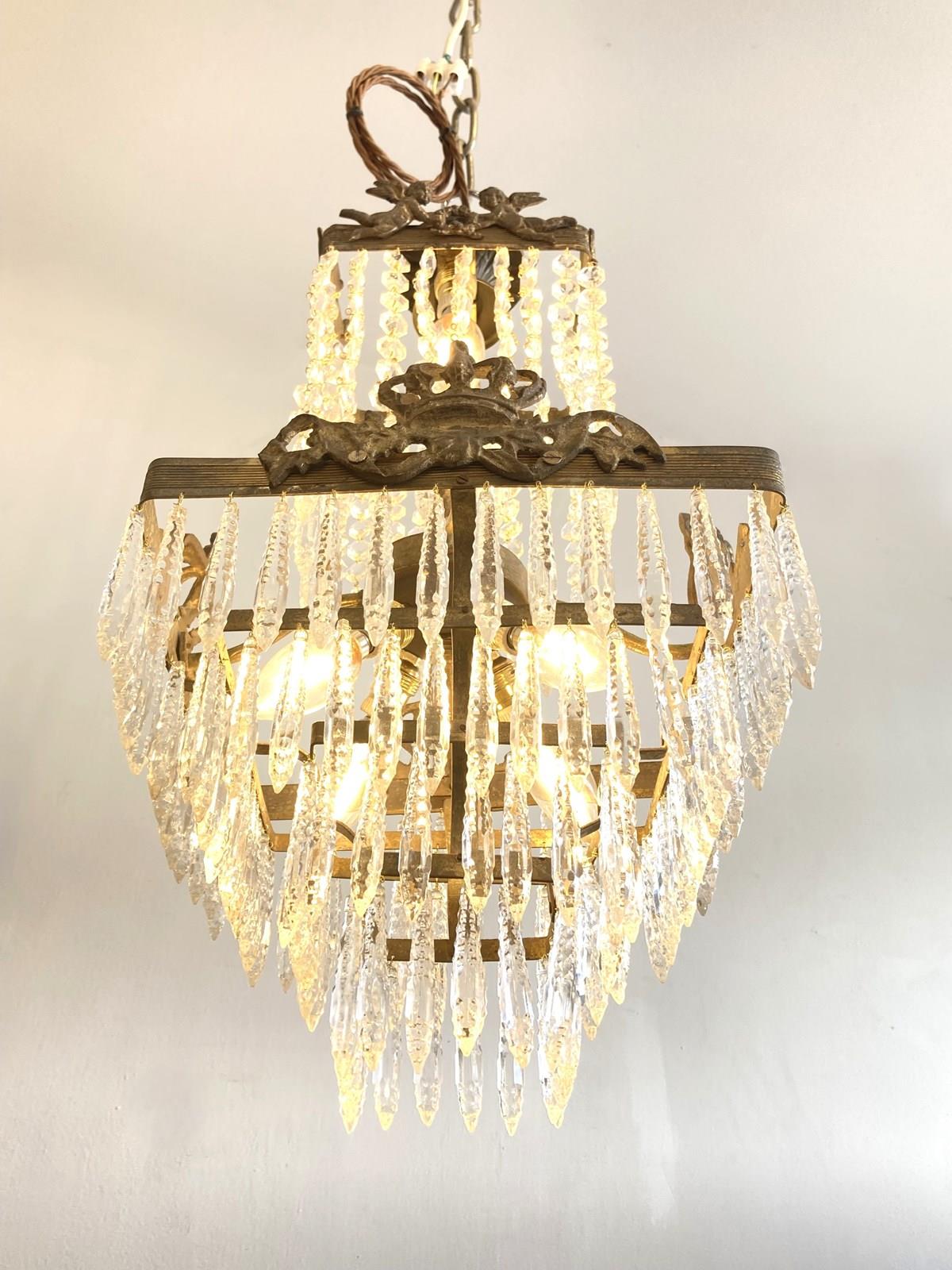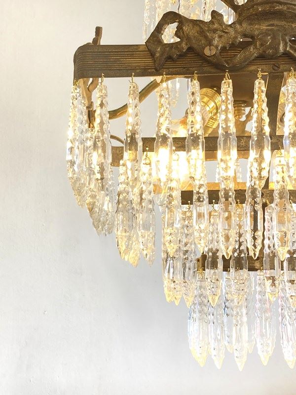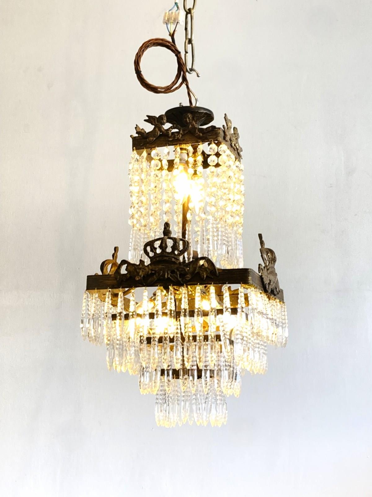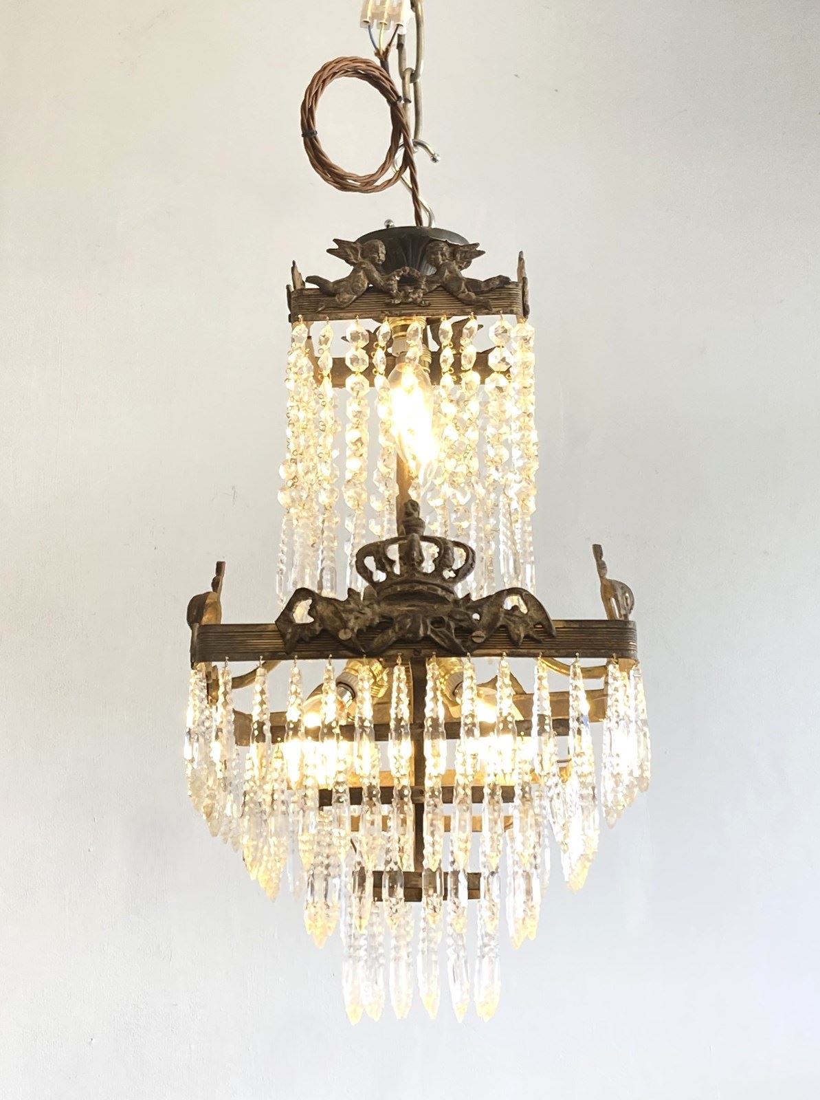 A rare and striking antique chandelier c.1900-1910 - this is unusual for a number of reasons. Firstly it has a good amount of age as it dates from the very early part of the 1900's. The shape is unusual - we find it very hard to get hold of square chandeliers and in the right place they are absolutely stunning; the shape of this is enhanced by the two tiers. Finally the cast decoration is rather rare - on the top tier, each side is decorated with putti or cherubs (which is quite a common decorative theme for chandeliers) but the bottom, larger tier boasts the most wonderful crowns on all four sides which is a motif that we've never seen on a light before. Grand, opulant and full of character!
